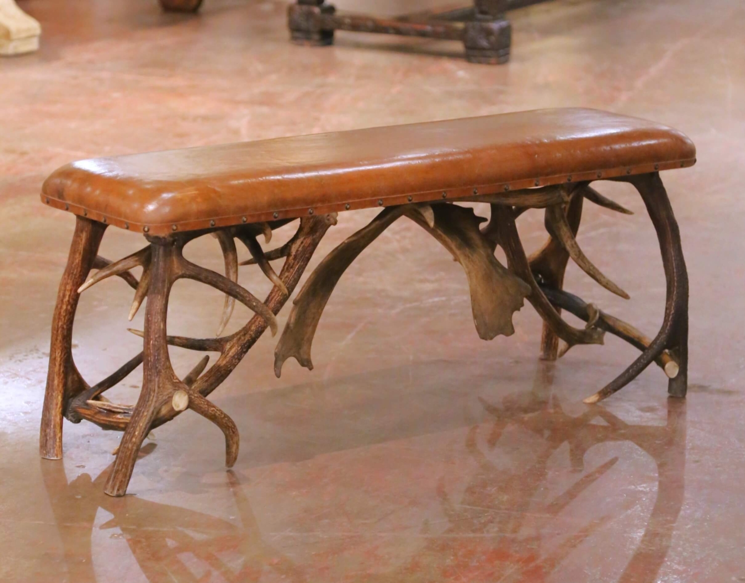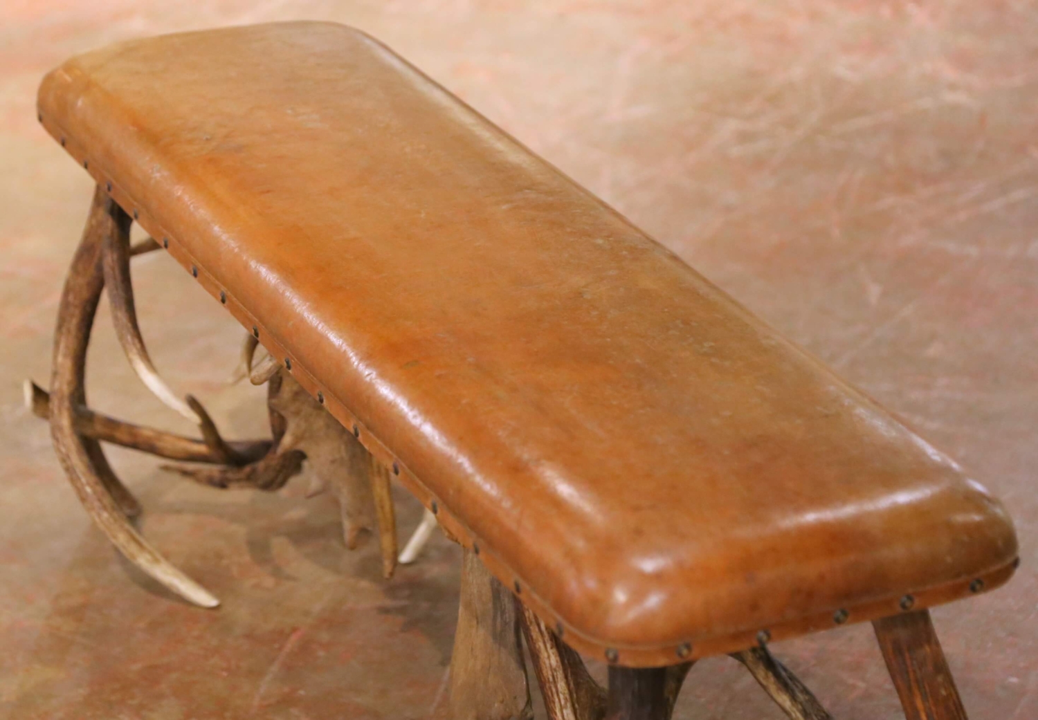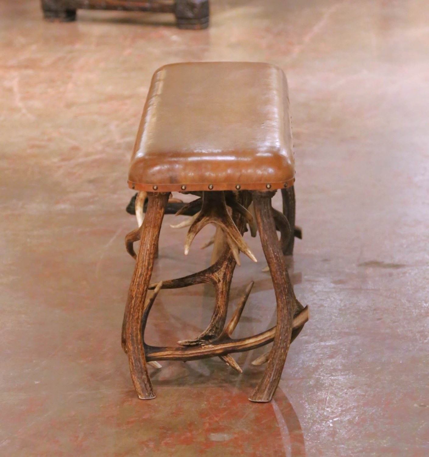 Early 20th Century Austrian Black Forest Antler Bench with Leather Seat