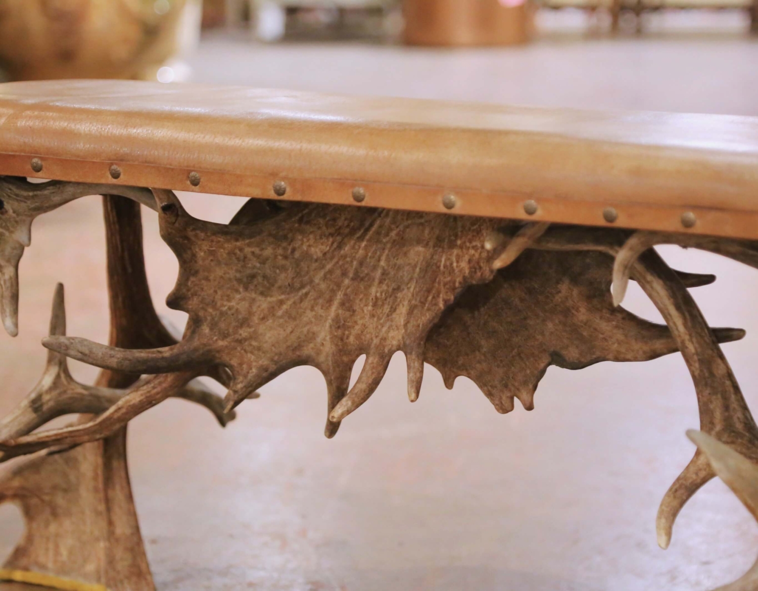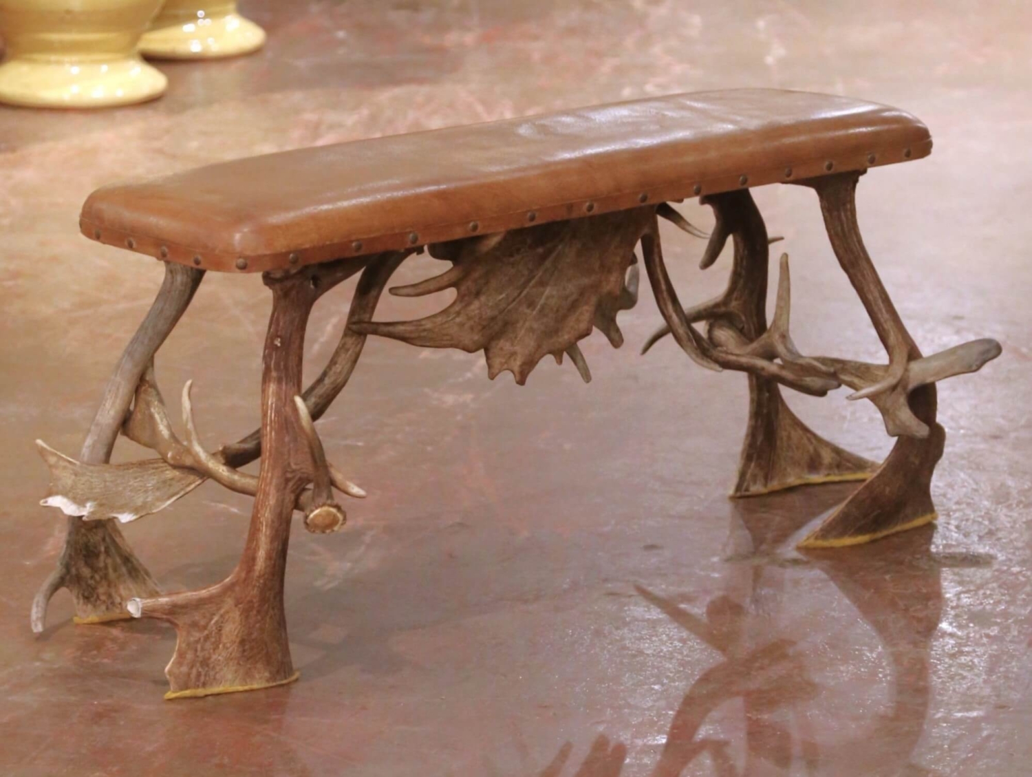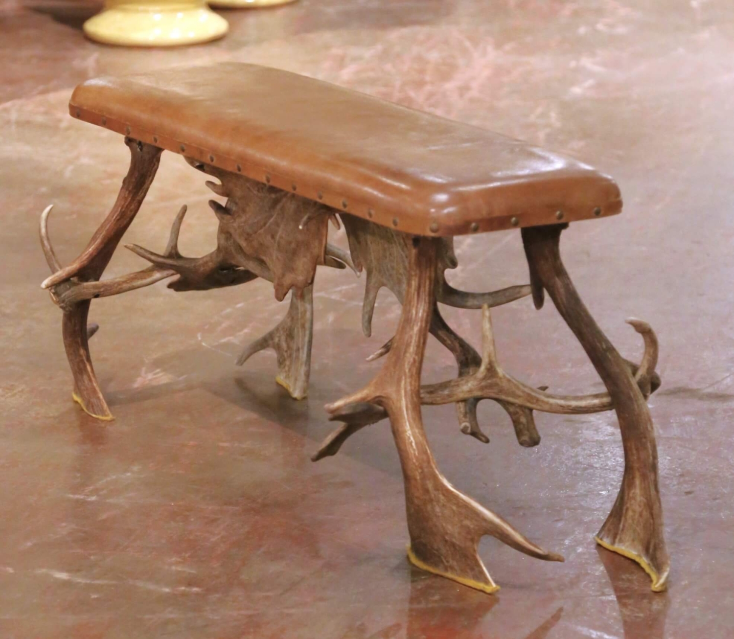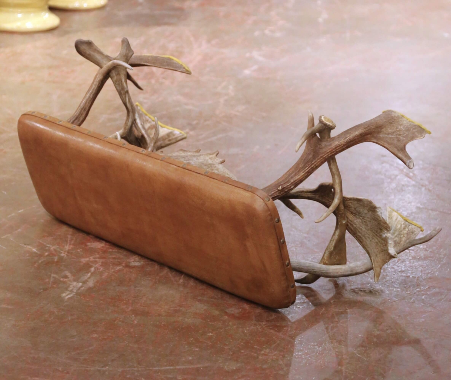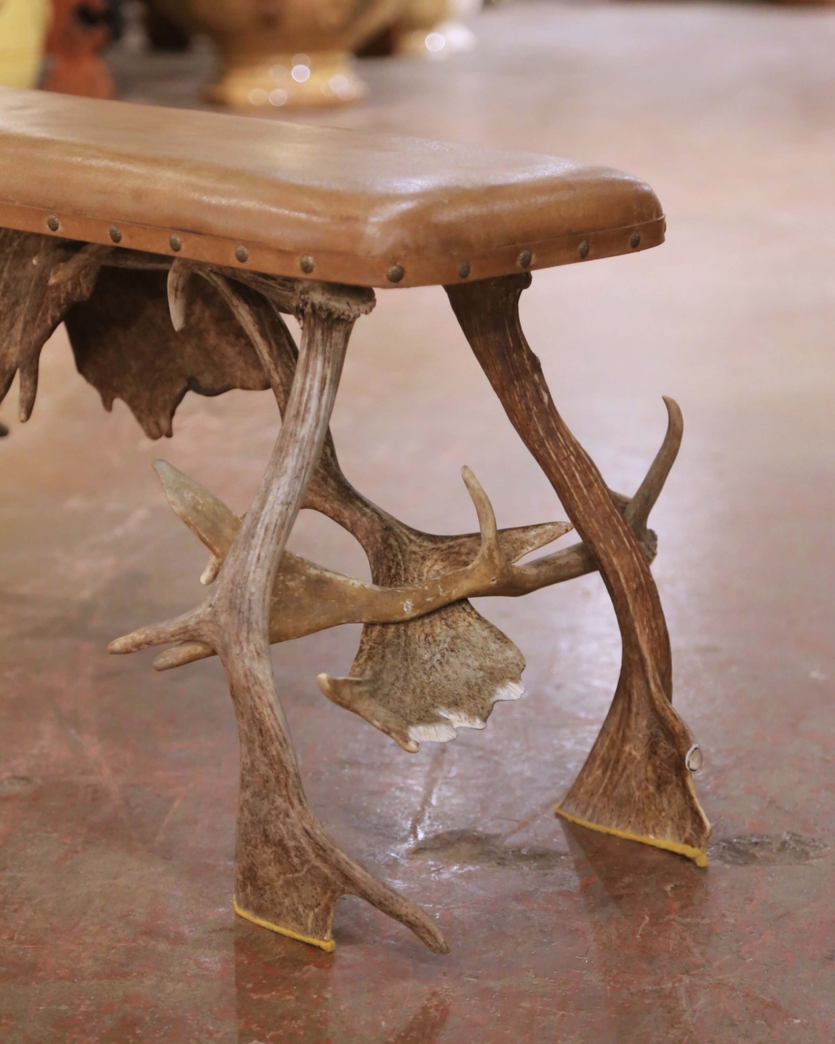 Early 20th Century Austrian Black Forest Antler Bench with Leather Seat