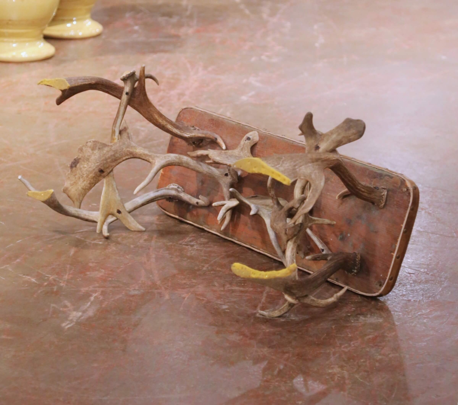 This striking antique Alpine bench was crafted in the Black Forest tradition, likely in Austria’s Tyrolean region, circa 1930–1950. Sculptural and highly expressive, the bench is constructed from naturally shed deer antlers, expertly hand-assembled into a dramatic yet structurally sound base formed by intertwined tines and organic curves. The composition reflects the refined rustic craftsmanship associated with Austro-German hunting lodge furnishings, where functional seating was elevated to sculptural form. The rectangular seat is upholstered in richly patinated brown leather, secured with original decorative nailhead trim along the perimeter. The leather surface displays surface scuffs, gentle wear, and natural variations consistent with age and use, contributing warmth, depth, and an authentic antique character. The antler base exhibits beautiful tonal variation and honest aging, with a well-preserved surface that enhances the bench’s sculptural presence without compromising stability. Originally intended for Alpine chalets and mountain lodges, this antique antler bench offers both practical seating and strong decorative impact. It is ideally suited for placement at the foot of a bed, in an entry hall, or as an accent piece within a curated rustic, lodge-style, or European country interior. The bench is in excellent condition commensurate with age and use. Dimensions: 43.75″W x 18.5″D x 17.5″H