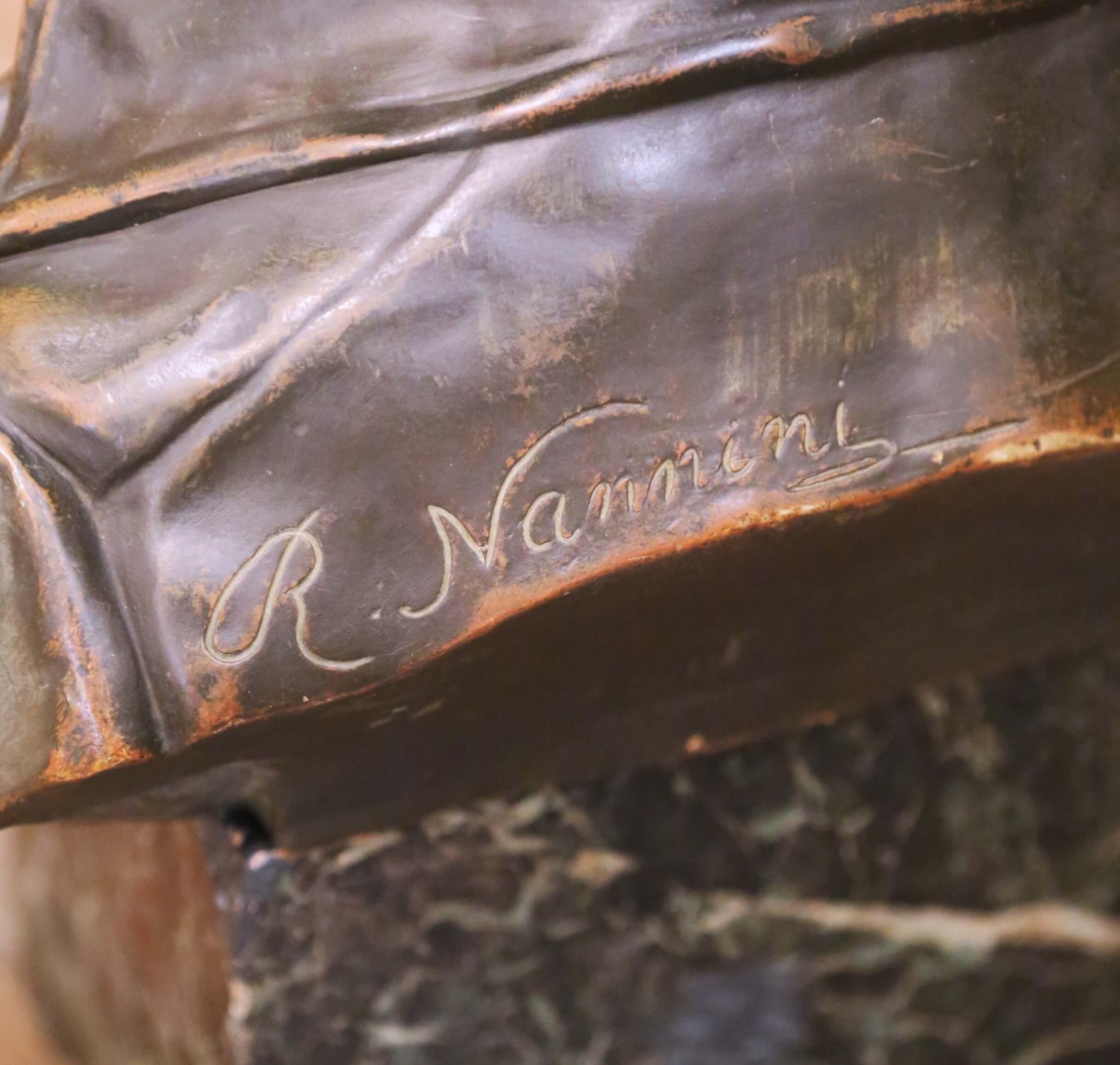 This distinguished antique 57 pound bronze bust portrays Napoleon Bonaparte (1769–1821), the renowned French military leader and emperor who dominated much of Europe in the early 19th century. Depicted wearing his iconic bicorne hat and military coat, Napoleon is rendered with solemn authority and introspective restraint, reflecting the academic realism favored in late 19th-century historical sculpture. Executed in bronze and signed on the reverse Raphael Nannini, the bust exemplifies Nannini’s refined approach to portraiture and historical subjects. Active in the late 19th century, Nannini was known for his disciplined modeling, attention to anatomical accuracy, and ability to convey character through subtle expression rather than overt dramatization. His work aligns with the Italian realist and Neoclassical traditions that remained influential during this period. The sculpture bears a fully engraved presentation inscription reading: “A.C. Penn / From the New York Salesmen / January Thirty-First Nineteen Thirteen.” Such inscriptions indicate a bespoke commemorative or testimonial object, likely commissioned as a professional or corporate tribute. While the dedication is dated 1913, the sculpture itself reflects late 19th-century artistic conventions and was likely conceived or cast shortly before the turn of the century, consistent with Nannini’s active period. The bronze retains a rich, time-softened brown patina with natural highlights along the hat brim, collar, and coat folds, consistent with age and use. The bust is mounted on a veined marble base, which is not original, but is period-appropriate in character and provides strong architectural presence. A refined and historically resonant antique sculpture, this bust would make a commanding statement in a library, study, office, or collection focused on Napoleonic history or late 19th-century European bronze portraiture. Dimensions: 14″W x 8.5″D x 19″H (including base) Weight: 57 pounds