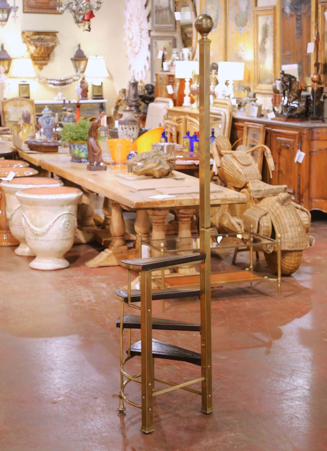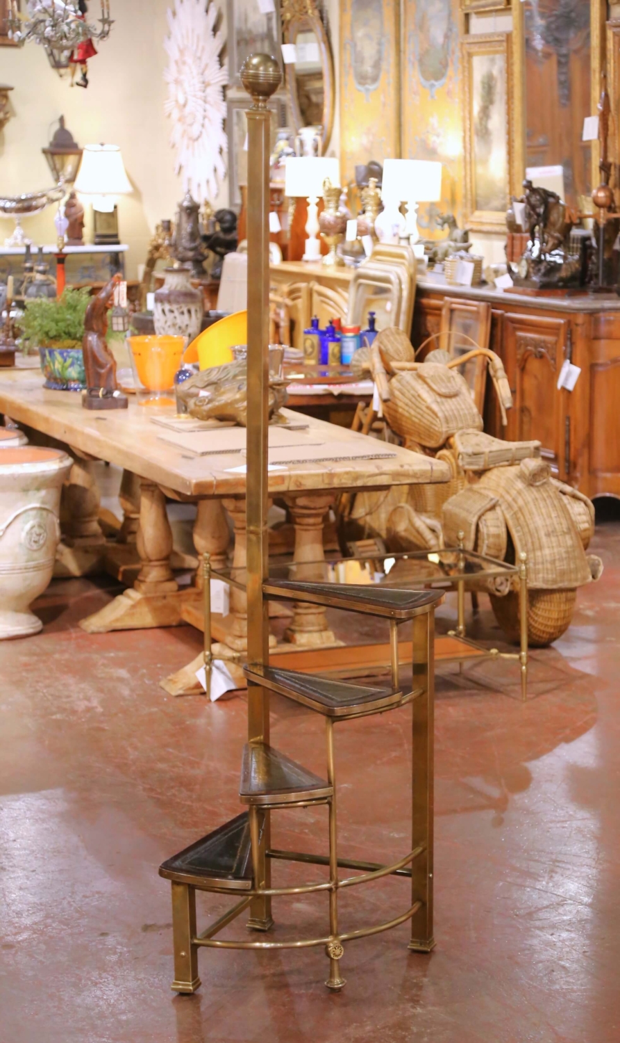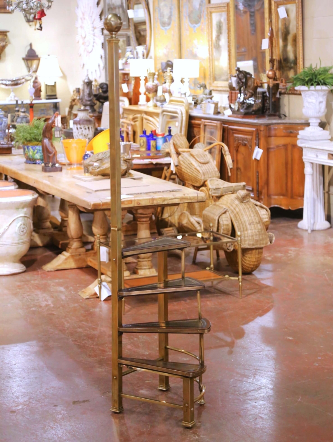 This elegant antique English four-step library staircase was crafted in the early 20th century and reflects the refined Edwardian interpretation of Neoclassical design. Intended for use in a gentleman’s study or library, the piece combines architectural clarity with rich materials, offering both practical function and decorative presence. The frame is constructed in solid brass with square-section uprights and a gracefully curved rear support rail, giving the silhouette balance and stability. The tall vertical standard is crowned with a spherical finial, a classical detail that reinforces its Edwardian character. The brass retains a warm, timeworn patina with light surface wear consistent with age and use. Each of the four shaped steps is inset with dark green leather panels framed in mahogany borders. The leather treads are decorated with gilt-tooled edging, a traditional feature found on fine English library furniture of the period. The stepped configuration wraps elegantly around the upright, creating a sculptural profile while maintaining sturdy construction. Both functional and highly decorative, this antique English library staircase is ideal for a study, wine library, dressing room, or as an architectural accent in a layered interior. A few dents in the brass. See detailed images. Dimensions: 25.5”W x 18.5”D x 77”H