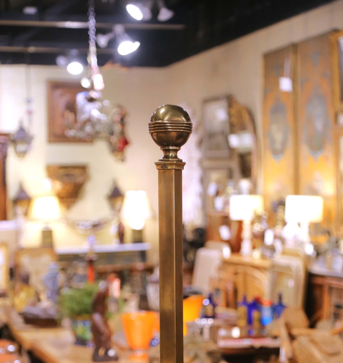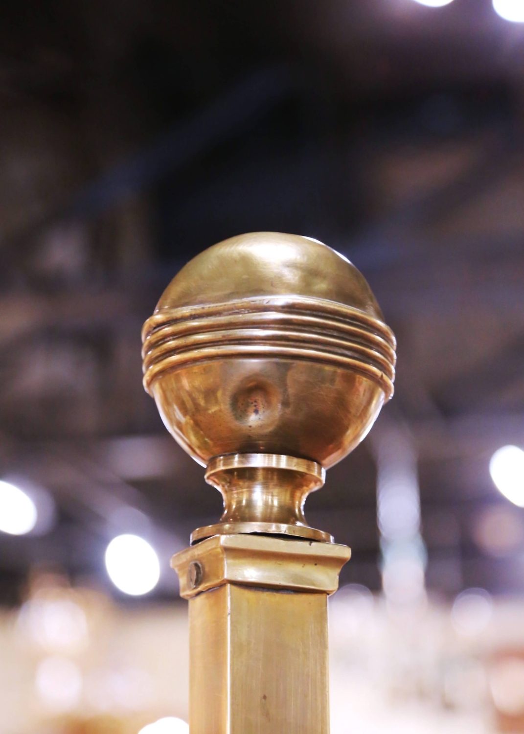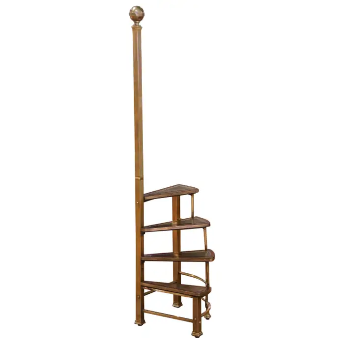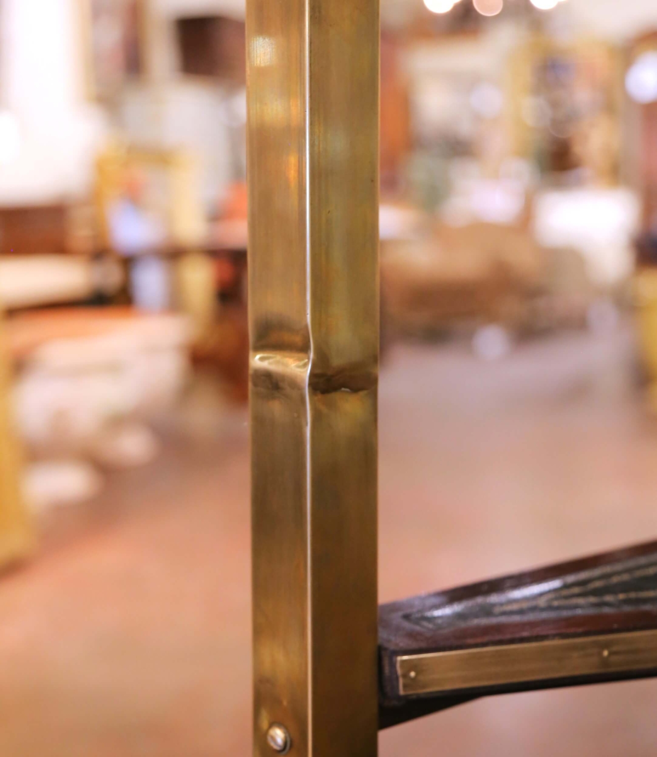 This elegant antique English four-step library staircase was crafted in the early 20th century and reflects the refined Edwardian interpretation of Neoclassical design. Intended for use in a gentleman’s study or library, the piece combines architectural clarity with rich materials, offering both practical function and decorative presence. The frame is constructed in solid brass with square-section uprights and a gracefully curved rear support rail, giving the silhouette balance and stability. The tall vertical standard is crowned with a spherical finial, a classical detail that reinforces its Edwardian character. The brass retains a warm, timeworn patina with light surface wear consistent with age and use. Each of the four shaped steps is inset with dark green leather panels framed in mahogany borders. The leather treads are decorated with gilt-tooled edging, a traditional feature found on fine English library furniture of the period. The stepped configuration wraps elegantly around the upright, creating a sculptural profile while maintaining sturdy construction. Both functional and highly decorative, this antique English library staircase is ideal for a study, wine library, dressing room, or as an architectural accent in a layered interior. A few dents in the brass. See detailed images. Dimensions: 25.5”W x 18.5”D x 77”H