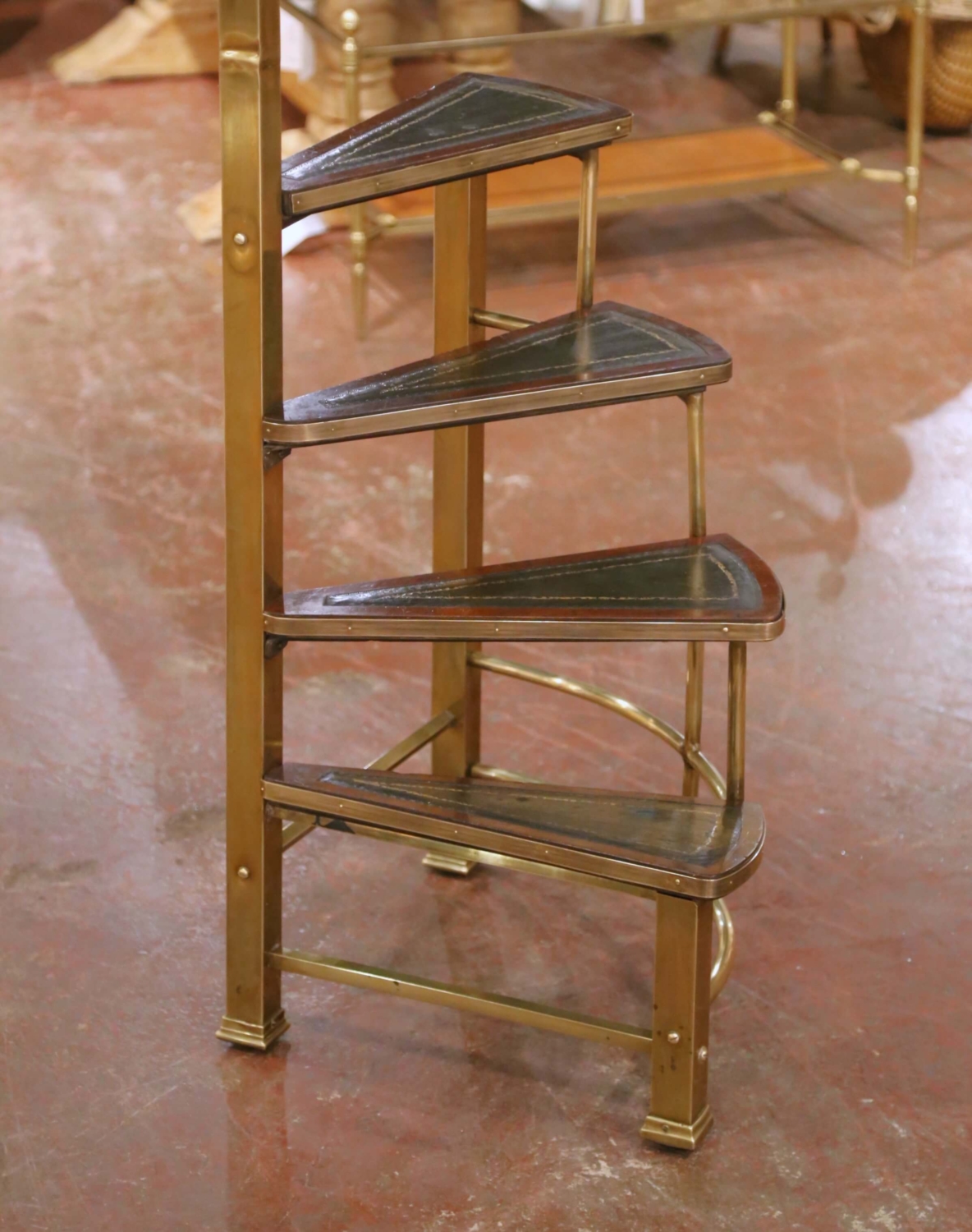 Early 20th Century English Edwardian Four-Step Brass and Leather Library Steps