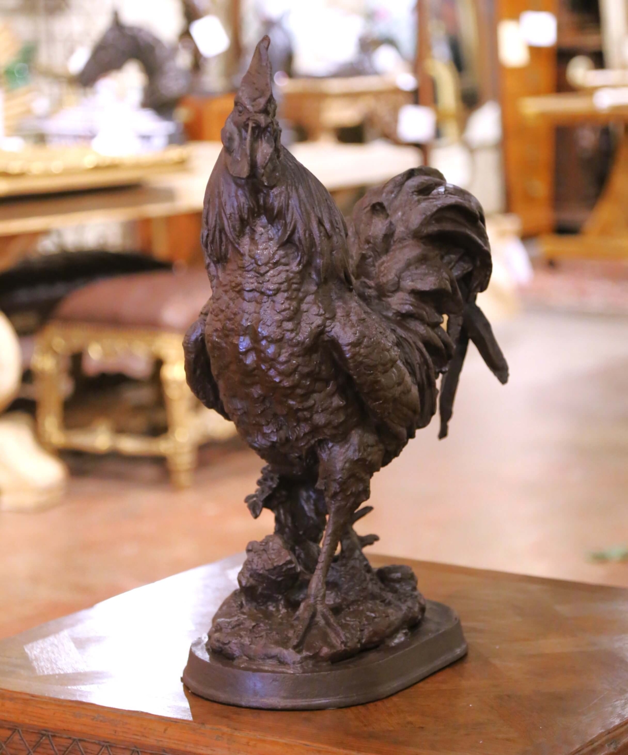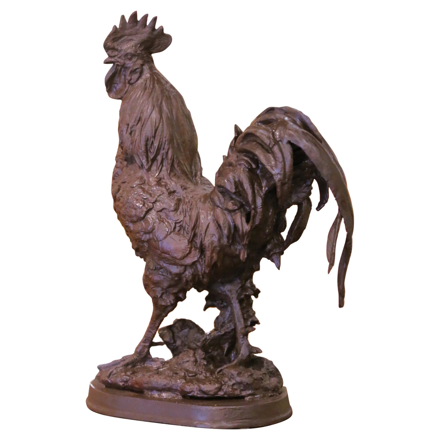 Celebrate the proud emblem of France with this impressive early 20th-century cast-iron rooster sculpture, crafted in France circa 1920. This antique figure is rendered in a bold, heavily textured modeling style, giving the rooster outstanding presence and movement. Standing proudly atop a naturalistic rocky base, the bird displays richly layered feathers, a pronounced comb, expressive wattles, and sharply defined talons that elevate the sense of realism. The deeply sculpted tail feathers curve dramatically behind the body, adding height and sculptural drama. Cast in solid iron, the piece features a dark brown patinated surface with subtle variations that highlight the rugged texture of the form. The underside shows the expected open casting aperture typical of early French iron foundry work. Substantial in both scale and weight—approximately 67 pounds, this commanding avian figure makes a striking statement on a kitchen counter, console, entry table, or garden setting. Condition: Excellent condition commensurate with age and use, with a rich, even patinated finish throughout. Dimensions: 18″ W × 9″ D × 26″ H.