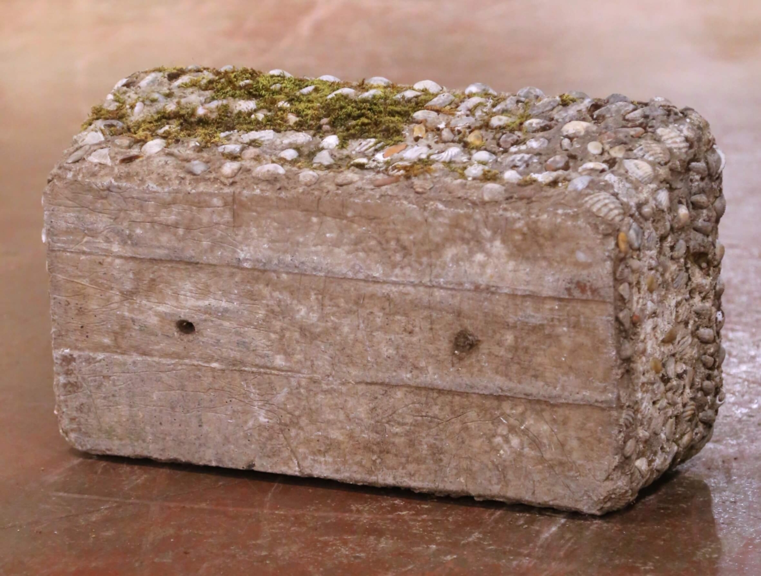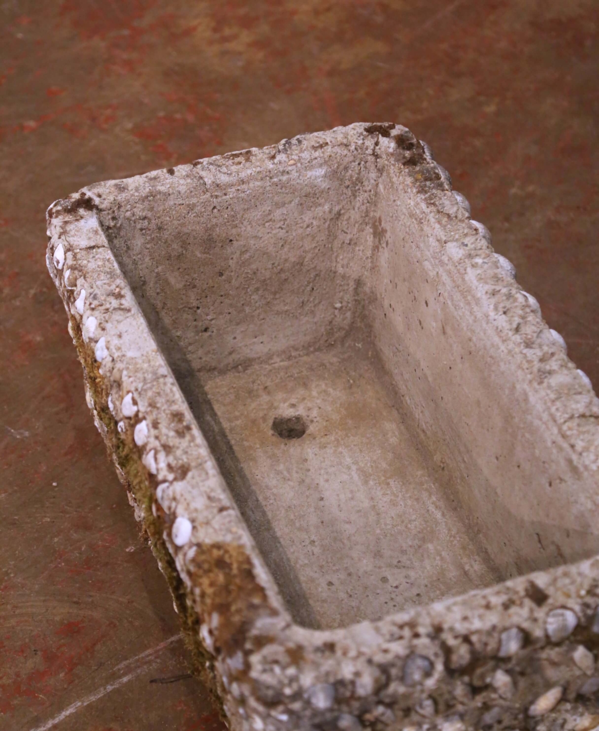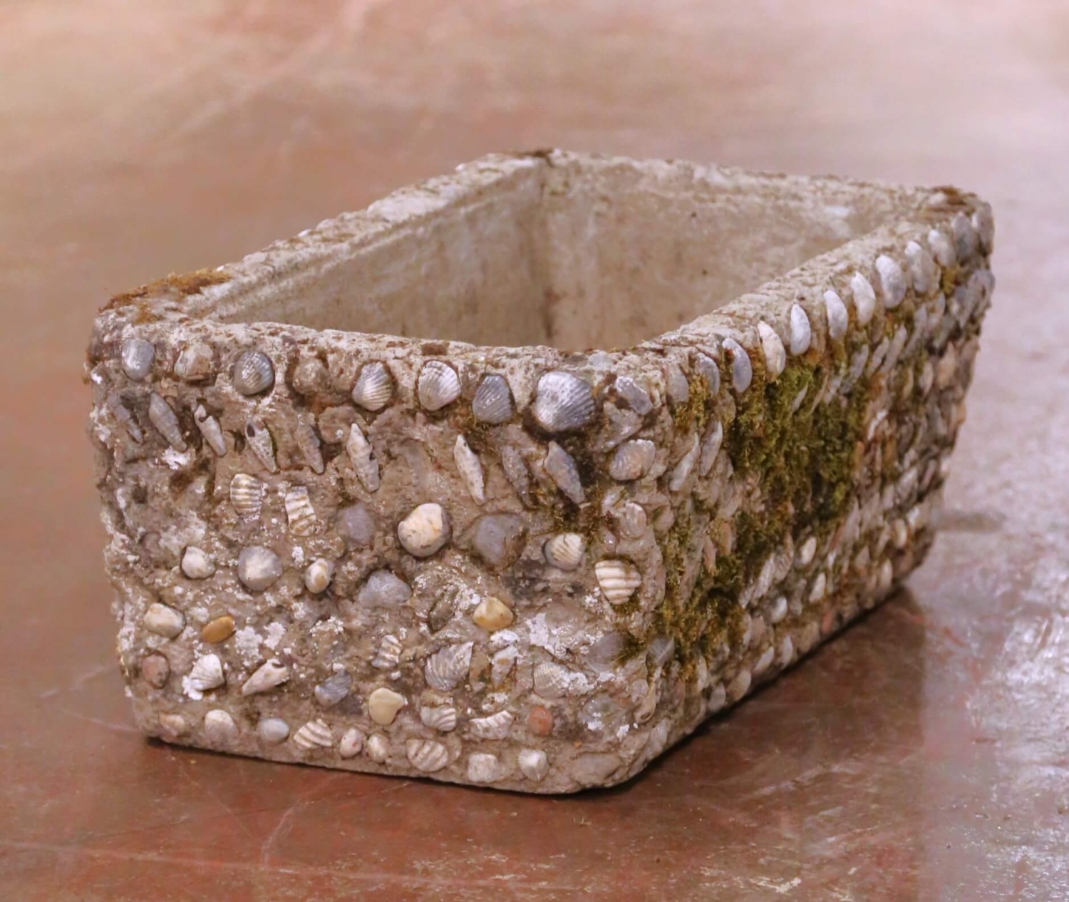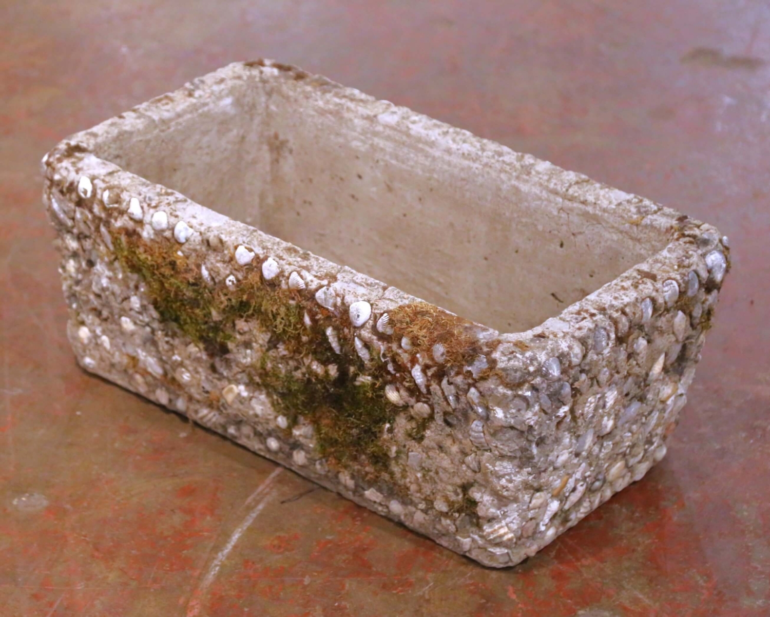 Bring authentic garden character to an interior or exterior setting with this distinctive antique cast stone planter, crafted in France circa 1880. Rectangular in form, the trough is richly embellished on all sides with an applied shell-encrusted surface, incorporating naturalistic shell and pebble motifs set into the stone, evoking the grotto-style decoration popular in French garden design of the late 19th century. The heavily textured exterior contrasts beautifully with the smooth, hand-finished interior basin, which features original drainage openings, making the jardiniere suitable for live plantings or decorative use. The stone surface displays a naturally weathered patina with areas of mossing and mineral variation, adding depth, age, and authentic outdoor character. This antique planter is in excellent condition commensurate with age and prolonged garden use. Ideal for use as a window box, terrace planter, conservatory accent, or as an architectural container indoors, this sculptural piece offers timeless French garden appeal and pairs beautifully with both classical and rustic settings. 24.5” W x 13.75” D x 9.5” H Weighs: 116 pounds