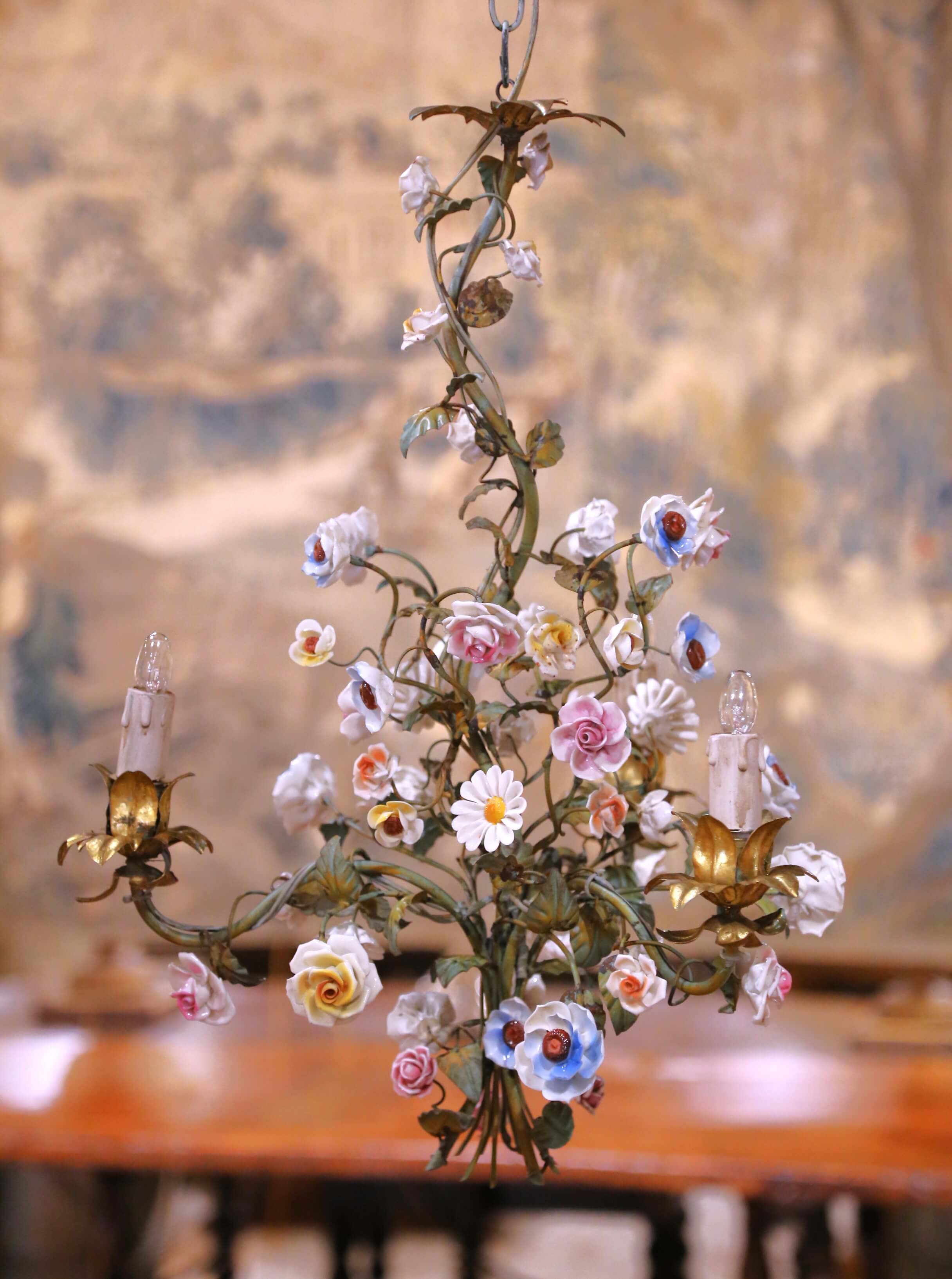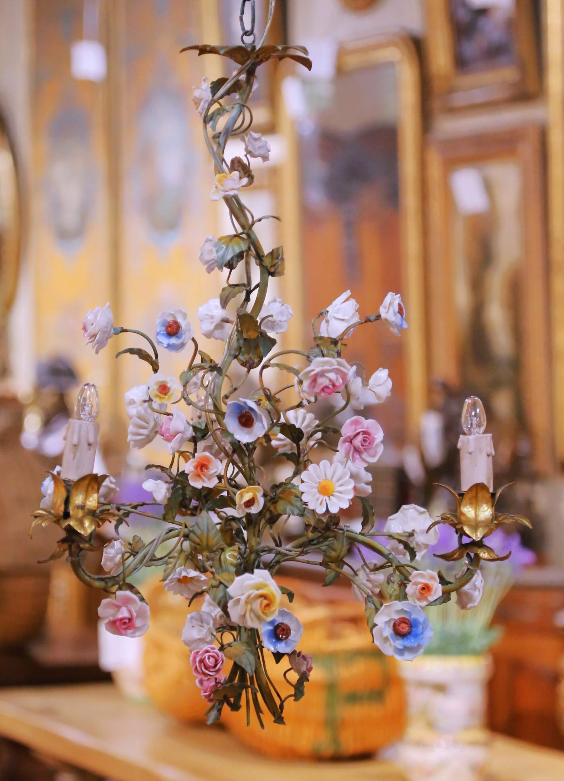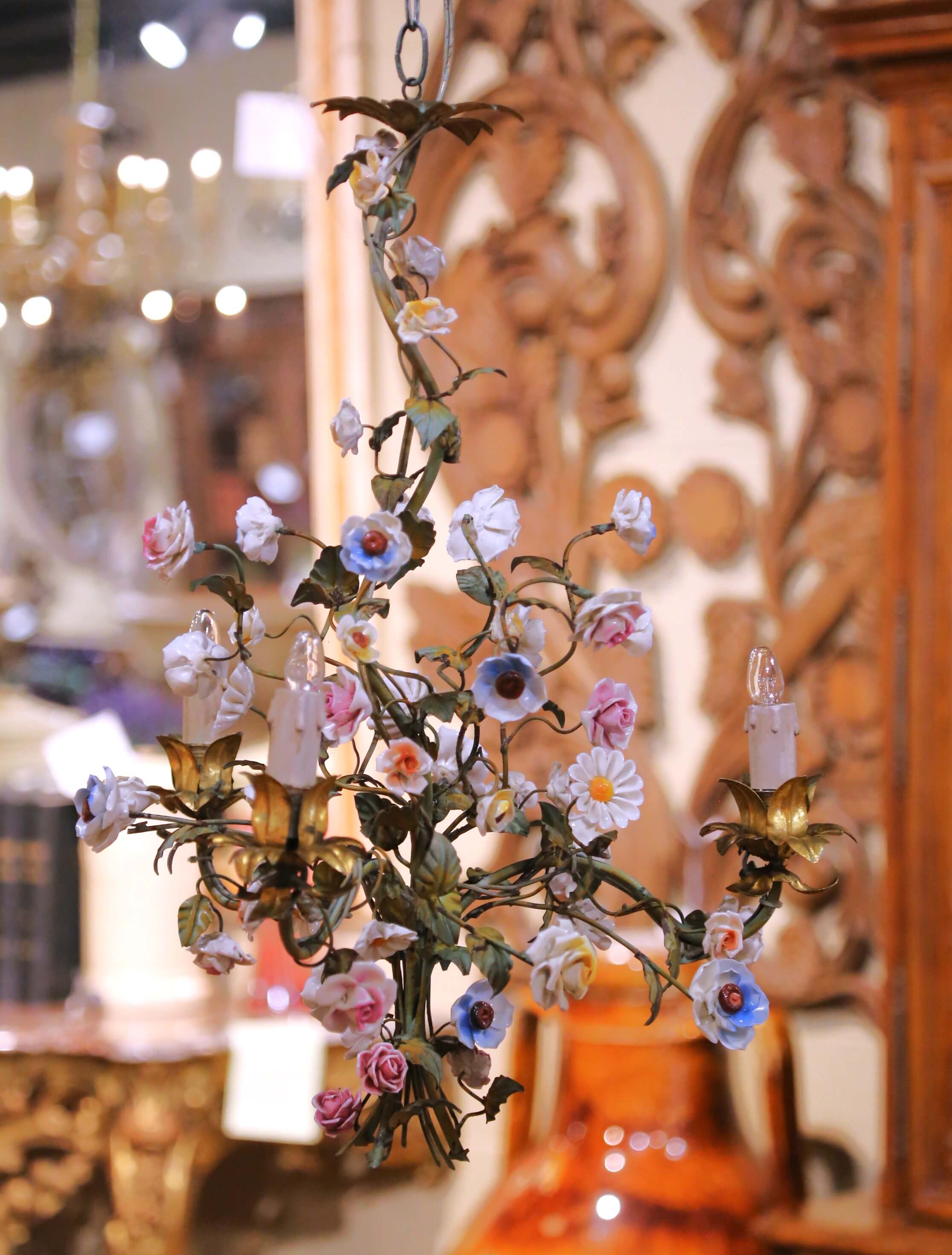 Place this elegant antique chandelier in a powder room, bedroom, or entry to bring a touch of whimsical French charm. Crafted in France circa 1920, the fixture is built around a hand-forged iron frame, intricately formed as twisting vines and scrolling branches. The structure is richly adorned with hand-applied porcelain flowers, including roses, daisies, and blossoms in soft pastel hues, creating a lively and romantic garden motif. The floral elements are complemented by painted metal leaves with a naturally aged patinated finish, enhancing the organic composition.