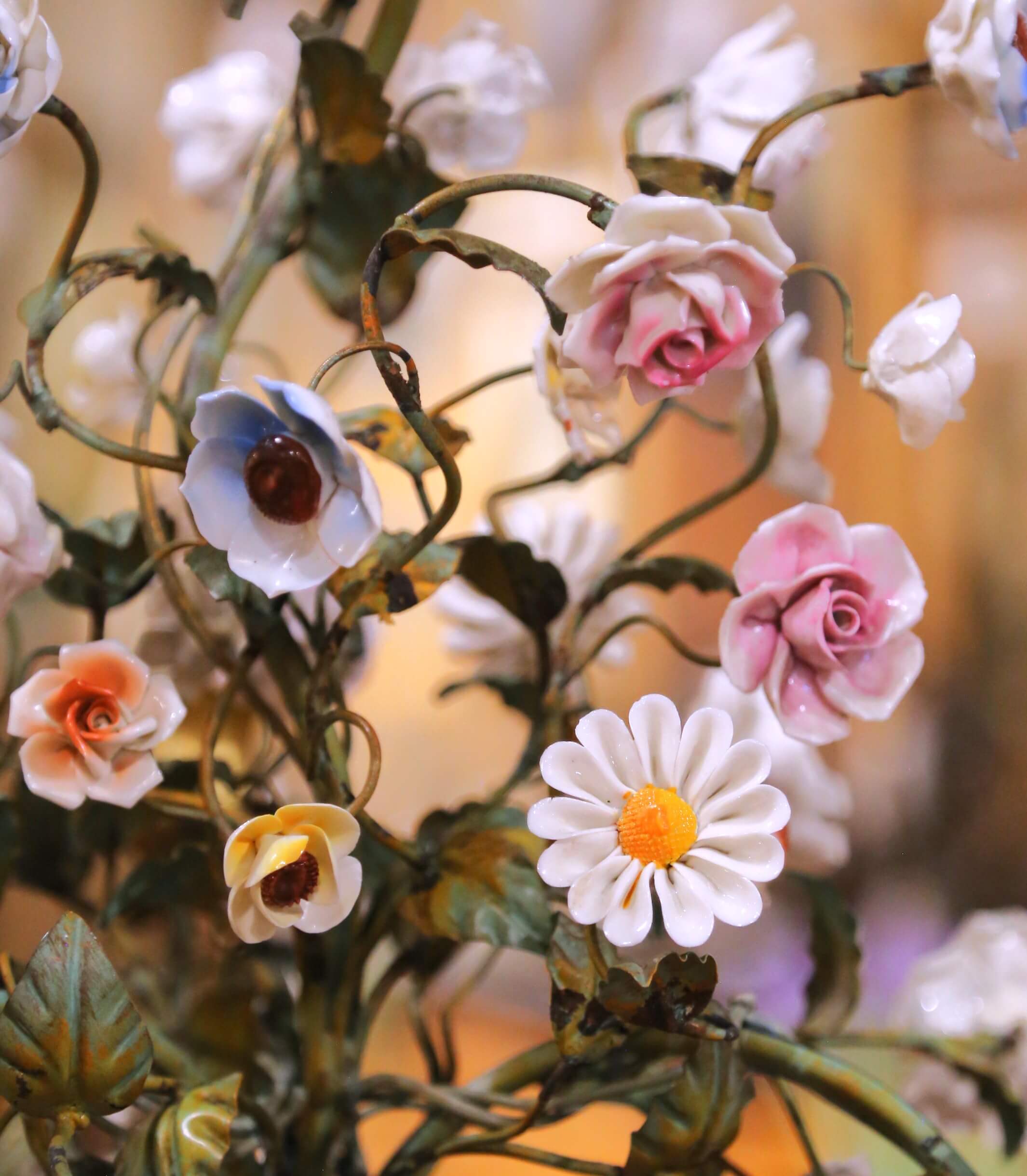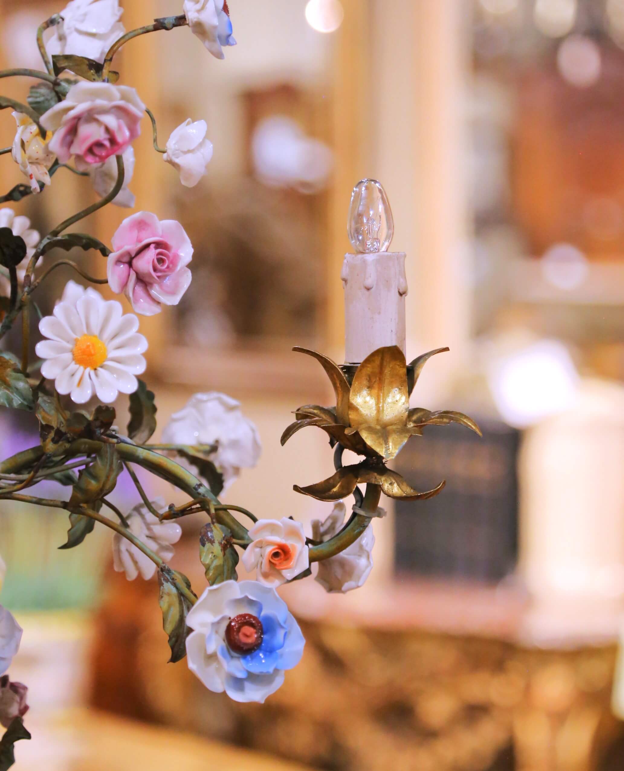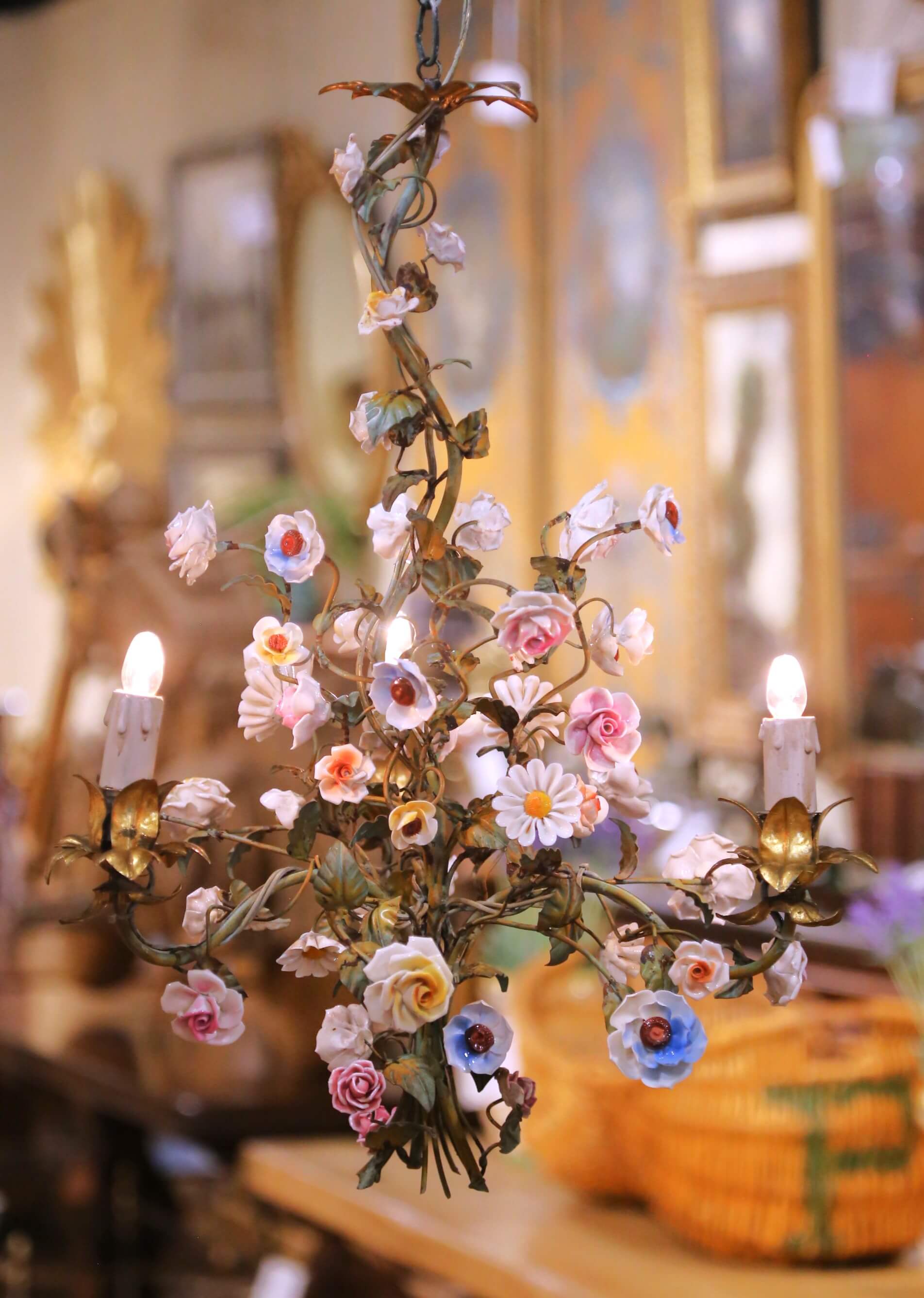 Place this elegant antique chandelier in a powder room, bedroom, or entry to bring a touch of whimsical French charm. Crafted in France circa 1920, the fixture is built around a hand-forged iron frame, intricately formed as twisting vines and scrolling branches. The structure is richly adorned with hand-applied porcelain flowers, including roses, daisies, and blossoms in soft pastel hues, creating a lively and romantic garden motif. The floral elements are complemented by painted metal leaves with a naturally aged patinated finish, enhancing the organic composition.