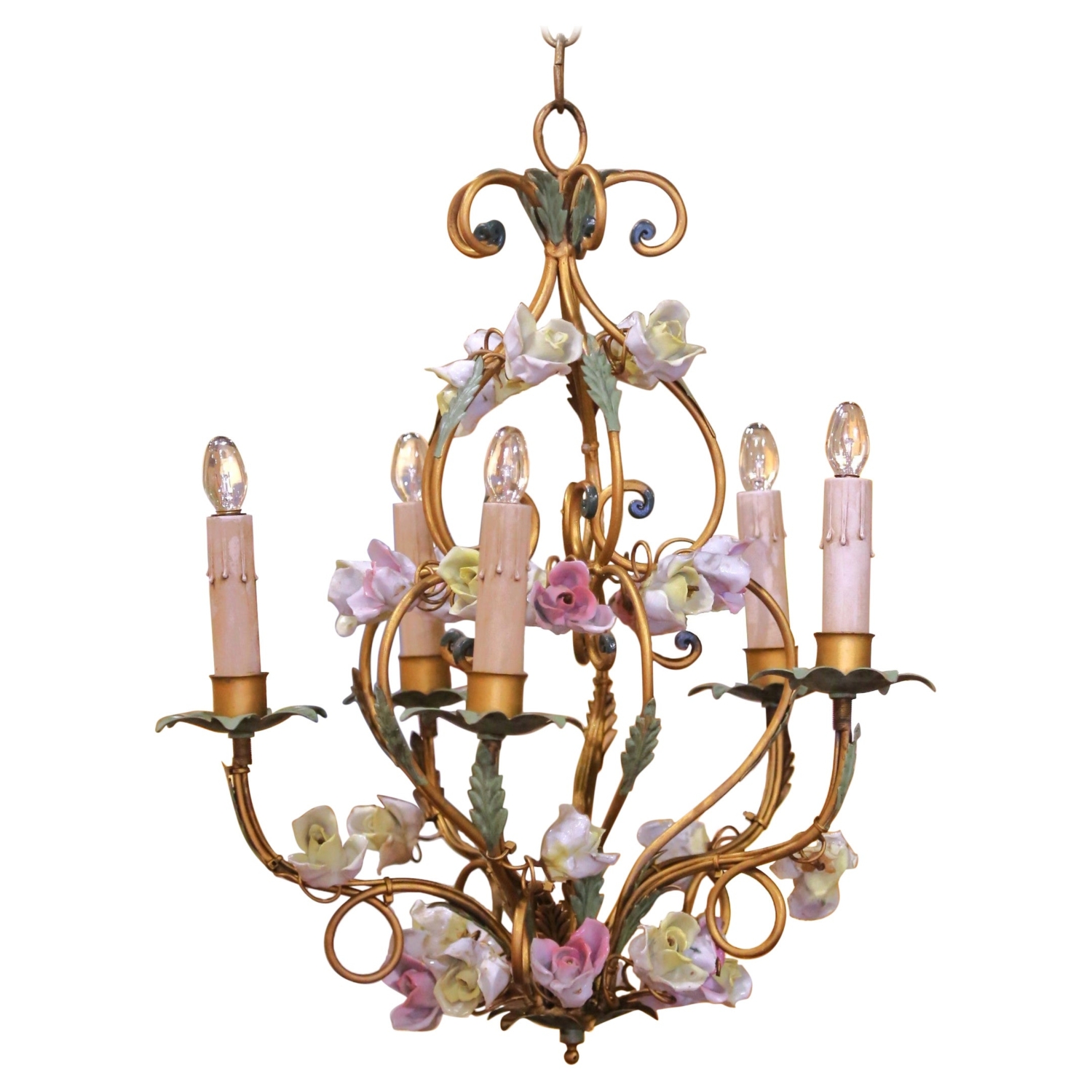 Early 20th Century French Metal and Porcelain Floral Five-Light Chandelier