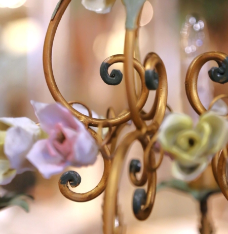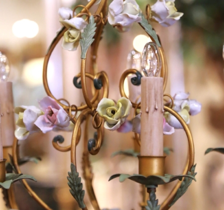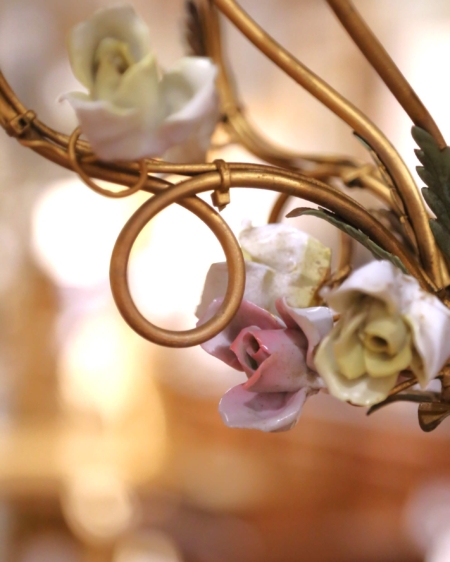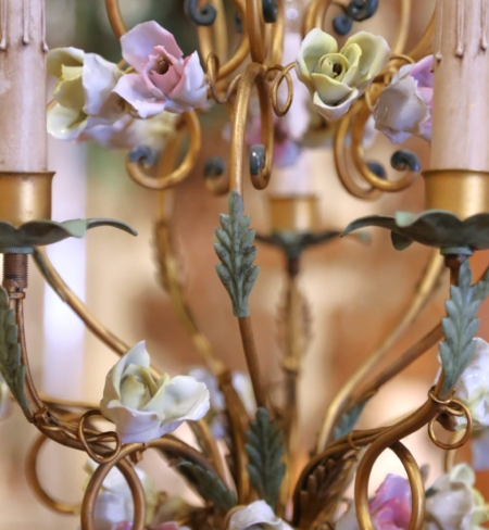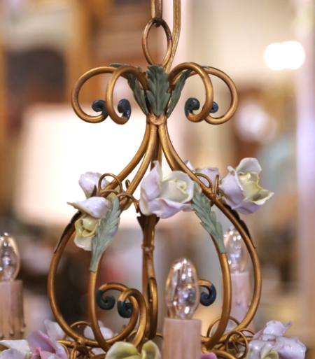 Bring color and charm to your home with this elegant floral chandelier. Crafted in France circa 1920, the fixture features a gilt metal frame with graceful scroll arms and five lights newly wired to U.S. standard. The chandelier is adorned with delicate hand-painted porcelain flowers in pastel tones of pink, ivory, yellow, and green, each petal finely modeled and applied by hand. The shaped bobeches and leafy motifs add movement and romantic appeal to the composition. This decorative hanging light is in excellent condition commensurate with age and use, with rich patinated gilt finish and intact porcelain blooms. A lovely addition to a bedroom, powder room, or entryway. Included: a canopy, loop, and chain, each color-matched to the fixture. Measures: 15″ diameter x 18″ height.