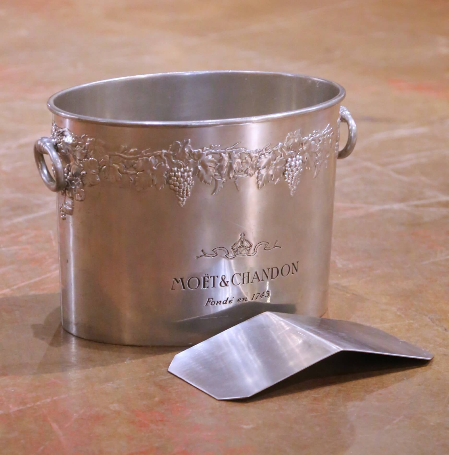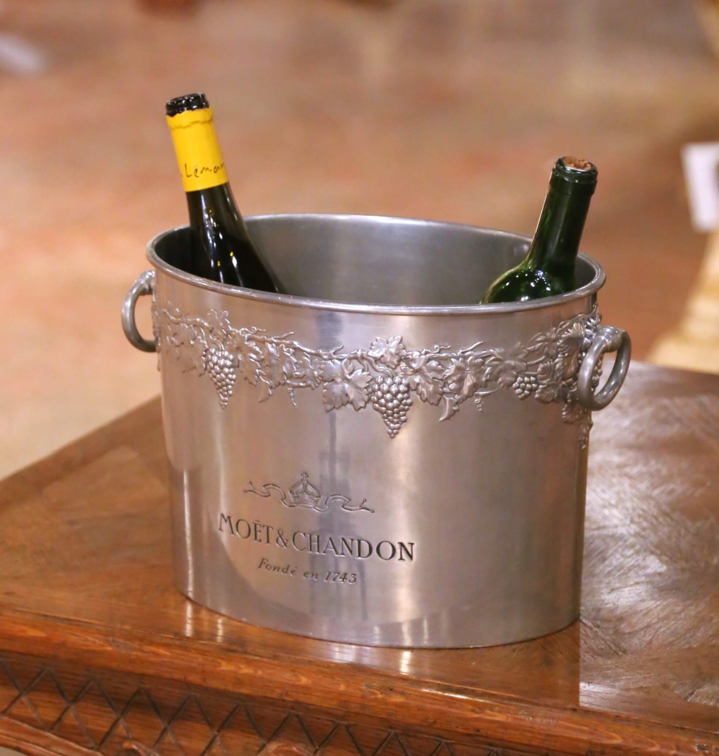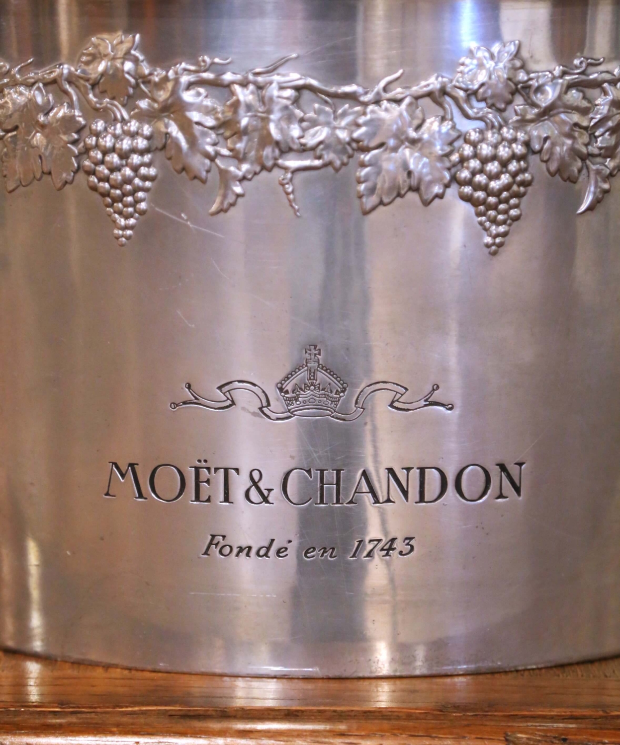 This antique French champagne cooler, crafted in pewter with a soft silvered finish circa 1920, was designed for both function and presentation, perfectly sized to chill two bottles. The oval form is flanked by ring handles and adorned with a continuous repoussé frieze of grape clusters and vine leaves, a classic motif referencing the heritage of French winemaking. The front is engraved with the Moët & Chandon name and crowned emblem, along with “Fondé en 1743,” linking the piece directly to one of France’s most prestigious Champagne houses, long associated with luxury, celebration, and refined entertaining. The interior retains its original removable insert, allowing for proper positioning and cooling of bottles while separating meltwater below, a thoughtful and practical feature rarely preserved. The underside bears a stamped mark reading “Étain – Made in France,” confirming its material and origin. The pewter body has developed a subtle, even patina that enhances its sculptural quality while maintaining a clean, luminous surface. This antique cooler is in excellent condition commensurate with age and use, with light surface wear consistent with service. A sophisticated addition to a bar, dining table, or wine cellar, it offers both decorative presence and authentic French hospitality. Dimensions: 13.5″W x 8.5″D x 8.75″H