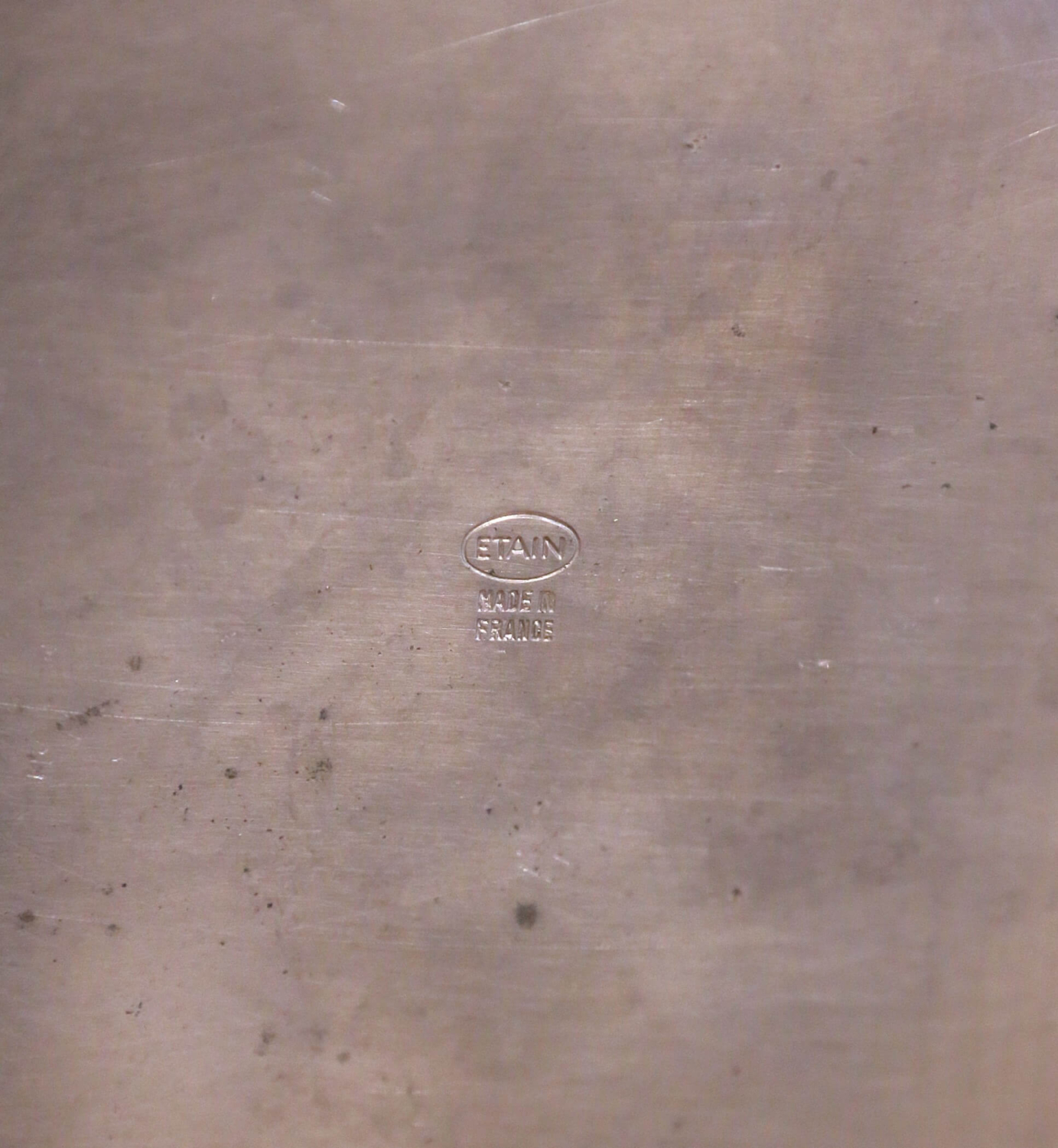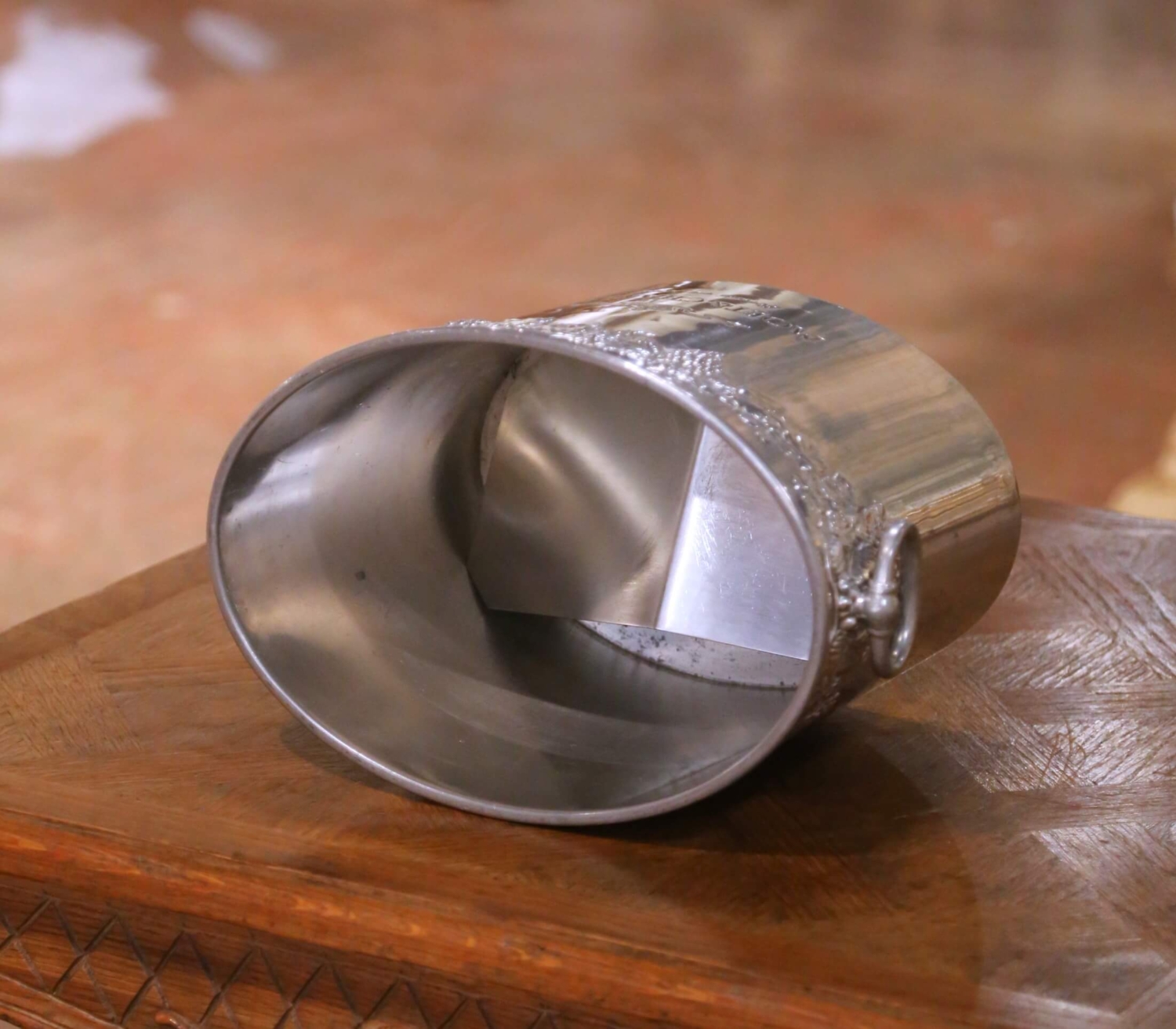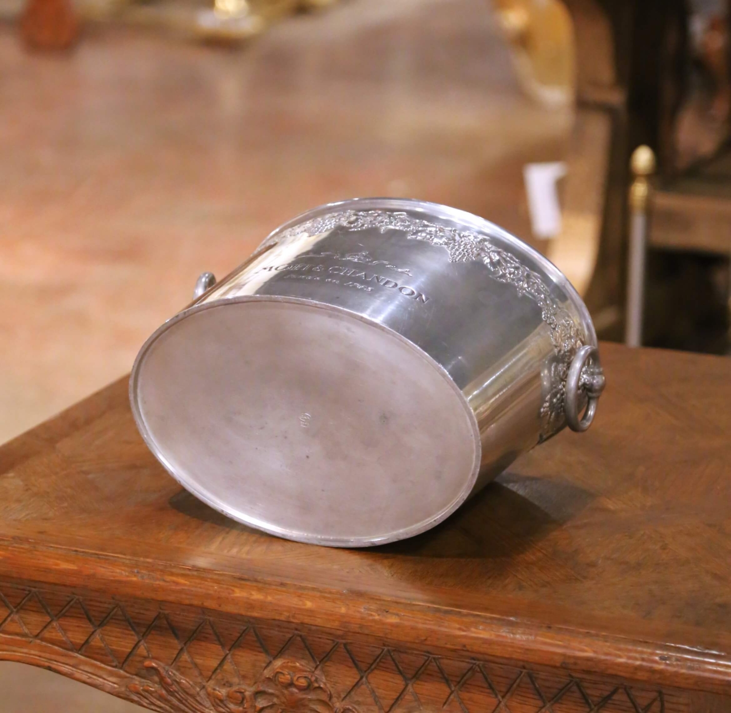 This antique French champagne cooler, crafted in pewter with a soft silvered finish circa 1920, was designed for both function and presentation, perfectly sized to chill two bottles. The oval form is flanked by ring handles and adorned with a continuous repoussé frieze of grape clusters and vine leaves, a classic motif referencing the heritage of French winemaking. The front is engraved with the Moët & Chandon name and crowned emblem, along with “Fondé en 1743,” linking the piece directly to one of France’s most prestigious Champagne houses, long associated with luxury, celebration, and refined entertaining. The interior retains its original removable insert, allowing for proper positioning and cooling of bottles while separating meltwater below, a thoughtful and practical feature rarely preserved. The underside bears a stamped mark reading “Étain – Made in France,” confirming its material and origin. The pewter body has developed a subtle, even patina that enhances its sculptural quality while maintaining a clean, luminous surface. This antique cooler is in excellent condition commensurate with age and use, with light surface wear consistent with service. A sophisticated addition to a bar, dining table, or wine cellar, it offers both decorative presence and authentic French hospitality. Dimensions: 13.5″W x 8.5″D x 8.75″H