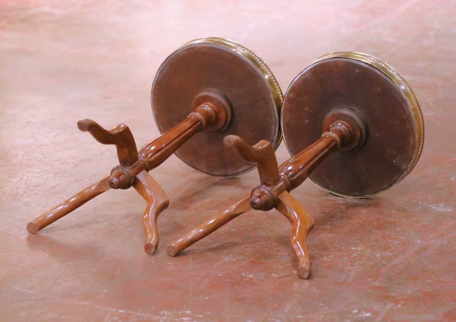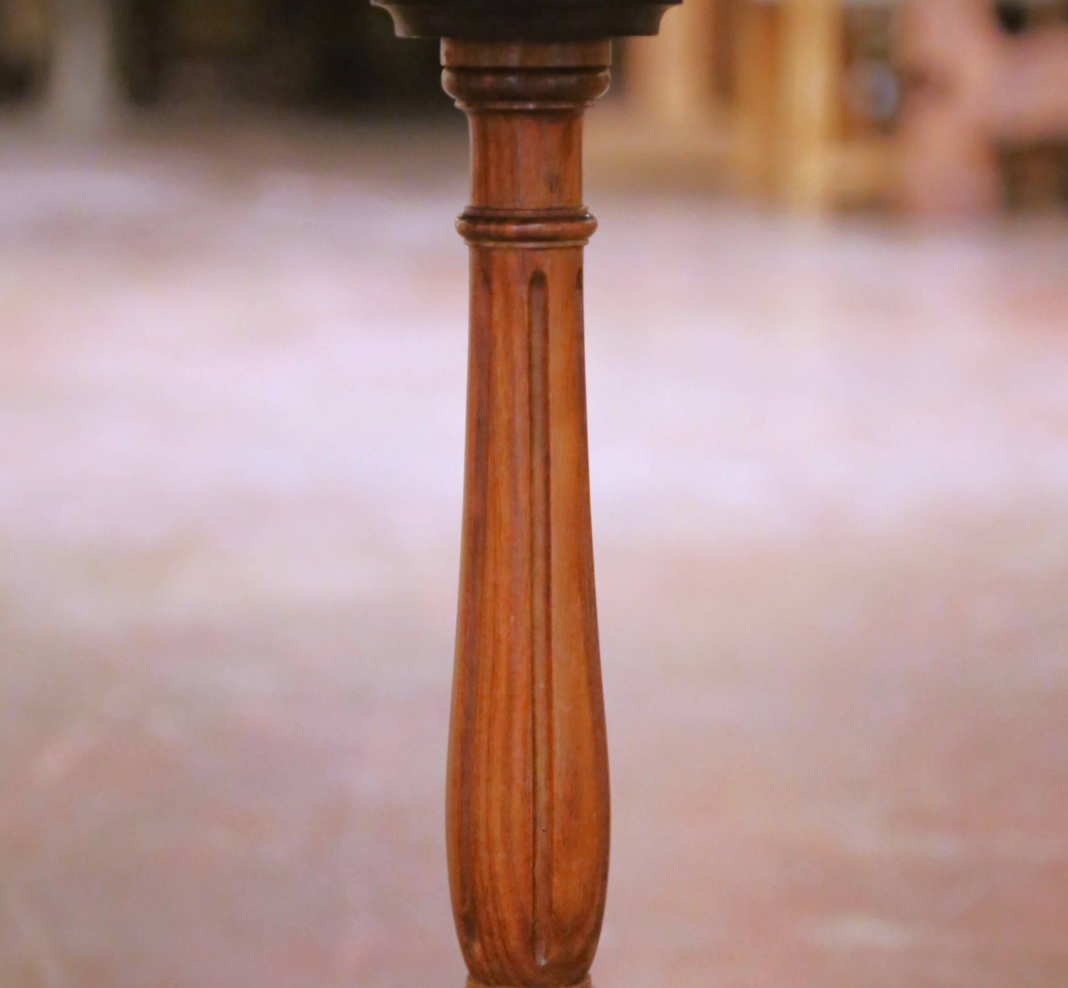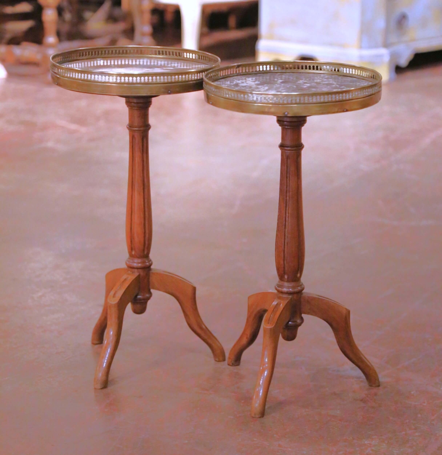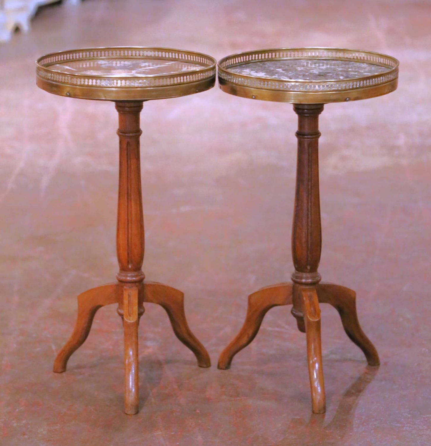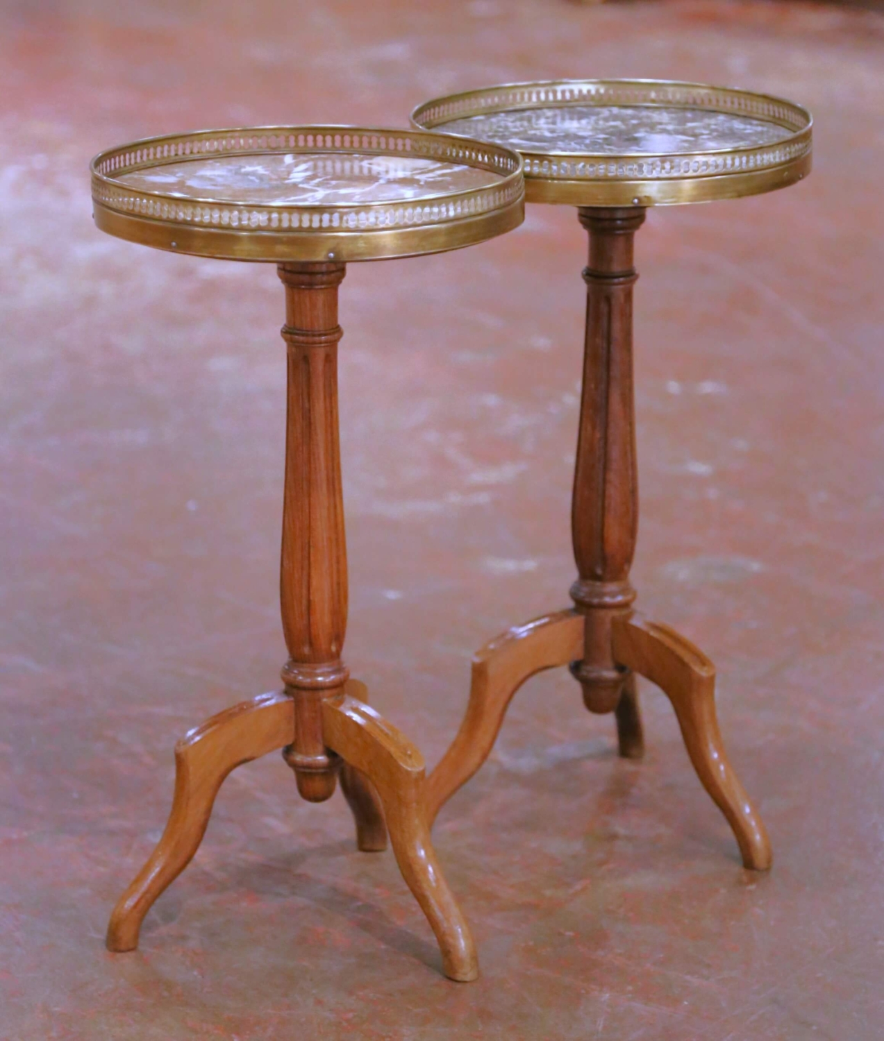 This elegant pair of antique French martini tables was crafted in France in the early 20th century, circa 1920, and reflects the enduring influence of the Napoleon III style interpreted through a restrained, early modern lens. Designed as occasional or guéridon tables, each piece features a slender turned walnut column rising from a gracefully shaped tripod base, offering refined proportions and excellent stability. The bases are executed in solid walnut with a warm, rich patina that highlights the natural grain and subtle hand-turned detailing. The softly cabriole-shaped legs curve outward with understated movement, lending the pair a light, sculptural presence well suited to salon seating, bedside use, or flanking a sofa or armchair. Each side table is topped with a circular marble surface set within a pierced brass gallery. The pair is intentionally mismatched, featuring two different marbles that complement one another beautifully: one with warmer tones and expressive veining, the other cooler and more densely figured. The brass galleries retain a softly aged finish and provide both decorative definition and functional containment. The small tables are in excellent condition commensurate with age and use, with light surface wear to the walnut and natural veining to the marble consistent with their antique character. Decorative, practical, and highly versatile, this matching yet varied pair offers classic French elegance with visual interest and authenticity. Dimensions: 11.5″ Diameter x 22″ H