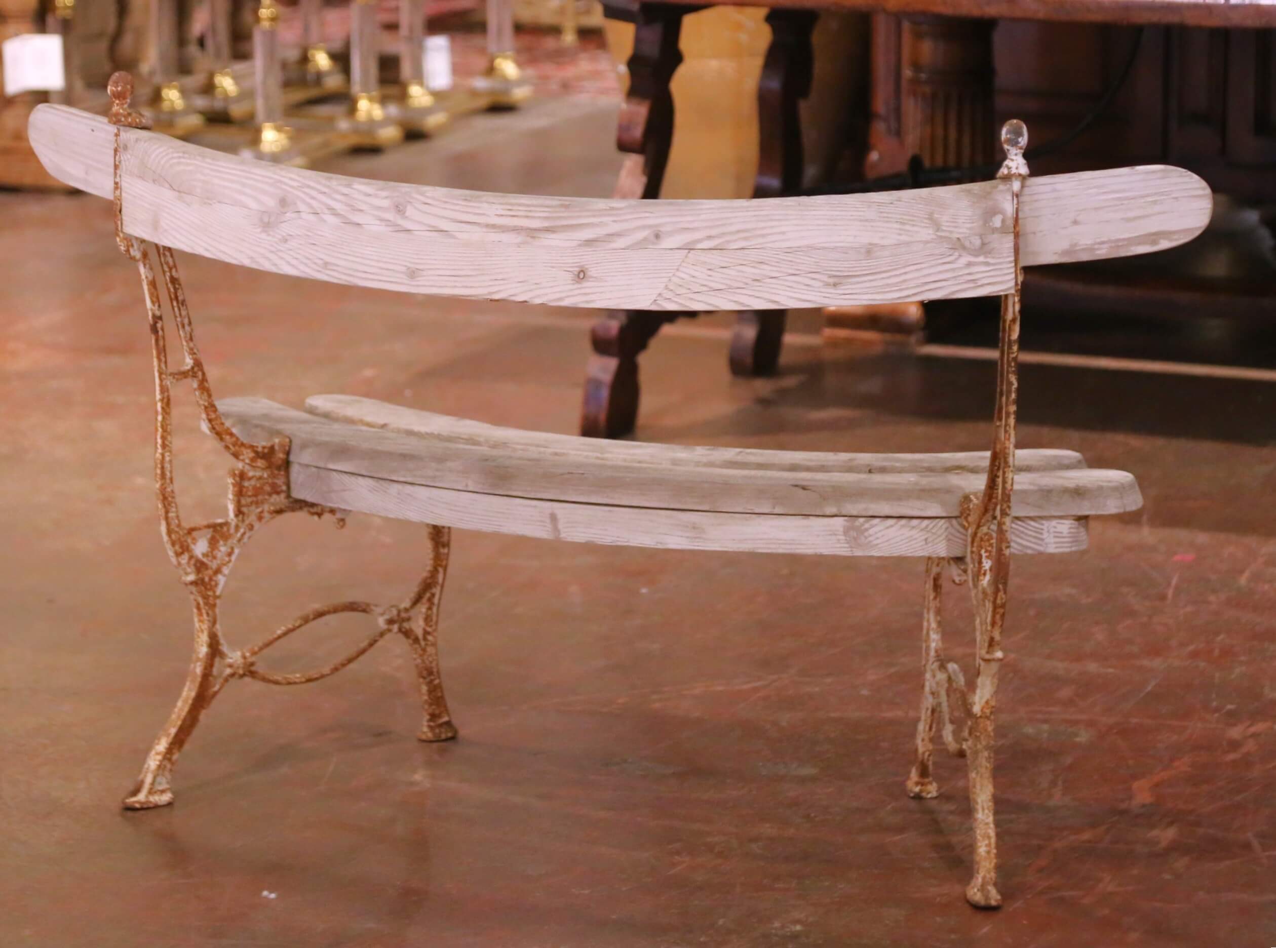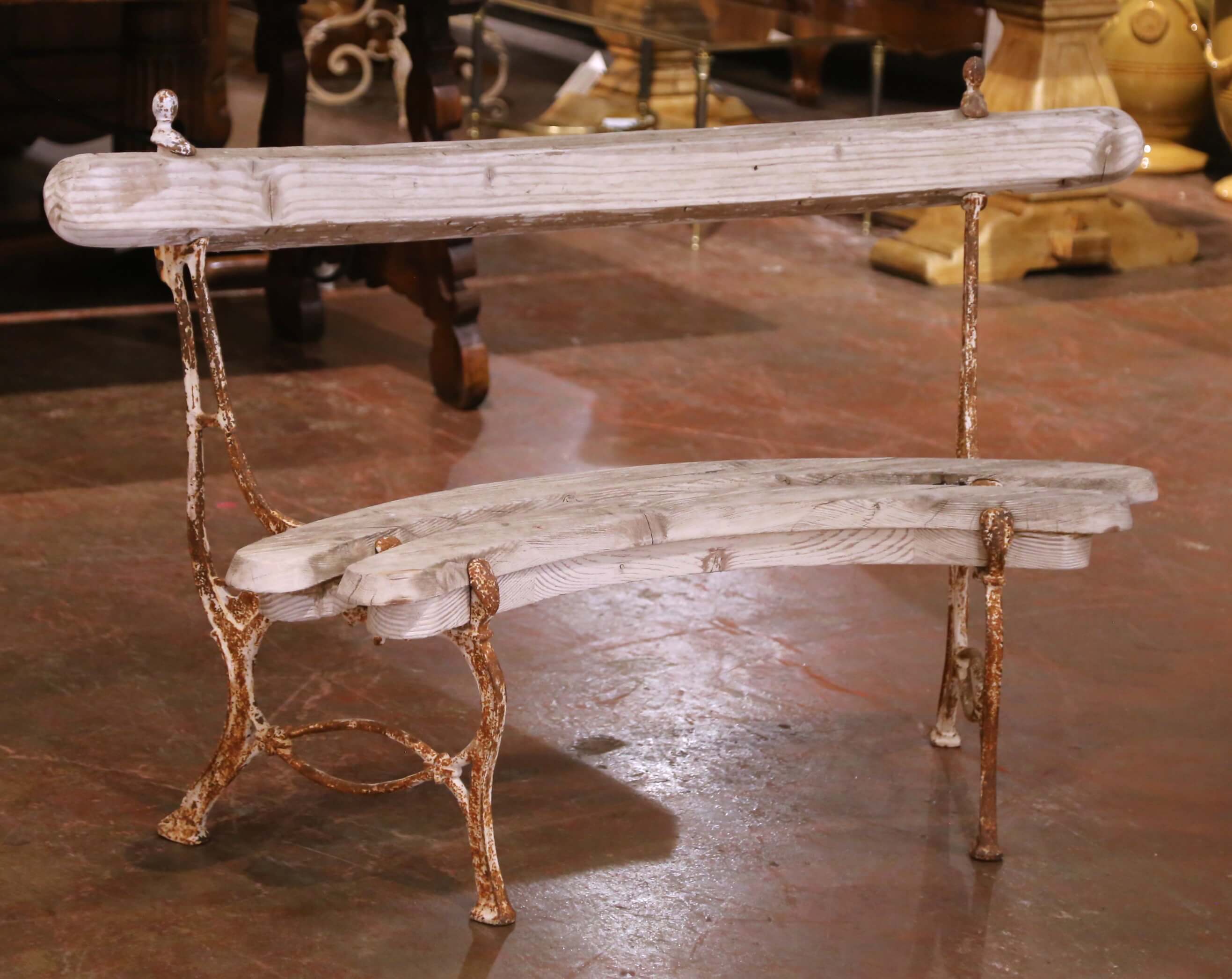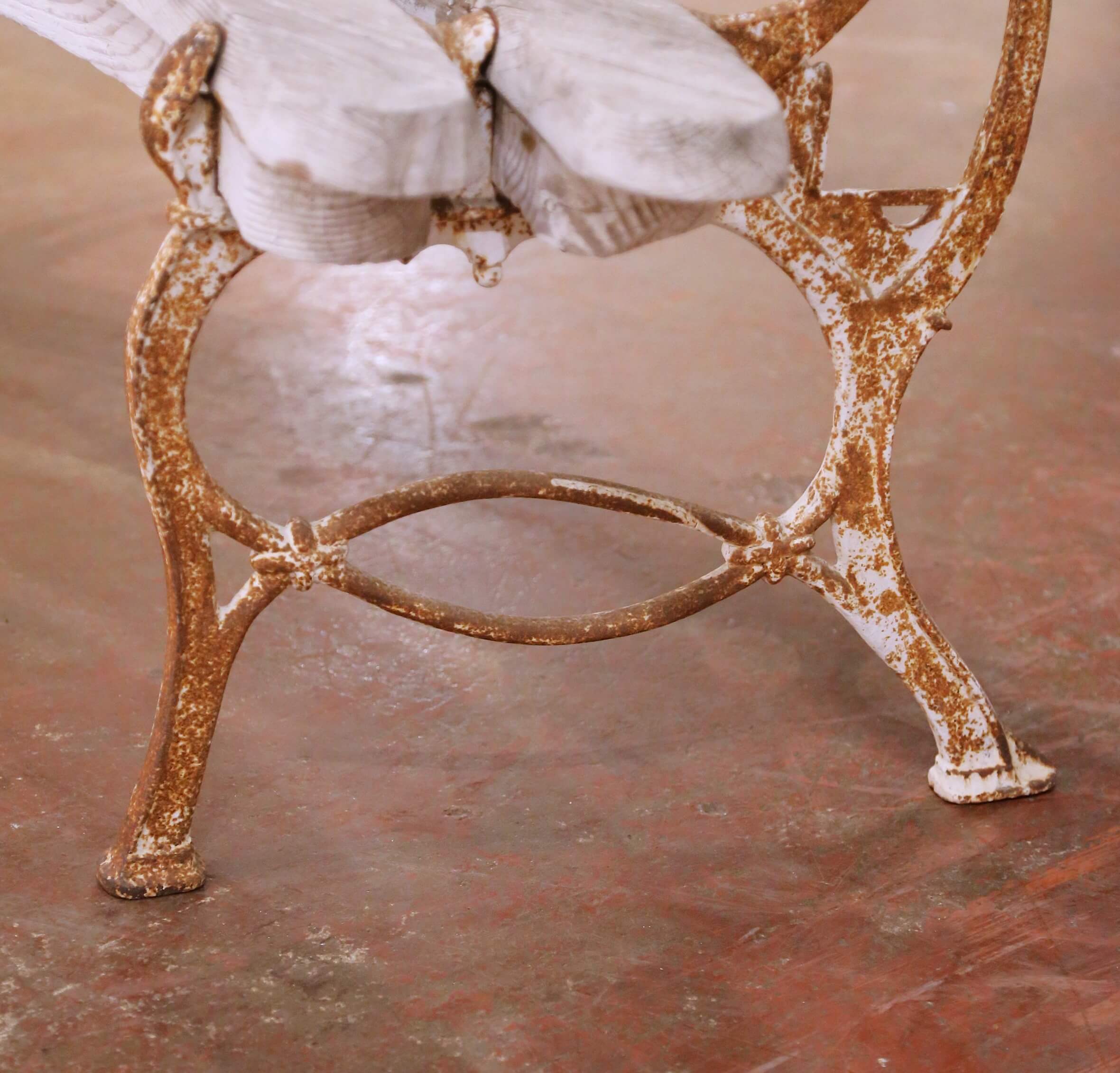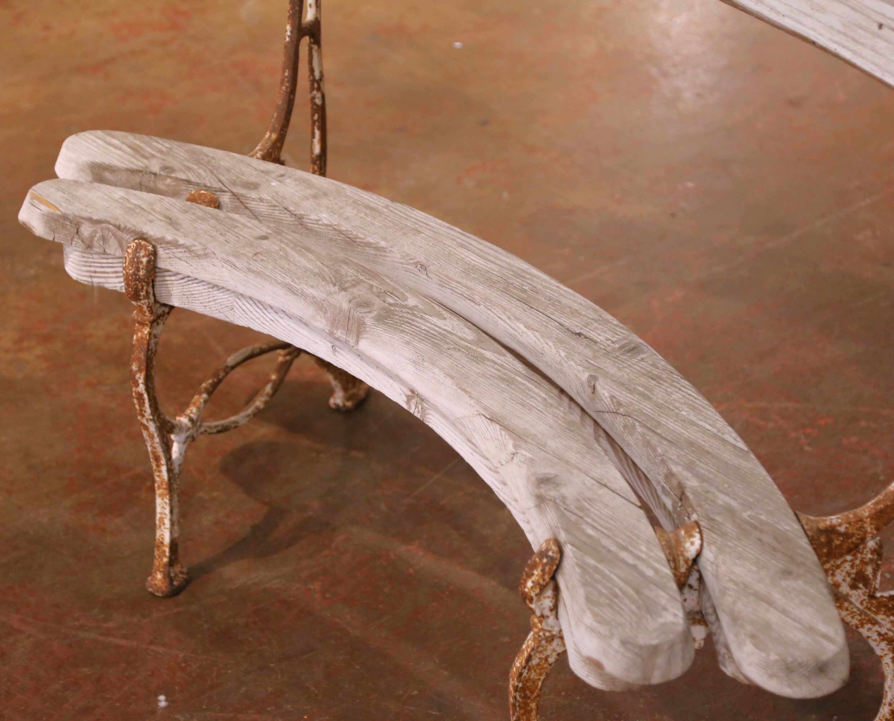 The bench rests on a decorative cast iron base with slender, curving supports and splayed legs, joined by an elegant stretcher. The iron retains its original oxidized surface with a rich, timeworn rust patina, offering a striking contrast to the pale oak above. Small finial details at the top corners add a restrained ornamental touch consistent with early 20th century French garden design.