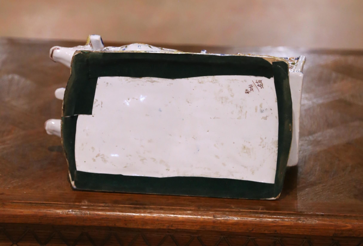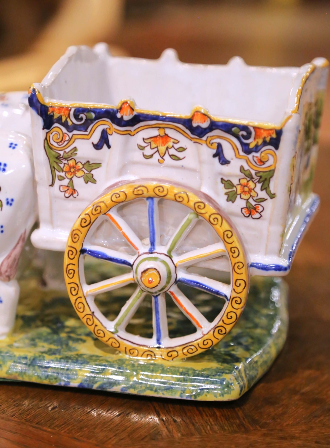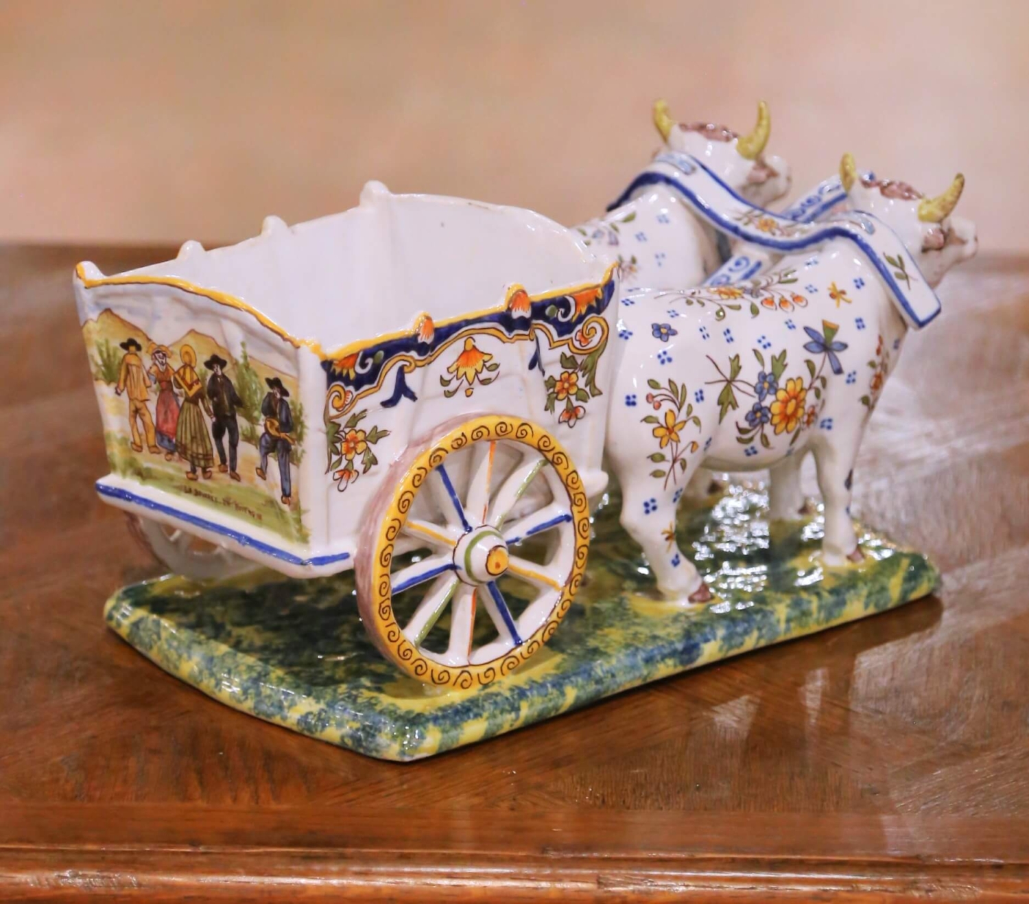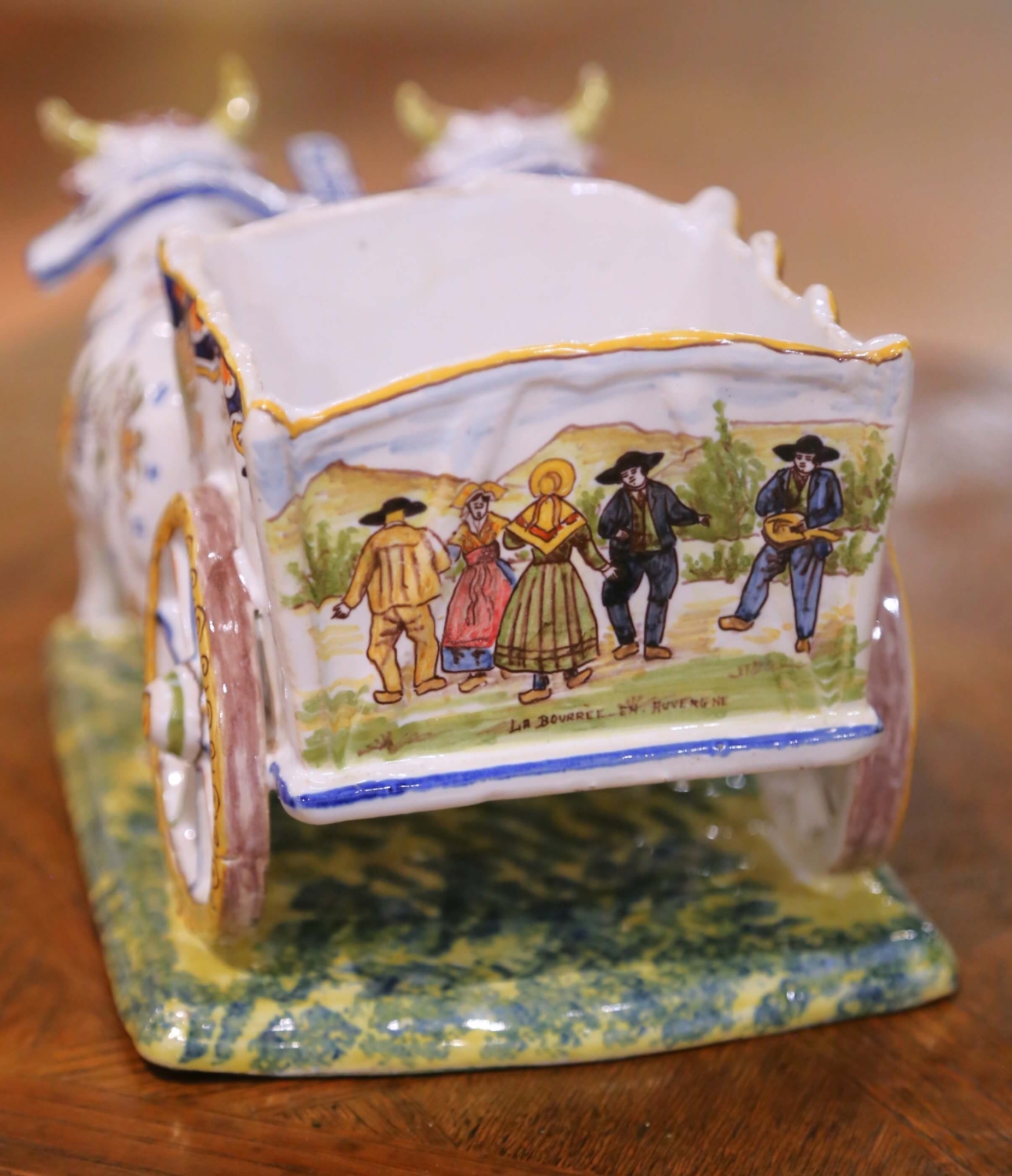 This early 20th century French faience planter or vide poche was crafted in Quimper and dates to circa 1920. Modelled as a charming ox-drawn farm cart, the antique ceramic piece captures the folkloric spirit of rural France through both sculptural form and hand-painted decoration. Two expressive oxen stand yoked beneath a blue harness, their bodies adorned with delicate floral motifs in cobalt, yellow, iron red, and green. Their gently naïve modelling and warm character are emblematic of Quimper craftsmanship from the period. The open cart behind them forms a usable cachepot with a softly scalloped rim and flared square body. One side panel features a hand-painted scene titled “La Bourrée en Auvergne,” depicting figures in traditional regional costume dancing in a pastoral mountain landscape. The decorative cart wheel is highlighted with ochre and cobalt accents, while the molded base is finished in a mottled green and yellow glaze suggesting grassy terrain beneath the animals’ hooves. Executed in glazed ceramic with vibrant polychrome enamels over a crisp white ground, this antique Quimper planter blends regional narrative decoration with sculptural whimsy. The underside bears a hand-painted workshop mark and reference numbers consistent with early 20th century production. The piece remains in excellent antique condition commensurate with age and use, with minor surface wear consistent with handling. Dimensions: 7.5”W x 13.5”D x 6.5”H