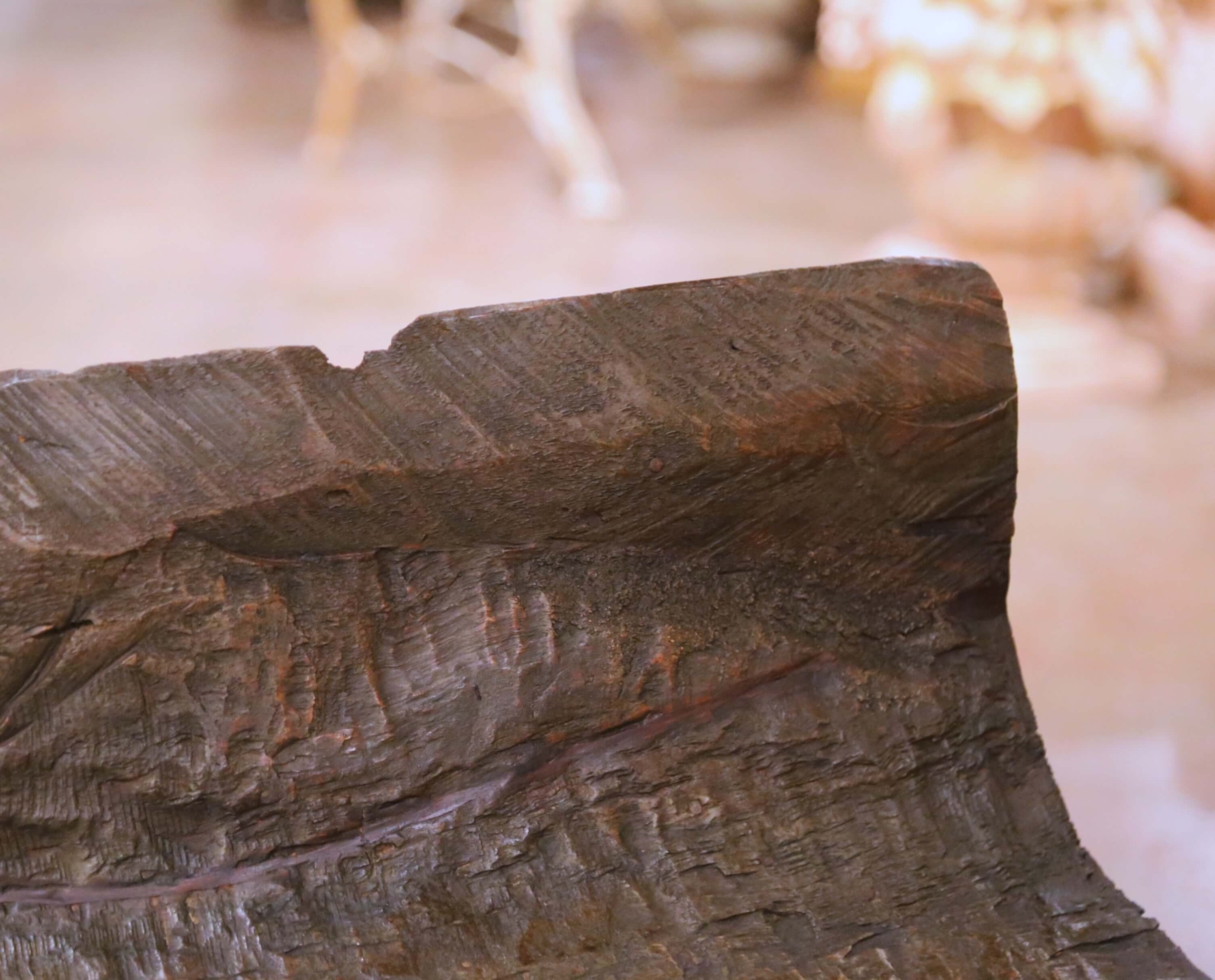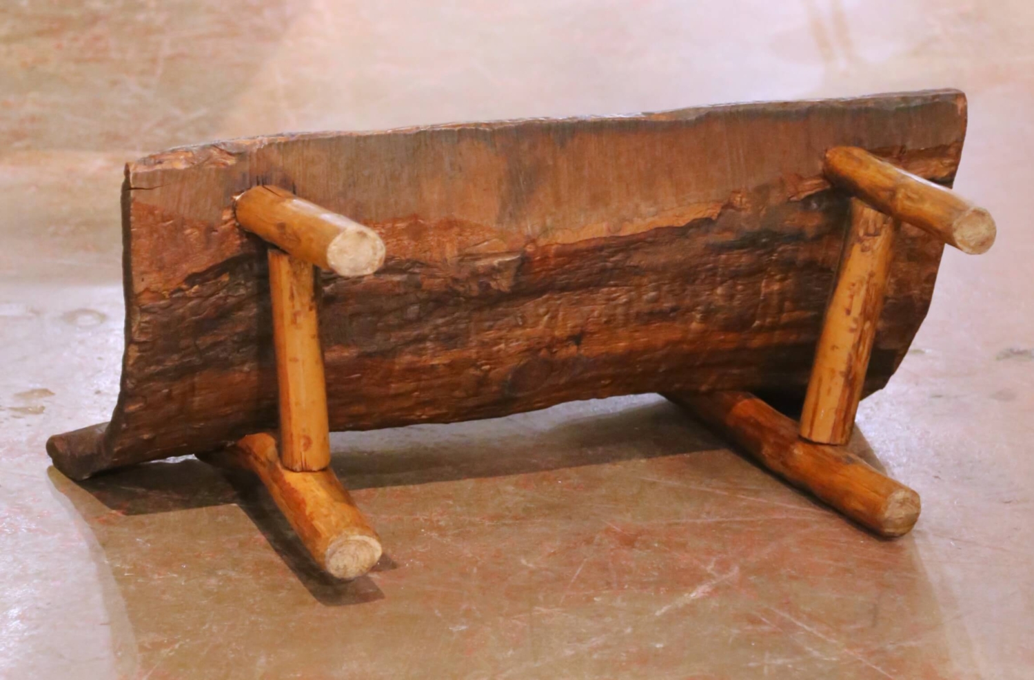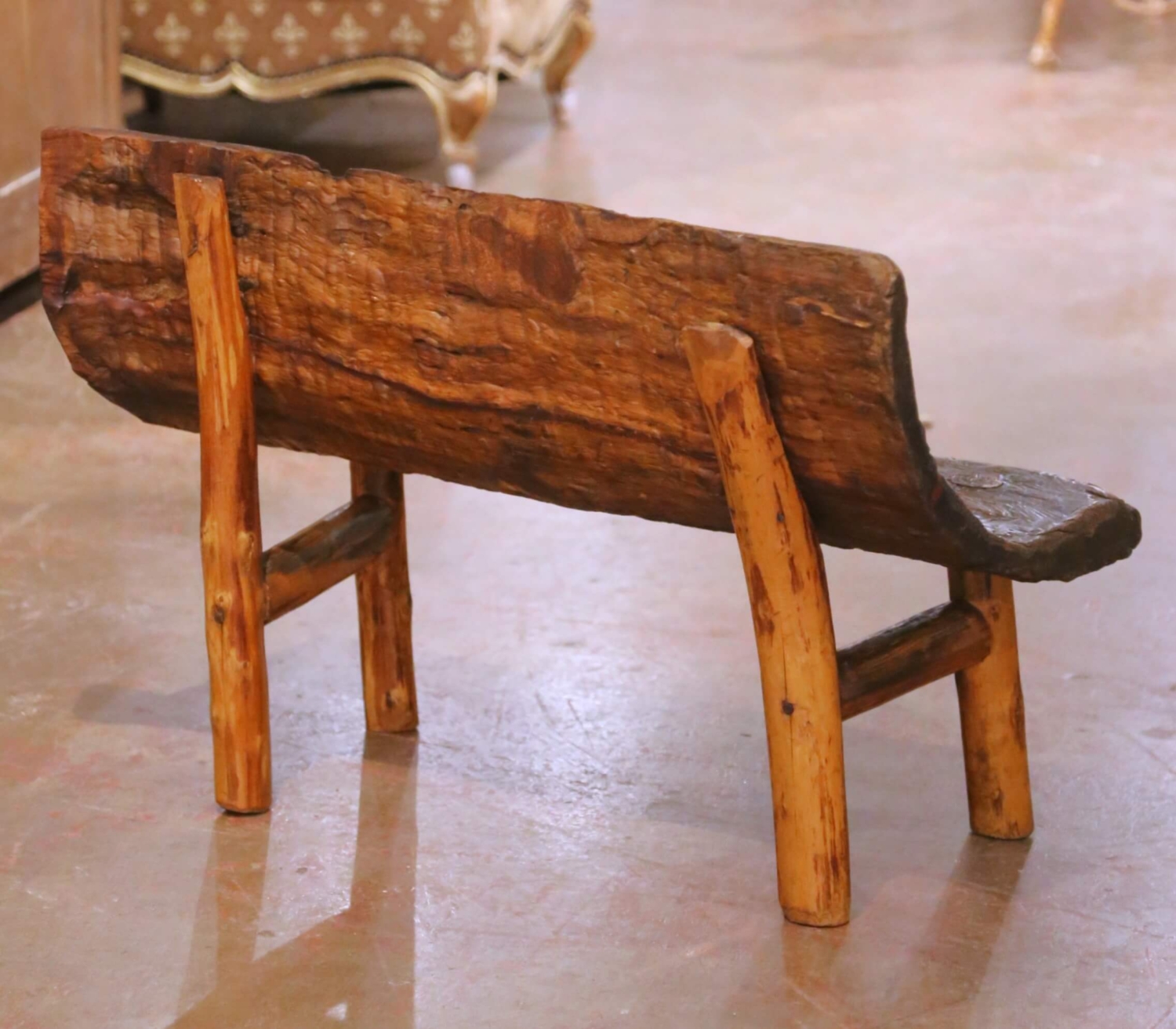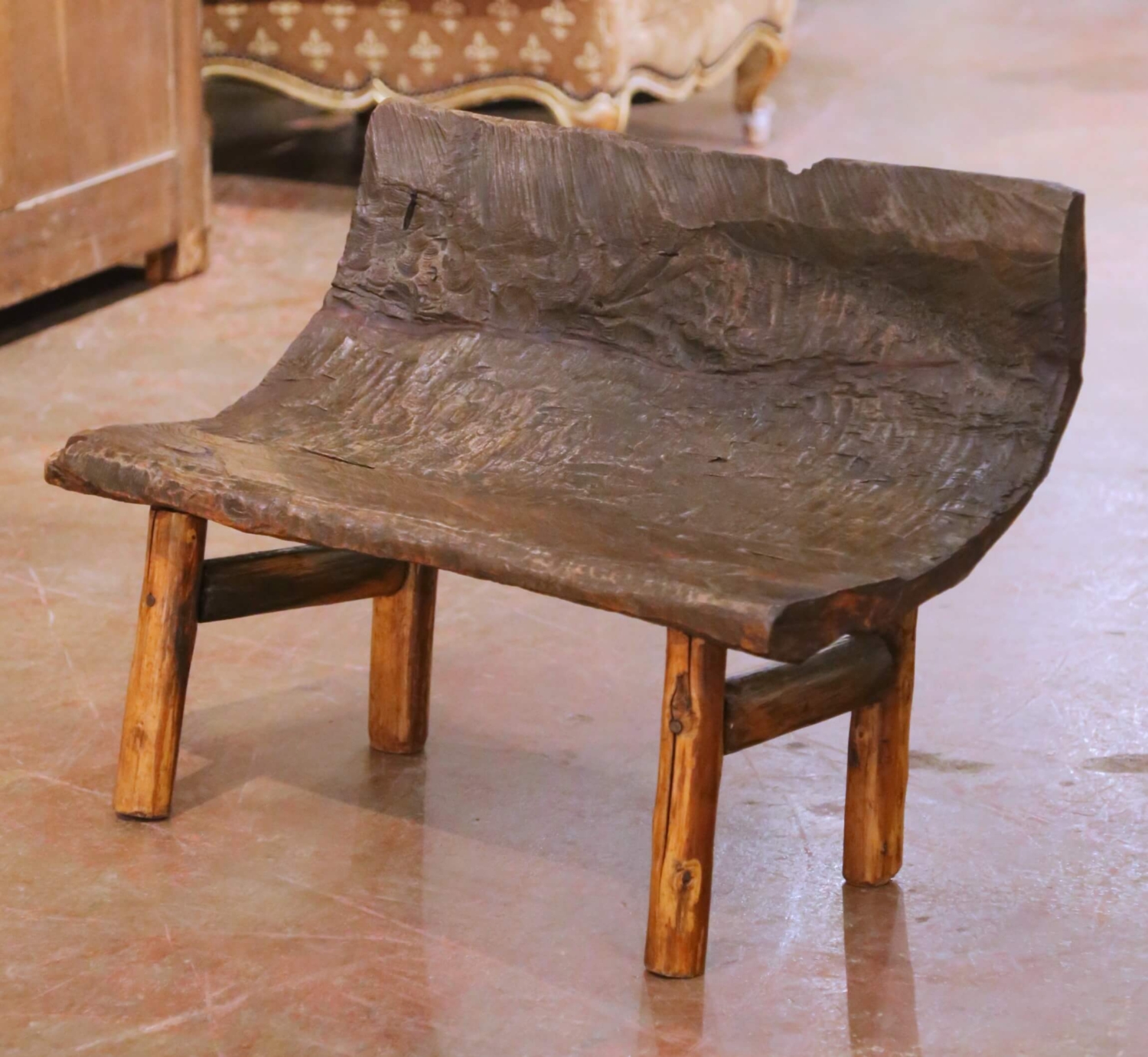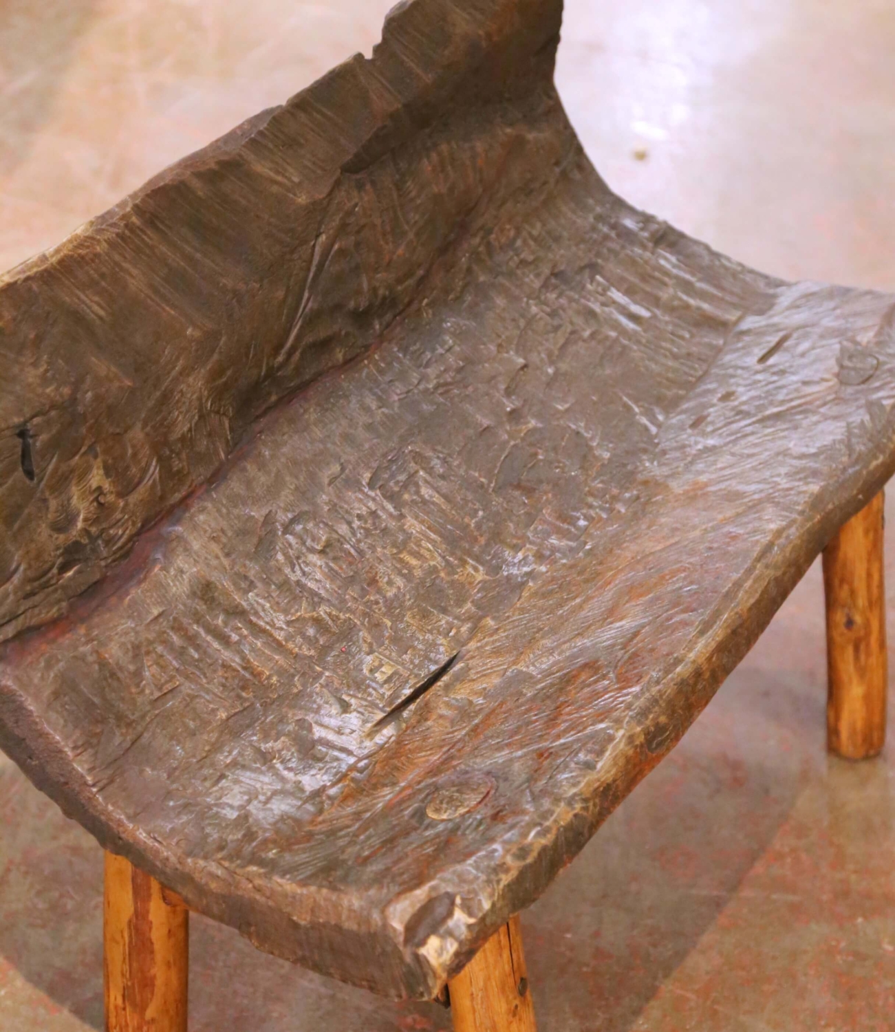 This distinctive antique rustic bench from the French Alps is hand carved from a single thick slab of solid oak, retaining its raw, organic edges and expressive tool marks throughout. The deeply textured surface and irregular silhouette give the piece a strong sculptural presence, while the gently angled backrest provides surprising comfort for such a primitive form. The seat shows natural age cracks, surface wear, and a rich, time-softened patina consistent with age and use, all contributing to its authenticity and visual strength. The bench rests on four stout cylindrical oak legs joined by simple stretchers, reinforcing its solid construction and vernacular character. The contrast between the darker, heavily worked slab and the lighter legs adds warmth and visual depth. Strongly evocative of alpine European craftsmanship, this antique oak bench works beautifully in an entry hall, hearth room, or mountain home. Excellent condition commensurate with age and use, with a stable structure and richly developed surface throughout. Dimensions: 35″W x 15.5″D x 23.5″H Seat Height: 13″