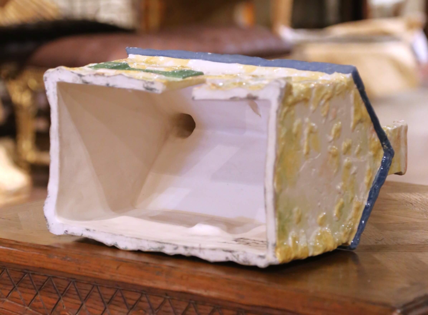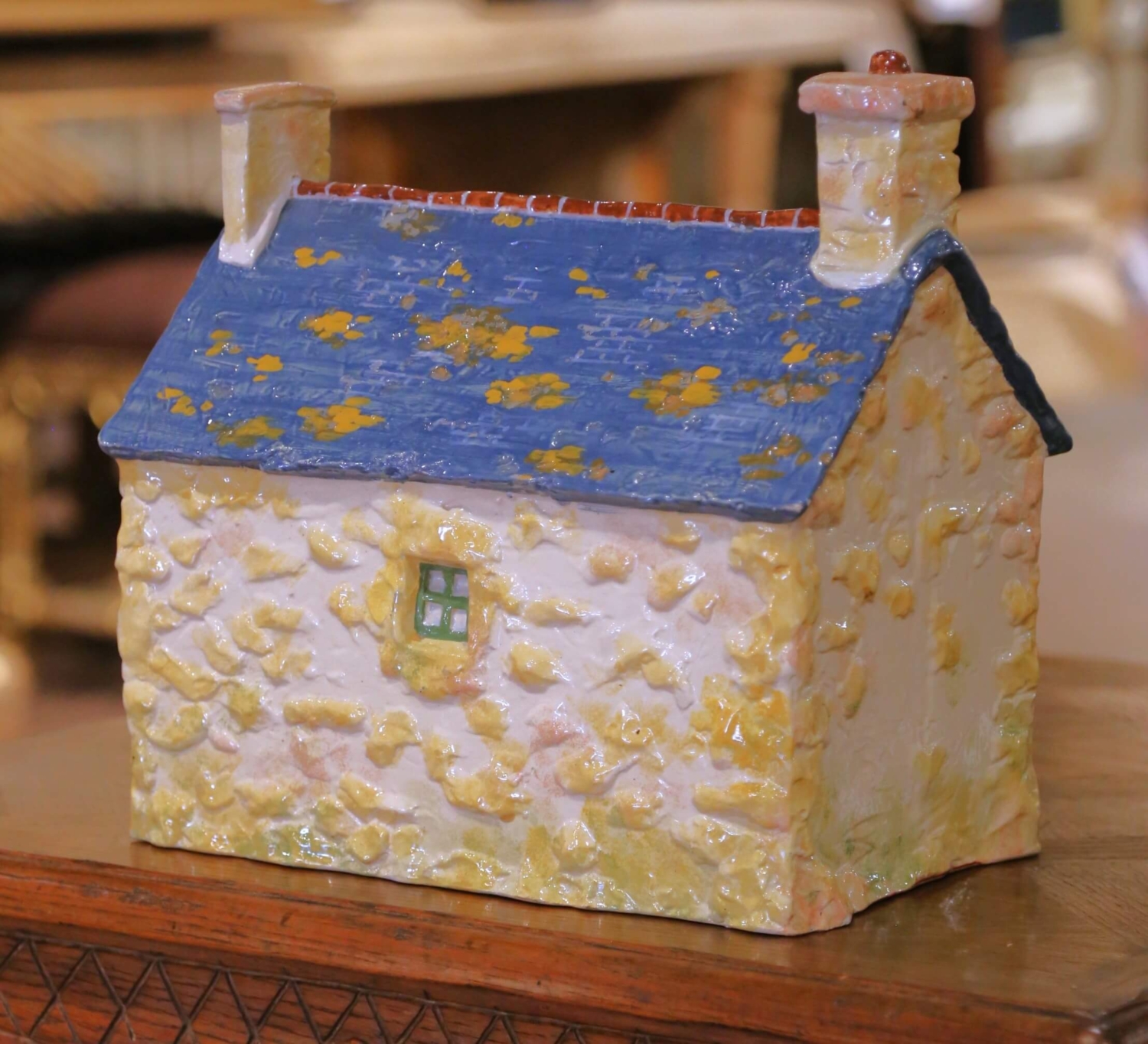 Decorate a shelf, console, or kitchen display with this charming sculptural faience house, crafted in Brittany by the Henriot Quimper atelier and signed by the noted Breton artist J.E. Sevellec. Made circa 1920, the hollow ceramic structure is modeled as a traditional stone cottage with two tall chimneys, green-paned windows, and an arched open doorway. The pitched roof is painted in deep slate blue with touches of yellow lichen, echoing the weathered rooftops typical of coastal Finistère architecture. The hand-applied surface textures and lively color palette reflect the expressive Quimper style of the early 20th century, a period during which Henriot collaborated with regional artists to produce sculptural works inspired by Breton life and folklore. The interior bears the inscription “Henriot Quimper – J.E. Sevellec” on the back wall, confirming its artistic origin. Jean-Émile Sevellec (1897–1971) was a Breton painter, illustrator, and sculptor associated with the Ecole de Quimper. Known for his depictions of Breton villages, maritime scenes, and rural traditions, Sevellec collaborated with both Henriot and HB Quimper, creating ceramic figures, architectural models, and decorative pieces. His works are appreciated for their storytelling quality, regional accuracy, and expressive modeling. Sevellec’s contributions helped define the artistic revival of Quimper faience in the early 20th century. This decorative antique house sculpture is in excellent condition commensurate with age and use, retaining strong color and charming folk-art character. Dimensions: 13.5″W × 9″D x 13.5″H