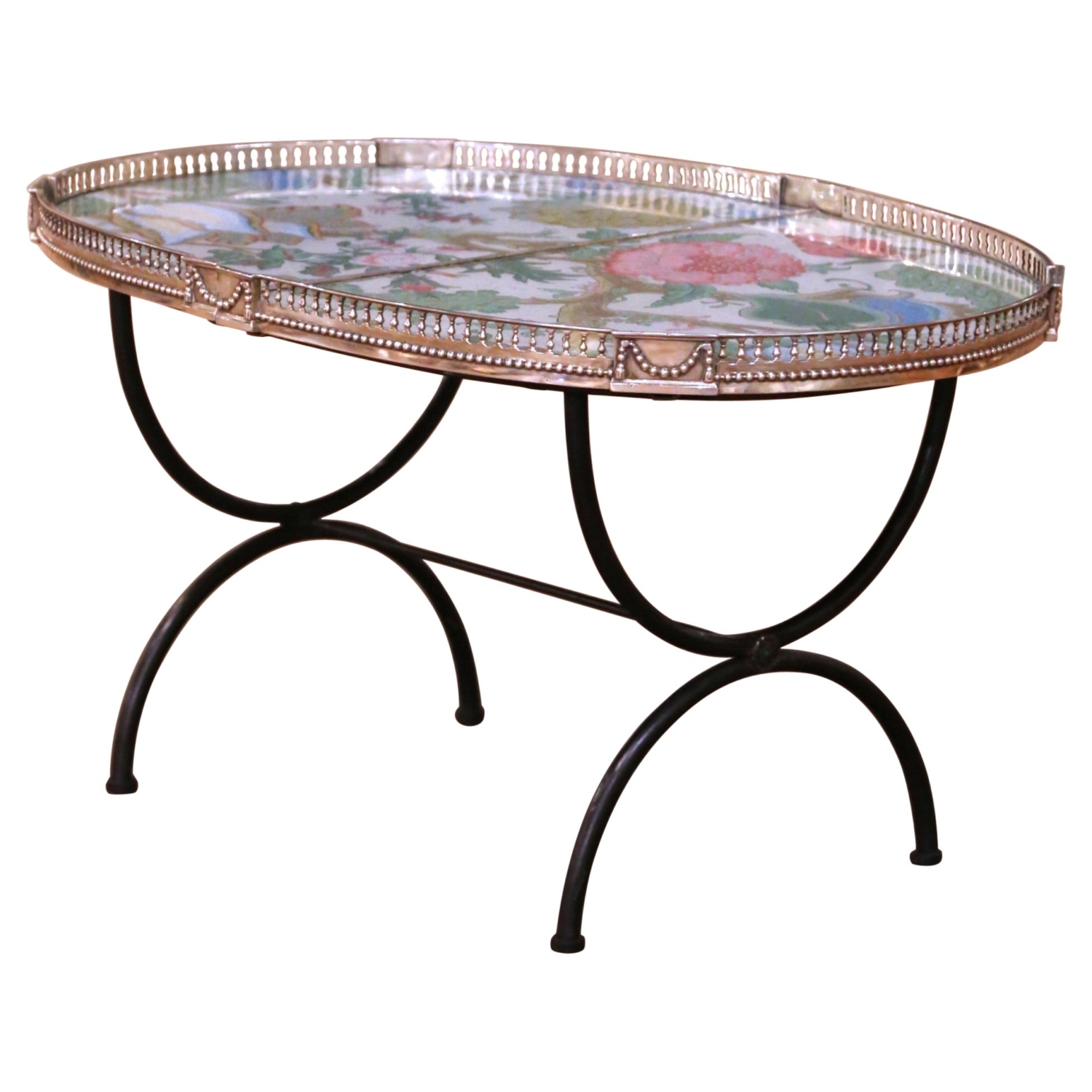 This elegant antique French oval coffee table was crafted circa 1920 and reflects refined Belle Époque taste with Louis XV revival influence. The tilting oval top is framed by a finely worked silvered copper gallery, retaining a softly aged patina with warm undertones visible at points of wear, consistent with period silvering techniques. The surface is finished with a decorative printed paper top under glass, displaying an ornate botanical motif inspired by 18th-century chinoiserie and Rococo designs, with scrolling branches and stylized floral elements arranged in a balanced and harmonious composition. The top is supported by a graceful forged iron base with arched legs joined by a shaped central stretcher, providing both stability and visual lightness. Both decorative and functional, this piece works beautifully as a coffee table, tray table, or accent table in a salon or living space. The table is in excellent antique condition commensurate with age and use and retains a strong decorative presence suitable for classic, French country, or transitional interiors. Dimensions: 34.25ʺ W x 24.5ʺ D x 19ʺ H