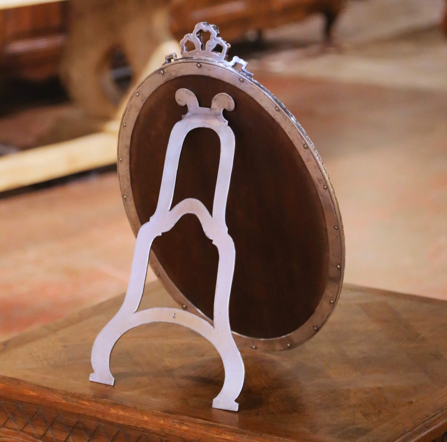 This elegant antique French vanity mirror was crafted circa 1900 and embodies the refined decorative spirit of the Belle Époque period. The oval glass is framed in finely cast silverplated over nickel, richly detailed with a continuous beaded and stylized floral border that creates texture and visual depth. A sculptural ribbon and bow crest crowns the top, lending a romantic and distinctly French silhouette that elevates the piece beyond the purely functional. The mirror retains its original plate with light foxing and scattered age spotting, consistent with its authentic antique character and adding softness to the reflection. The silverplated finish displays a beautiful, timeworn patina, with subtle tonal variation that enhances the crisp casting along the edge and decorative crest while revealing gentle warmth beneath in areas of natural wear. The reverse is finished with a warm wood backing, secured with small rivets, and fitted with a folding easel support. The stand allows the mirror to sit securely on a vanity, dressing table, desk, or mantel and folds nearly flat when closed for versatility and storage. This antique French silverplated over nickel vanity mirror offers both practical function and decorative elegance, ideal for a bedroom, powder room, or refined tabletop vignette. Dimensions: Opened: 14.75″W x 10″D x 20.25″H Closed: 14.75″W x 2.25″D x 20.25″H