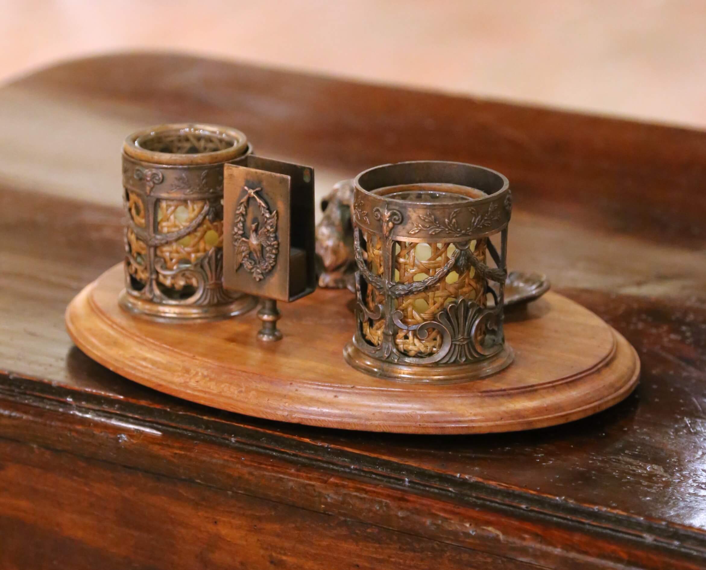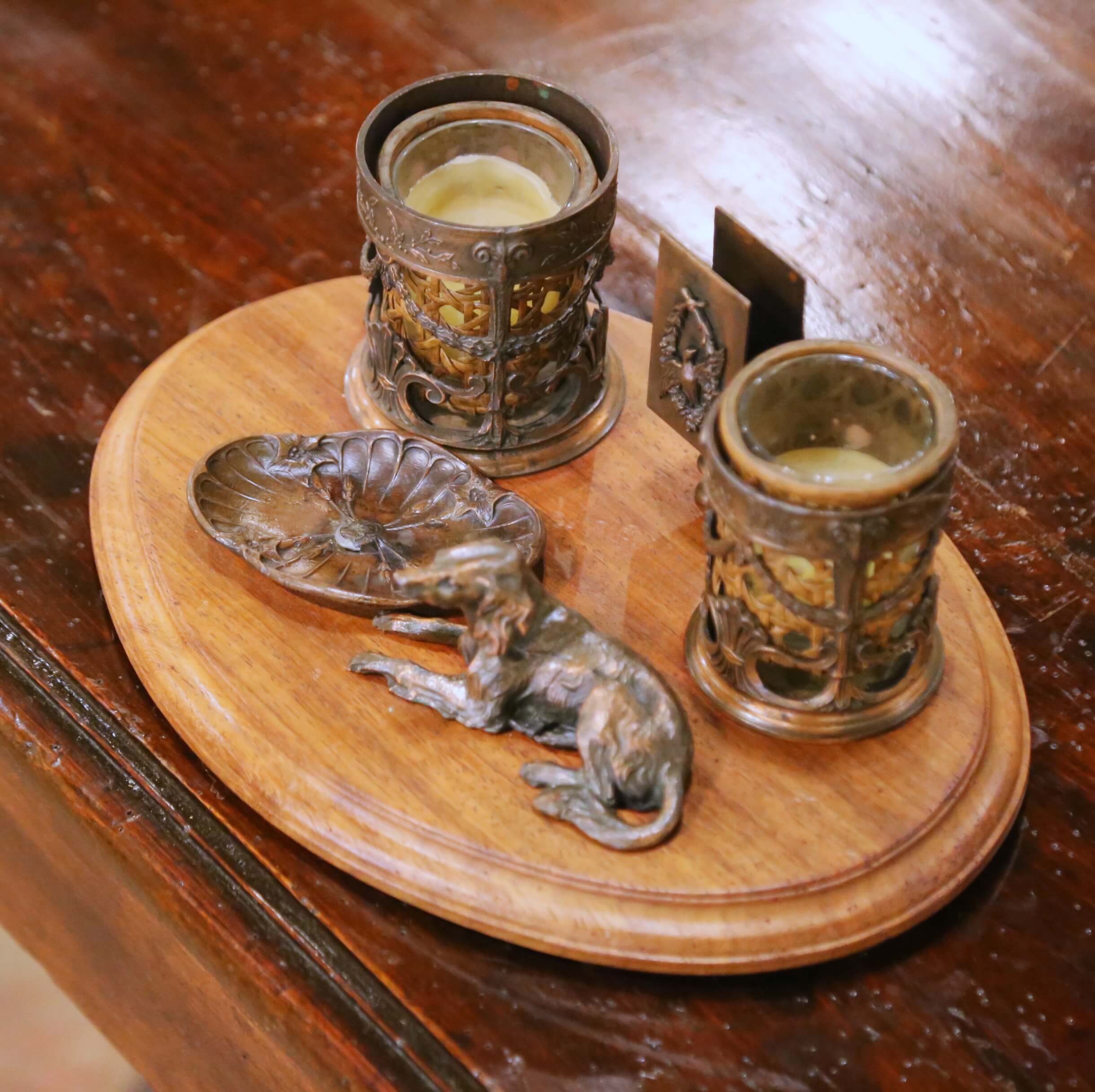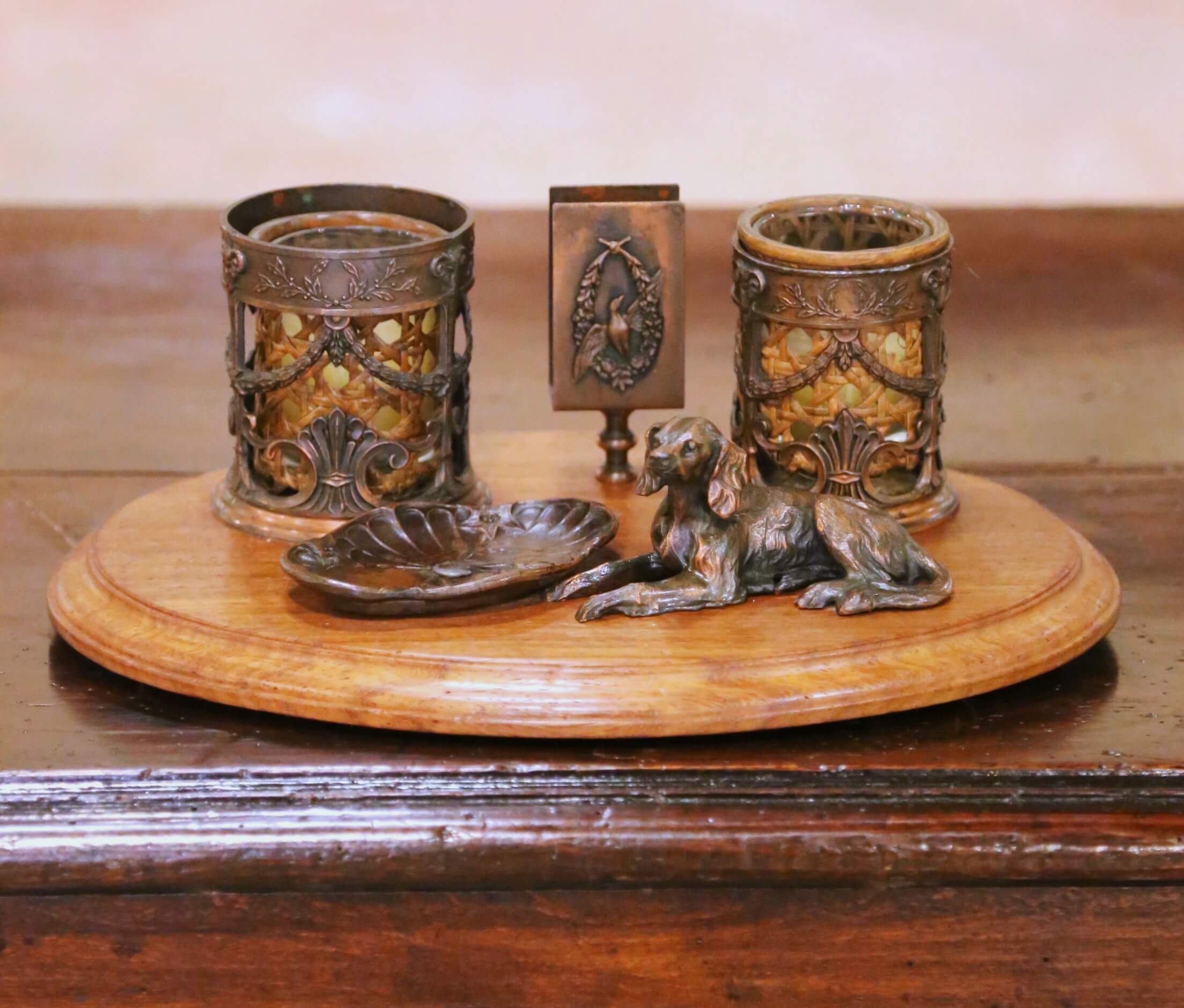 The set includes a pair of candle holders with removable glass inserts, each framed by pierced and garlanded mounts with classical motifs. At the center stands a small letter holder adorned with a relief of a bird within a laurel wreath, adding a refined neoclassical touch. In front, a small vide-poche tray with shell and floral detailing offers a practical catchall, accompanied by a finely cast reclining dog figure, bringing a touch of character and whimsy to the piece.
