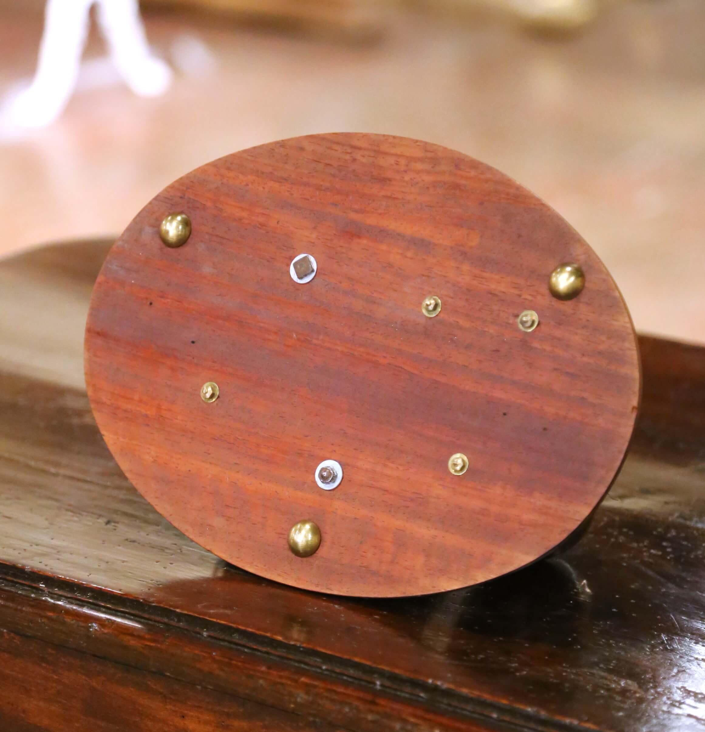 The warm walnut base displays a nicely aged patina with visible grain, while the spelter elements have developed a rich, darkened finish consistent with age. The underside reveals original construction with brass tacks and hardware.