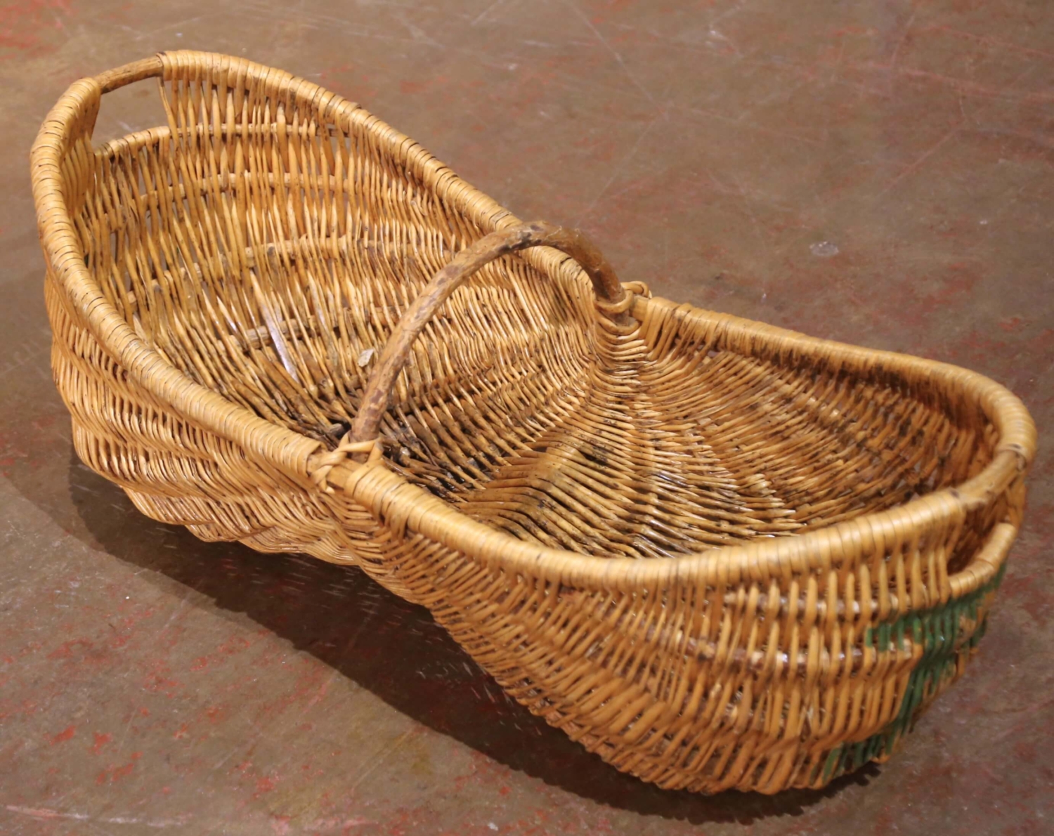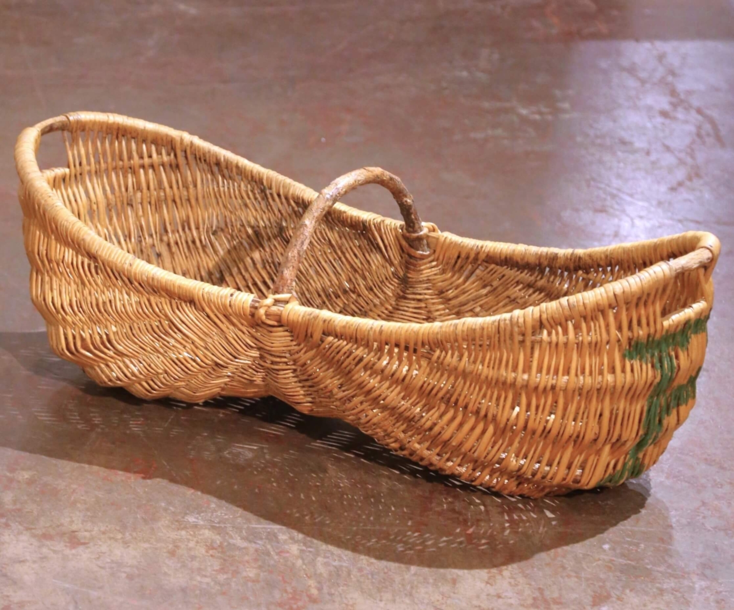 Decorate a wall or a cabinet top full of flowers with this antique French harvest basket. Crafted in Normandy circa 1920, the large elongated basket was traditionally used for gathering apples, making it both a functional and regional piece of rural life.