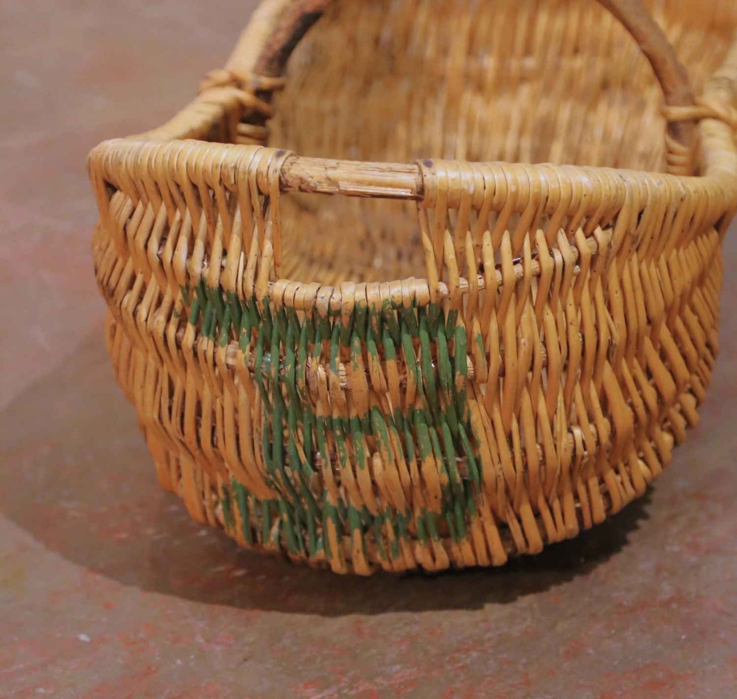 Handwoven in sturdy wicker over a wooden frame, the panier is dressed with an elegant central arched bamboo handle, allowing for balanced carrying when filled. The sides are beautifully executed with a subtle chevron pattern, while the reinforced rim adds structure and durability. The basket has developed a rich, warm weathered patina over time, enhancing the texture and depth of the weave.