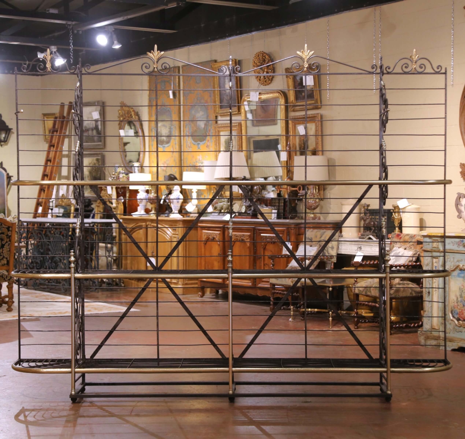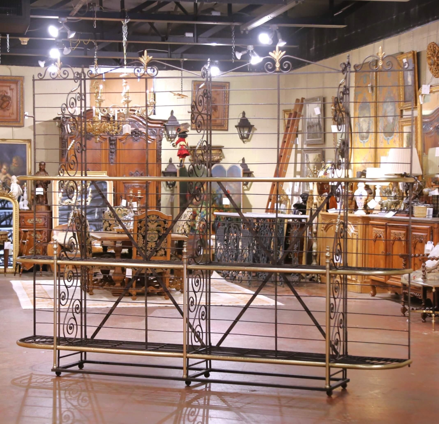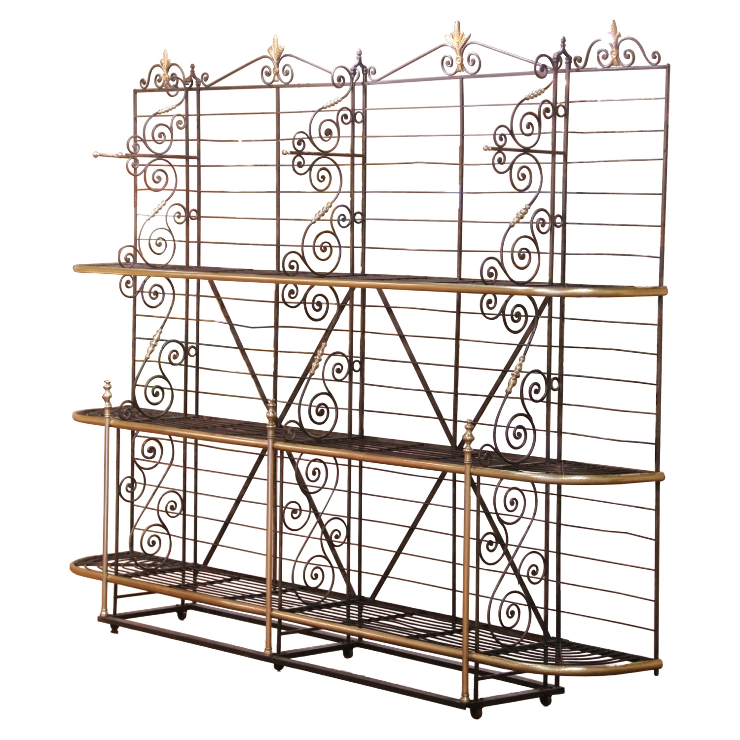 Add grandeur and functionality to your kitchen, dining room, or garden with this monumental antique baker’s rack. Crafted in France circa 1920, the nearly ten foot long étagère is hand-forged from sturdy wrought iron and enriched with decorative brass trim, turned finials, and rounded brass front rails. The frame features a exquisite dark patinated silver finish that highlights the scrolling motifs and lends the piece an elegant, subtly metallic sheen. The structure showcases beautifully formed “S” arabesques, curved end shelves with rounded corners, and cross-braced supports that provide both decorative interest and structural strength. Designed for both beauty and utility, the rack offers multiple tiers of open shelving ideal for displaying pottery, serveware, copper, or greenery. The dark silver patina and warm brass accents create a striking contrast, capturing the refined yet rustic character of early 20th-century French craftsmanship. For added practicality, the piece is set on six original iron caster wheels, allowing the entire unit to move easily for cleaning or rearranging a space. The baker’s rack is in excellent condition commensurate with age and use, and its aged finish enhances its timeless architectural presence. Measures: 118.25″ W x 19″ D x 94.75″ H.