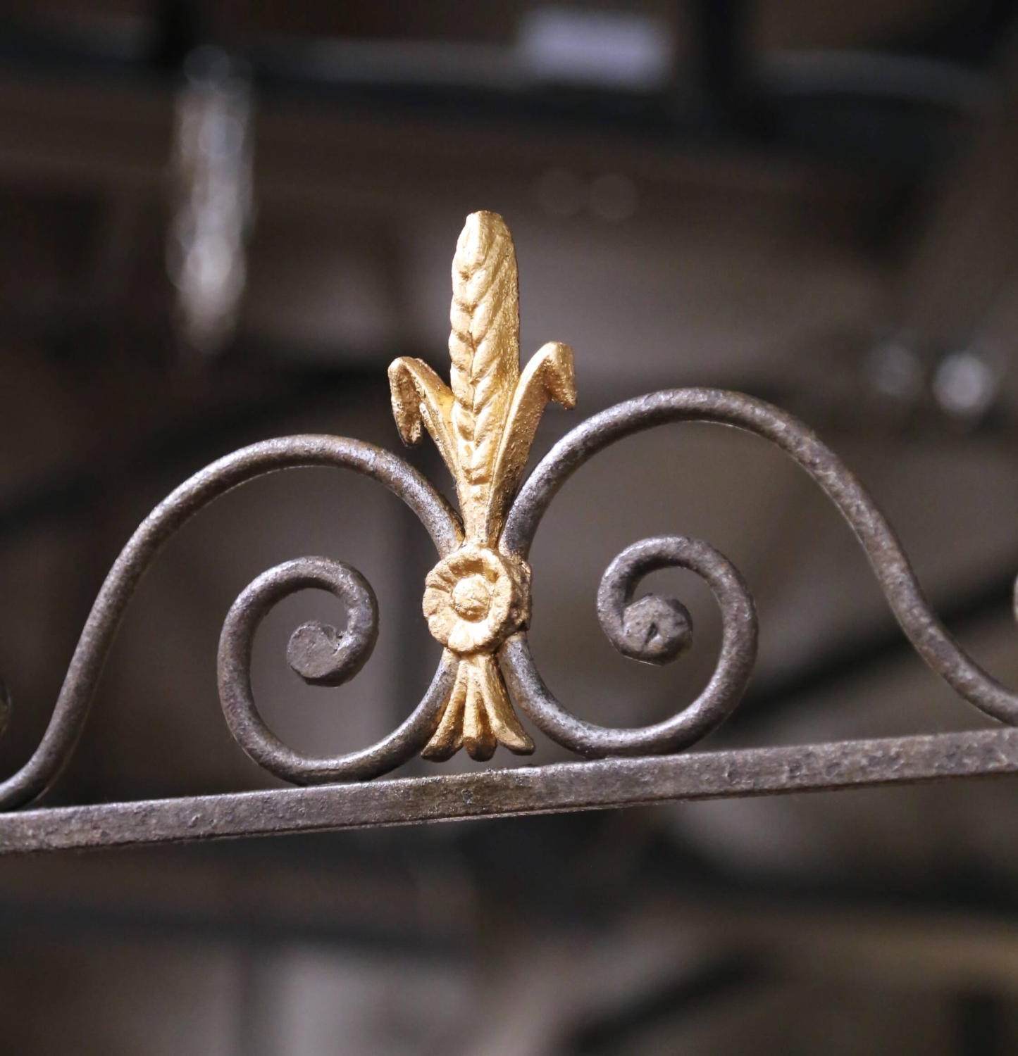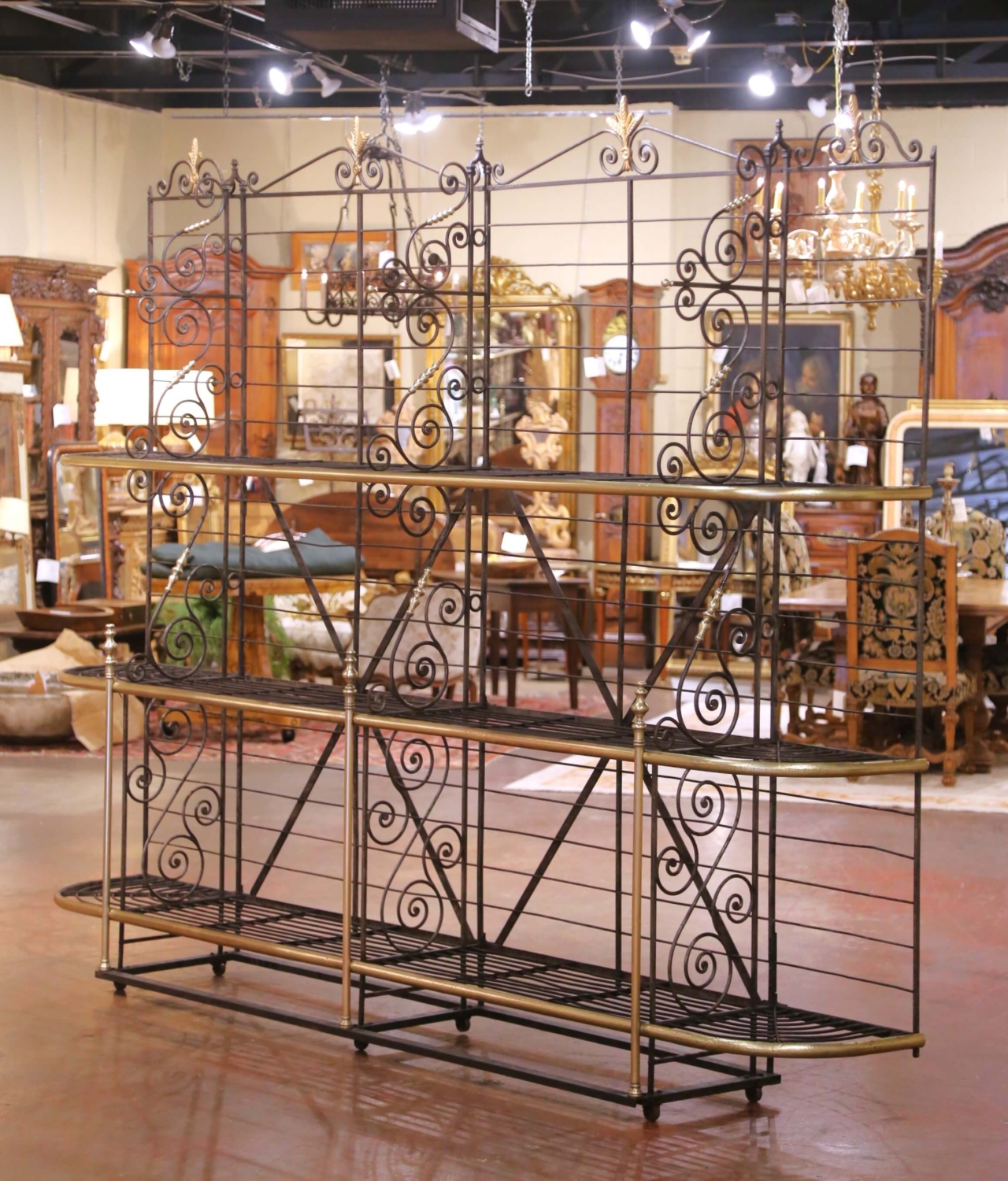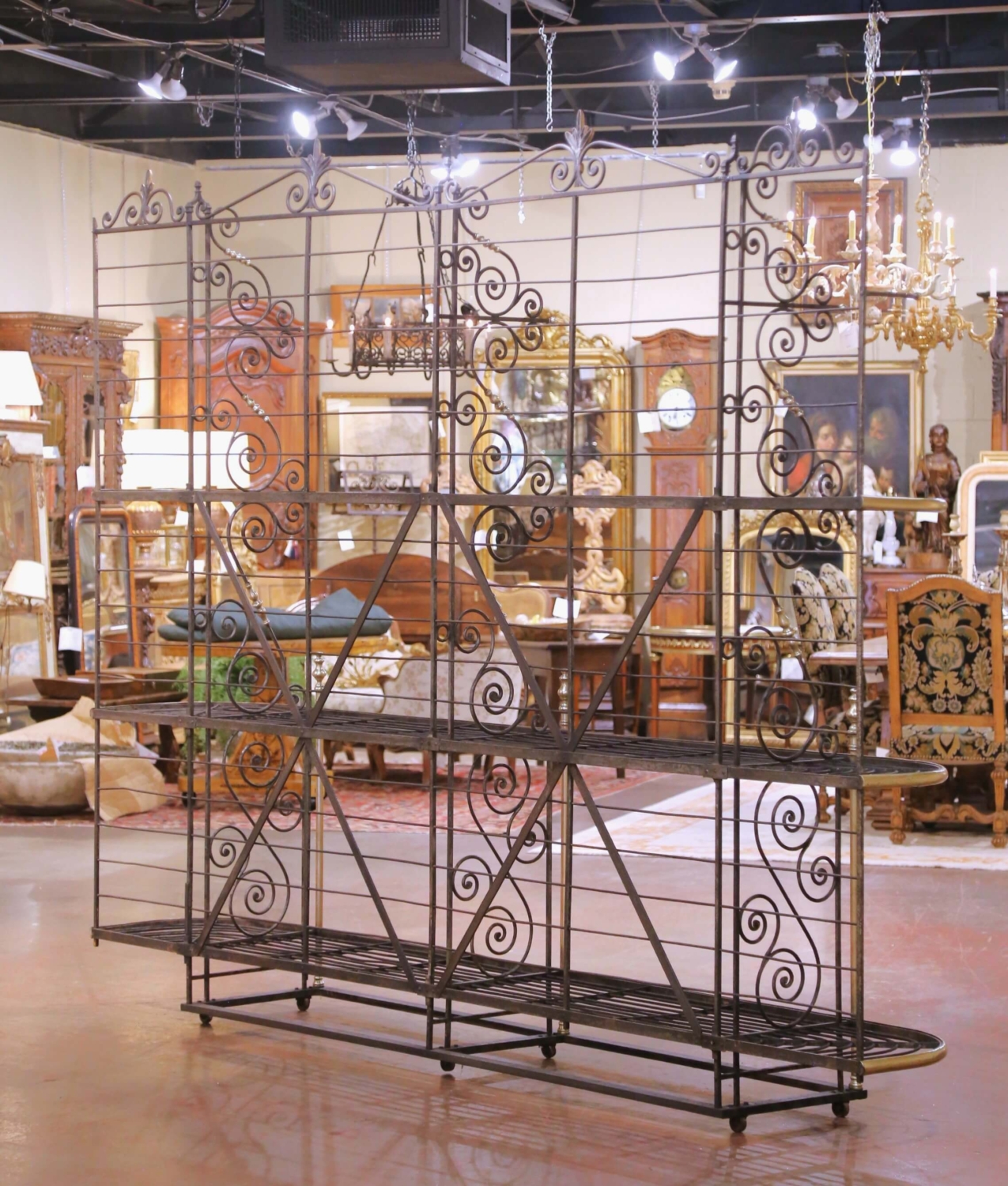 Add grandeur and functionality to your kitchen, dining room, or garden with this monumental antique baker’s rack. Crafted in France circa 1920, the nearly ten foot long étagère is hand-forged from sturdy wrought iron and enriched with decorative brass trim, turned finials, and rounded brass front rails. The frame features a exquisite dark patinated silver finish that highlights the scrolling motifs and lends the piece an elegant, subtly metallic sheen. The structure showcases beautifully formed “S” arabesques, curved end shelves with rounded corners, and cross-braced supports that provide both decorative interest and structural strength. Designed for both beauty and utility, the rack offers multiple tiers of open shelving ideal for displaying pottery, serveware, copper, or greenery. The dark silver patina and warm brass accents create a striking contrast, capturing the refined yet rustic character of early 20th-century French craftsmanship. For added practicality, the piece is set on six original iron caster wheels, allowing the entire unit to move easily for cleaning or rearranging a space. The baker’s rack is in excellent condition commensurate with age and use, and its aged finish enhances its timeless architectural presence. Measures: 118.25″ W x 19″ D x 94.75″ H.