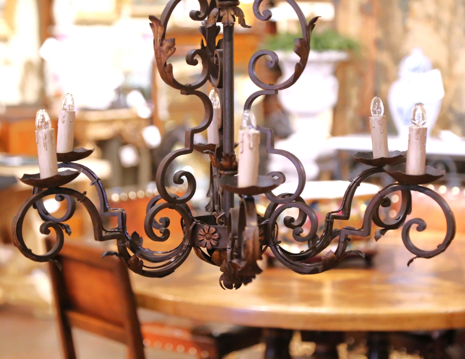 Crafted in France circa 1920, this elegant chandelier exemplifies the artistry of early 20th-century ironwork. The light fixture features a scrolled and symmetrical frame adorned with hand-forged floral and acanthus leaf motifs. Each of the six curved arms supports a candle-style light with decorative wax sleeves, arranged around a central stem embellished with repoussé rosettes and leaf appliqués. The dark patinated finish is enriched with gilt accents that highlight the intricate ironwork, creating a subtle play of light and depth. Newly wired for modern use, this chandelier combines rustic warmth with refined French craftsmanship, ideal for a dining room, entryway, or library with traditional or Old-World character. Measures: 28″ diameter x 28″ height.