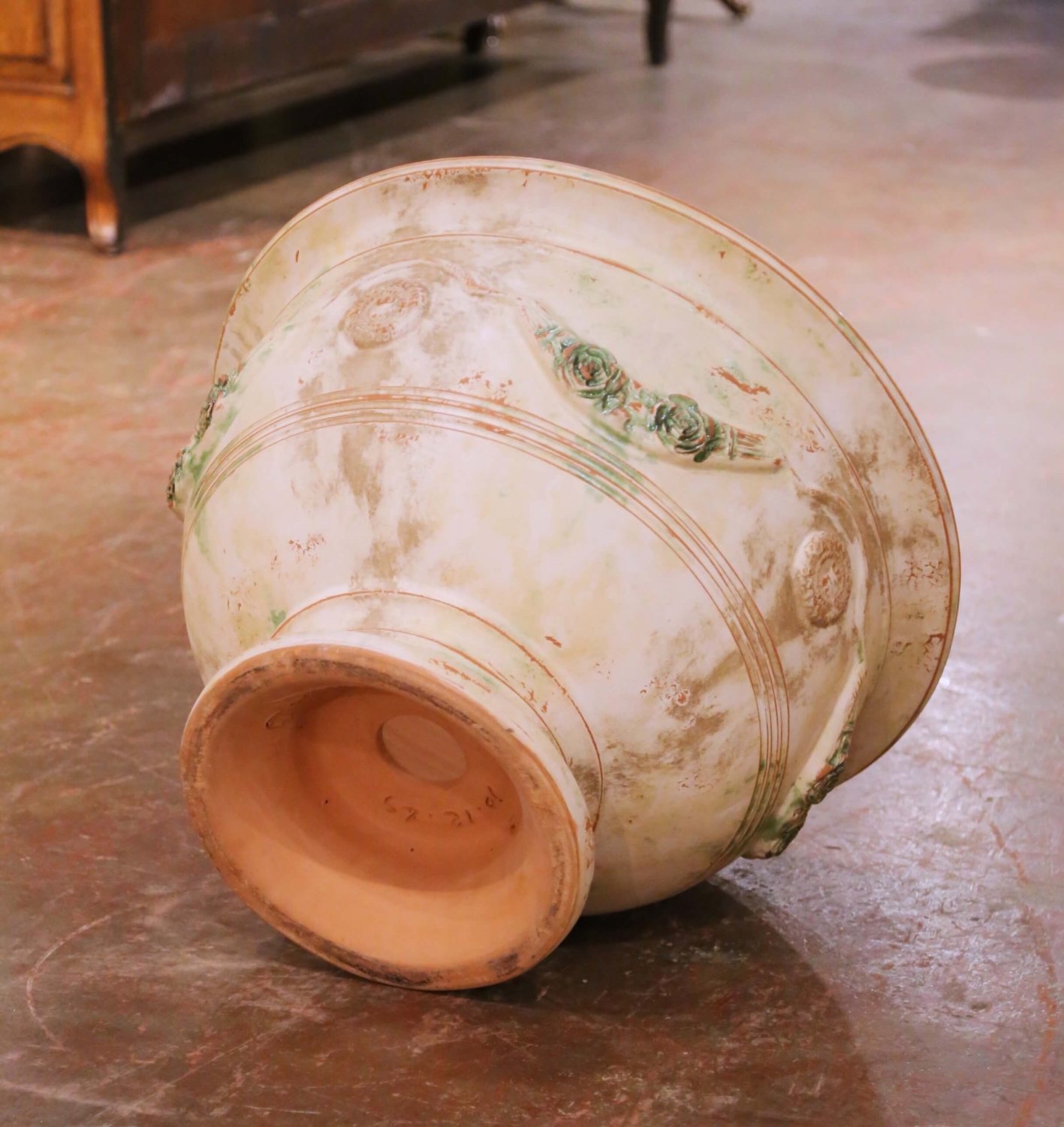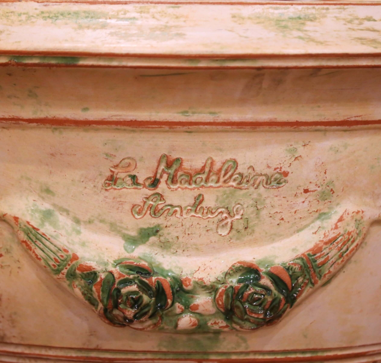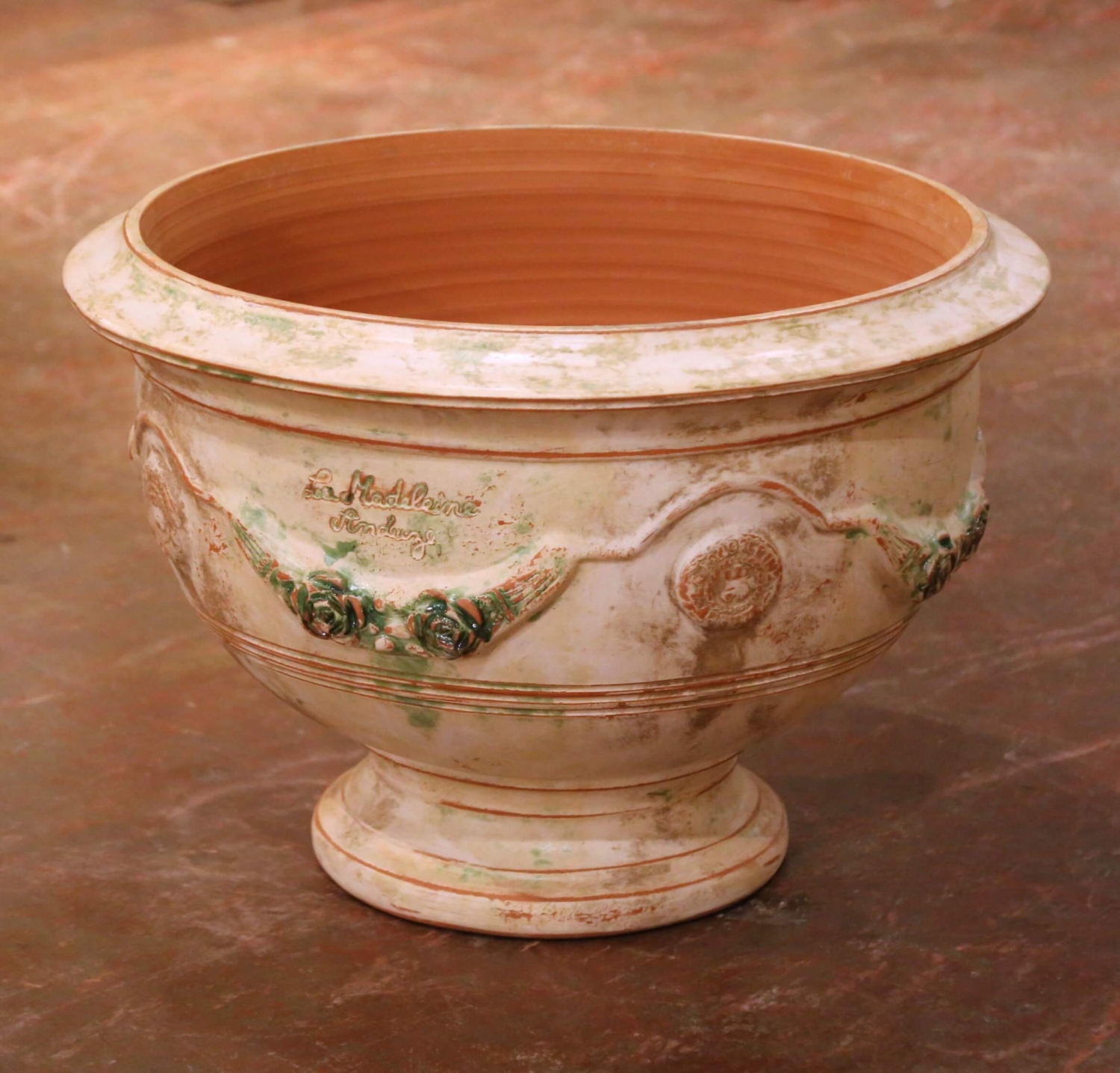 This impressive French hand-thrown terracotta planter was crafted in Anduze and bears the signature of La Madeleine à Anduze pottery. Modeled in the traditional campana form and raised on a circular pedestal base, the jardinière features a wide rolled rim and a gracefully tapering body adorned with molded medallions and scrolling garlands of roses in relief. The exterior is finished in a softly antiqued cream glaze with hand-applied green and warm terracotta accents, creating a beautifully weathered patina that evokes classic Provençal garden décor. The relief decoration is lively and dimensional, with stylized floral swags flanking circular cartouches. Subtle distressing and tonal variation across the surface enhance its rustic character while maintaining a refined decorative presence. The interior remains in natural fired terracotta and includes a central drainage hole, making the piece fully functional for planting. Stamped inside “La Madeleine Poterie Saint-Amand à Anduze”, this example reflects authentic French craftsmanship and traditional Anduze production techniques. It is in excellent condition commensurate with age and use, with intentional antiqued surface variation. Dimensions: 29.5” diameter x 20” height.