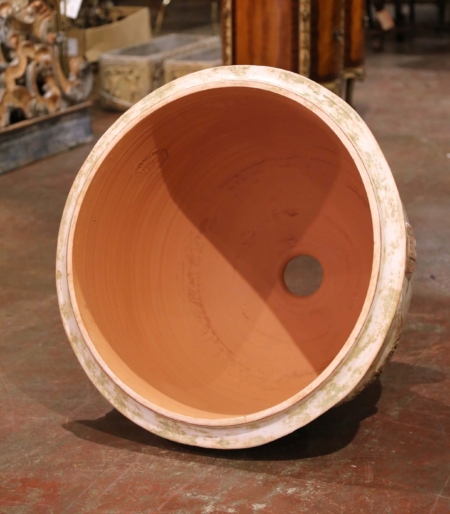 Elevate your garden or interior with this elegant handcrafted Anduze-style bowl planter by La Madeleine. Made in southern France, the planter showcases the iconic wide-rimmed silhouette rooted in 18th-century Provencal tradition, with a generous flared lip, rounded footed base, and signature decorative motifs including raised medallions and garland swags in bold relief. Finished in a soft cream wash with subtle green and terracotta undertones, the vessel exhibits an aged weathered patina that lends it the charm and character of antique gardenware. The hand-applied glaze and distressed surface evoke the timeworn beauty of classical French pottery. The planter is signed “La Madeleine Anduze” and features a drainage hole at the base for functional planting. In excellent condition commensurate with age and artisanal craftsmanship, this sculpture is ideal for flanking an entryway, anchoring a terrace, or adding historical Provençal flair to a sunroom or formal garden. The timeless design blends effortlessly into traditional, Mediterranean, or French country settings. Measures: 32.25″Diameter x 24.5″H