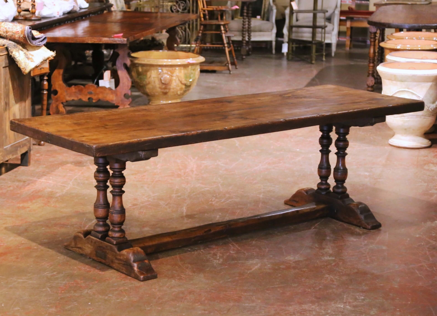 This French Louis XIII style monastery dining table was crafted in the Pyrenees region of France circa 1950 using authentic 18th-century antique walnut timbers. The table carries a deep, distinctive patina that only historic wood can develop, with rich color variation, softened edges, and surface texture earned through centuries of age. The long rectangular top is constructed from two wide planks of walnut, offering strong visual symmetry, expressive grain, and natural age markings throughout. The surface retains a warm, wonderful walnut patina that gives the table immediate presence and authenticity. The substantial trestle base features hand-turned baluster legs, molded shoe feet, and a thick cross stretcher for strength and stability. The solid architectural form reflects the traditional Louis XIII monastery table, prized for durability and timeless simplicity. In excellent condition commensurate with age and use, this antique French dining table comfortably seats eight to twelve people. Ideal for a dining room, kitchen, or wine cellar, it delivers the character of 18th-century wood with the reliability of later construction. Dimensions: 94.75″W x 31.5″D x 29.5″H