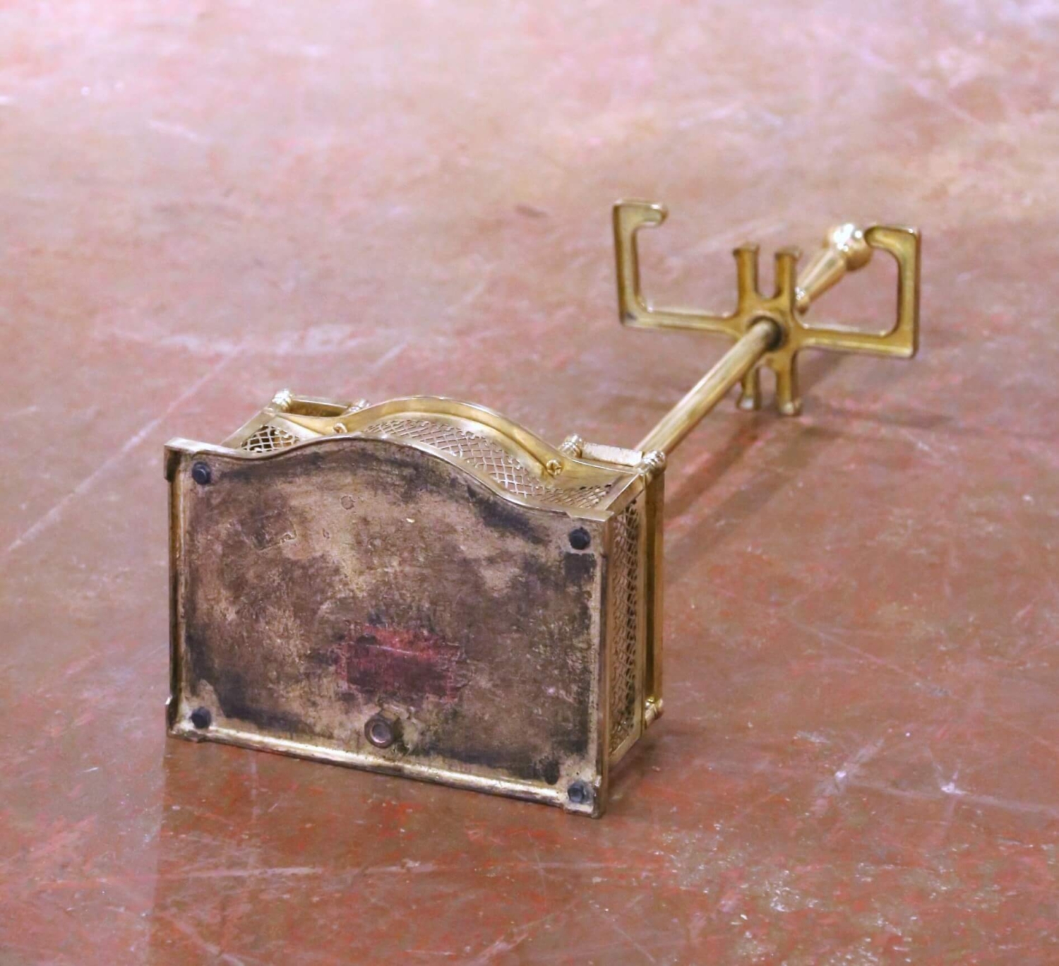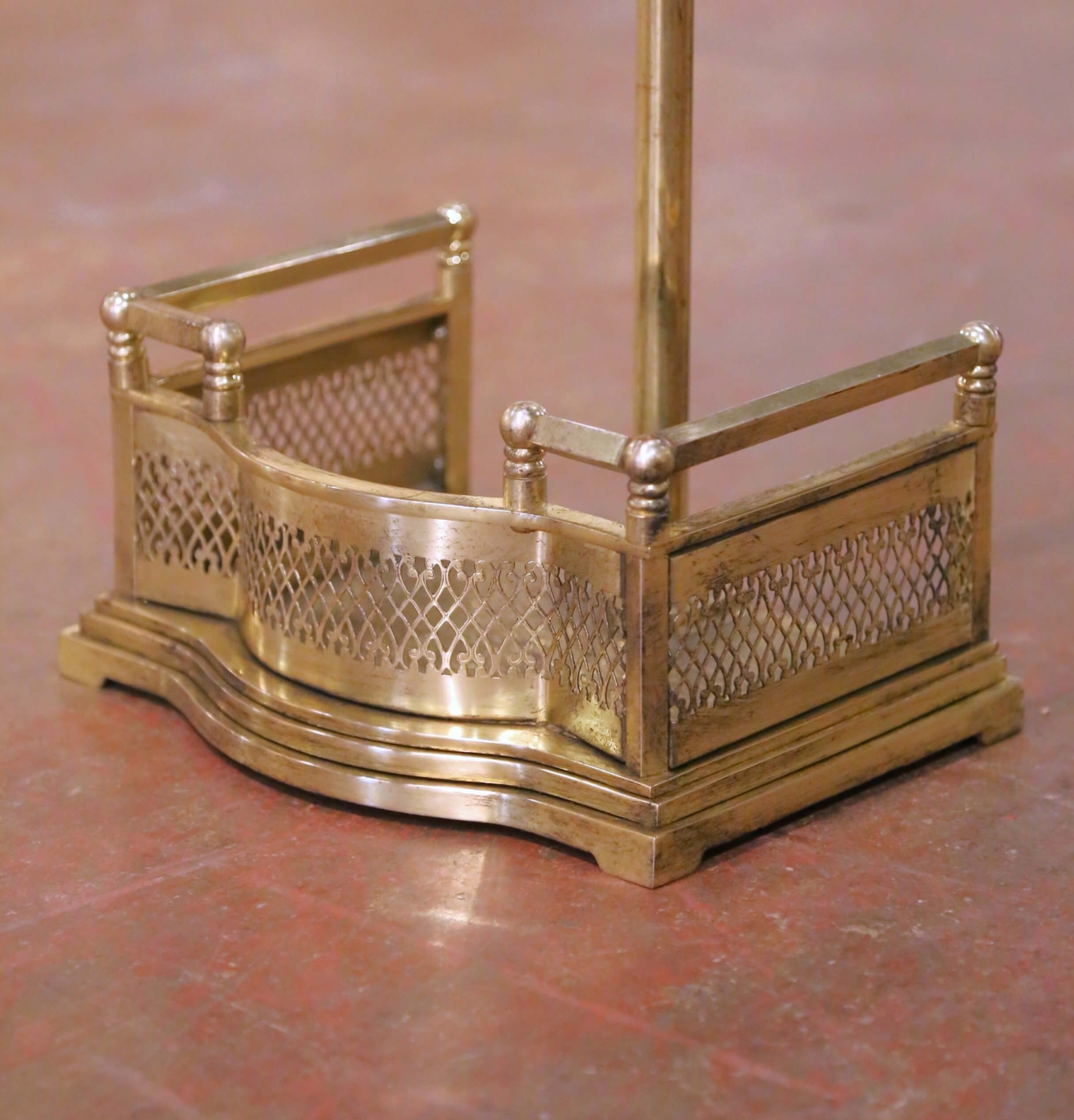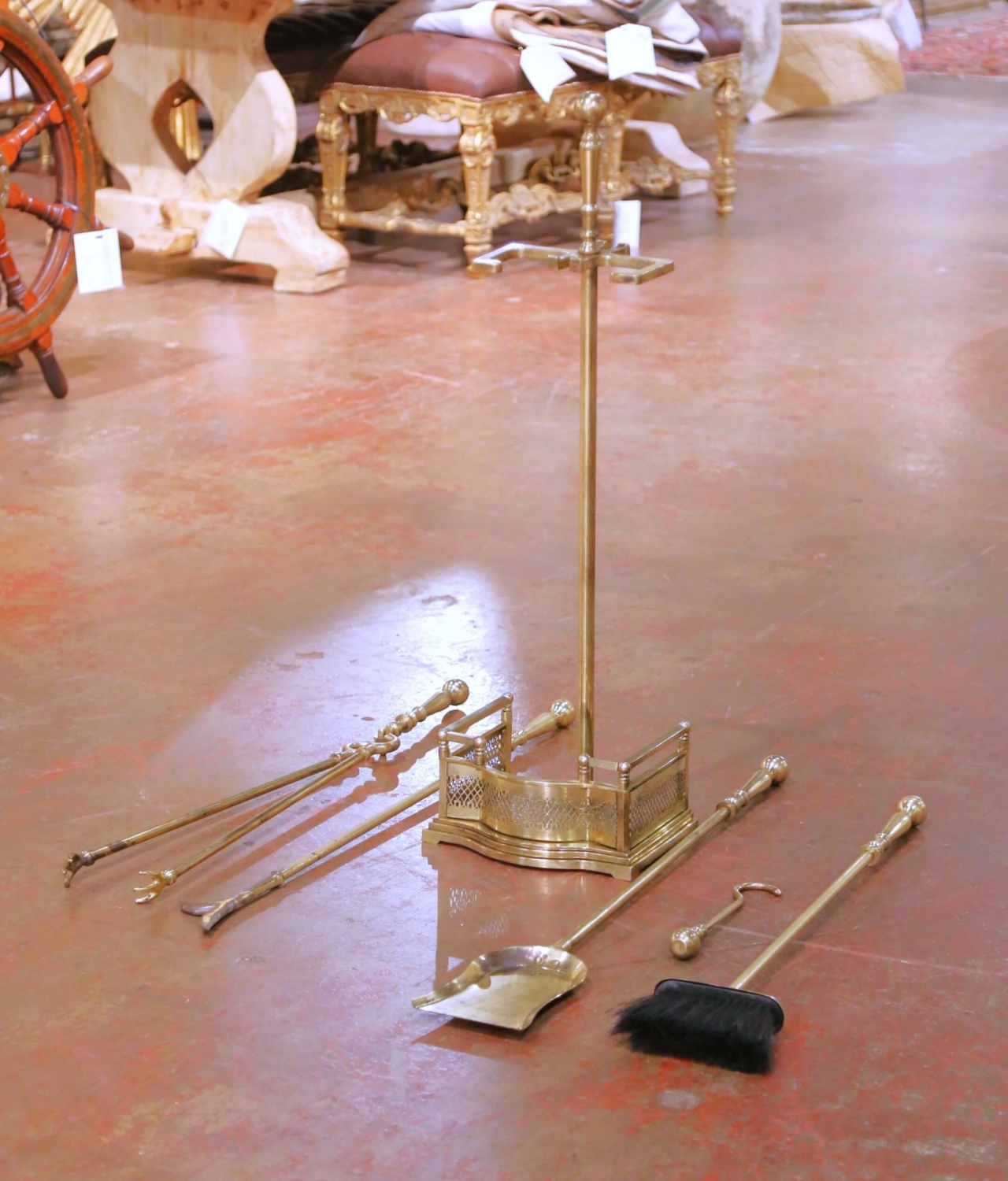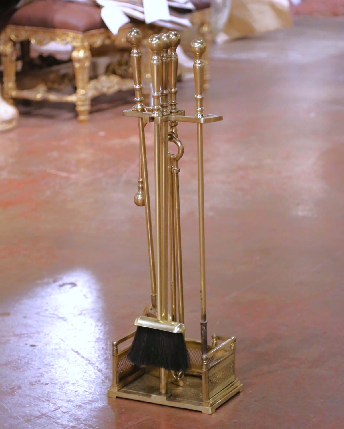 The tools rest on a tall central post fitted with brass brackets, rising from a shaped base enclosed by a pierced Louis XVI–inspired gallery. The warm, gleaming brass finish enhances the architectural lines and gives the piece the presence of an older antique example while offering the durability of a late 20th-century construction. The set is in excellent condition commensurate with age and use and brings both beauty and practicality to any living room, library, or study.