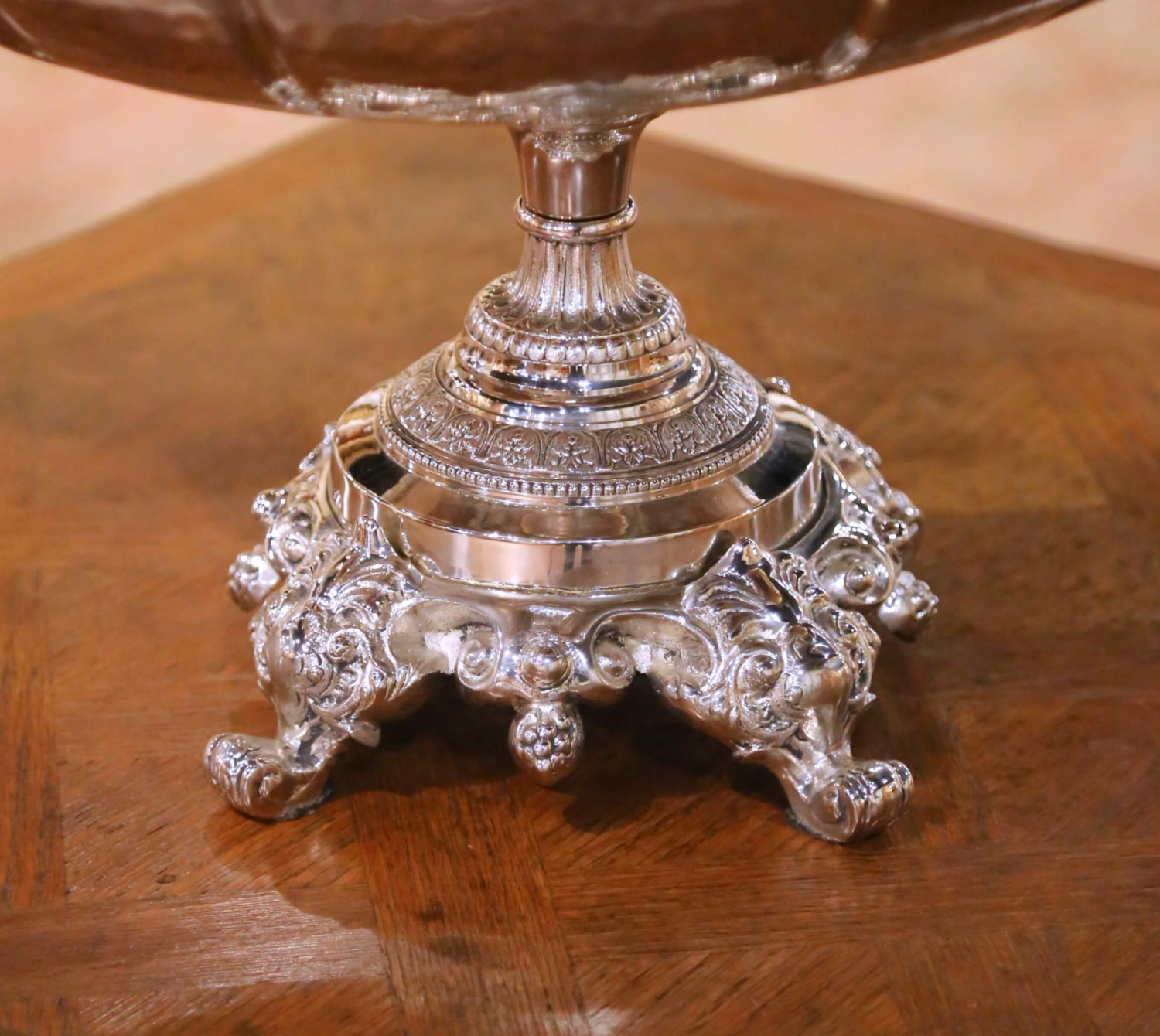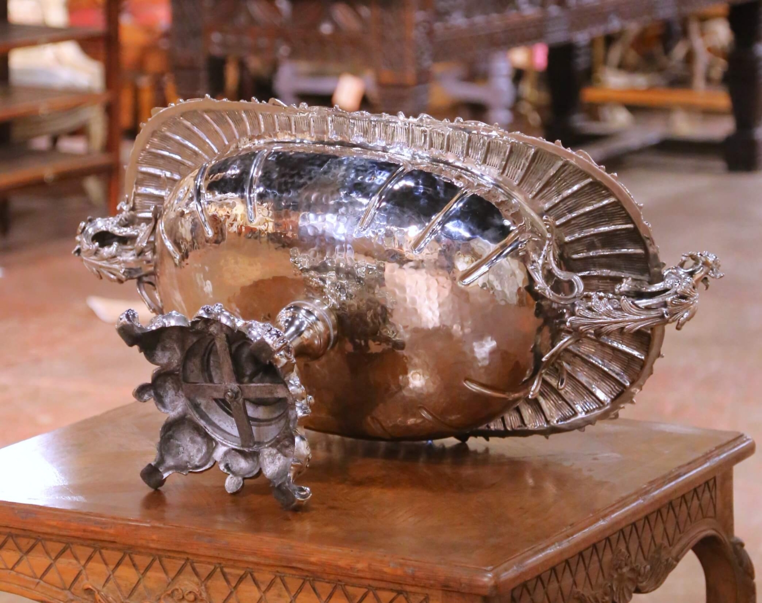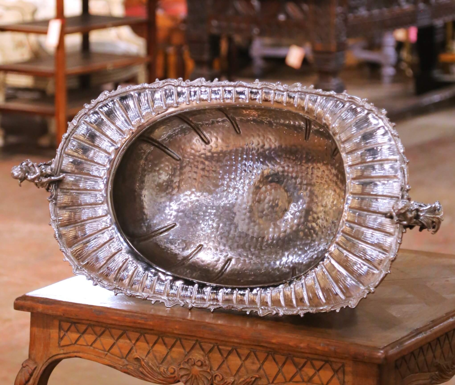 This large French Rococo style wine cooler was crafted circa 2000 and is executed in silver plate with strong decorative presence and refined sculptural detail. The elongated oval basin features a hammered body framed by a richly undulating, fluted rim; each side is fitted with scrolling handles terminating in finely modeled putti finials, lending the piece a playful yet elegant character inspired by 18th century French ornamental traditions. The bowl is raised on a tall turned stem set over a stepped pedestal base, lavishly decorated with scrolling foliage, shell motifs, and voluted feet that provide excellent balance and visual weight. The interior is generously proportioned, making this piece especially well suited for chilling multiple bottles of wine or champagne with ice during entertaining. Finished in bright silver plate with a soft, even patina, the chiller is in excellent vintage condition with light surface wear consistent with age and use. While ideal as a wine or champagne chiller, it may also be used as a decorative centerpiece or an indoor jardinière for floral arrangements in a dining room, bar, or wine cellar. Dimensions: 30.5″W x 15″D x 18.5″H