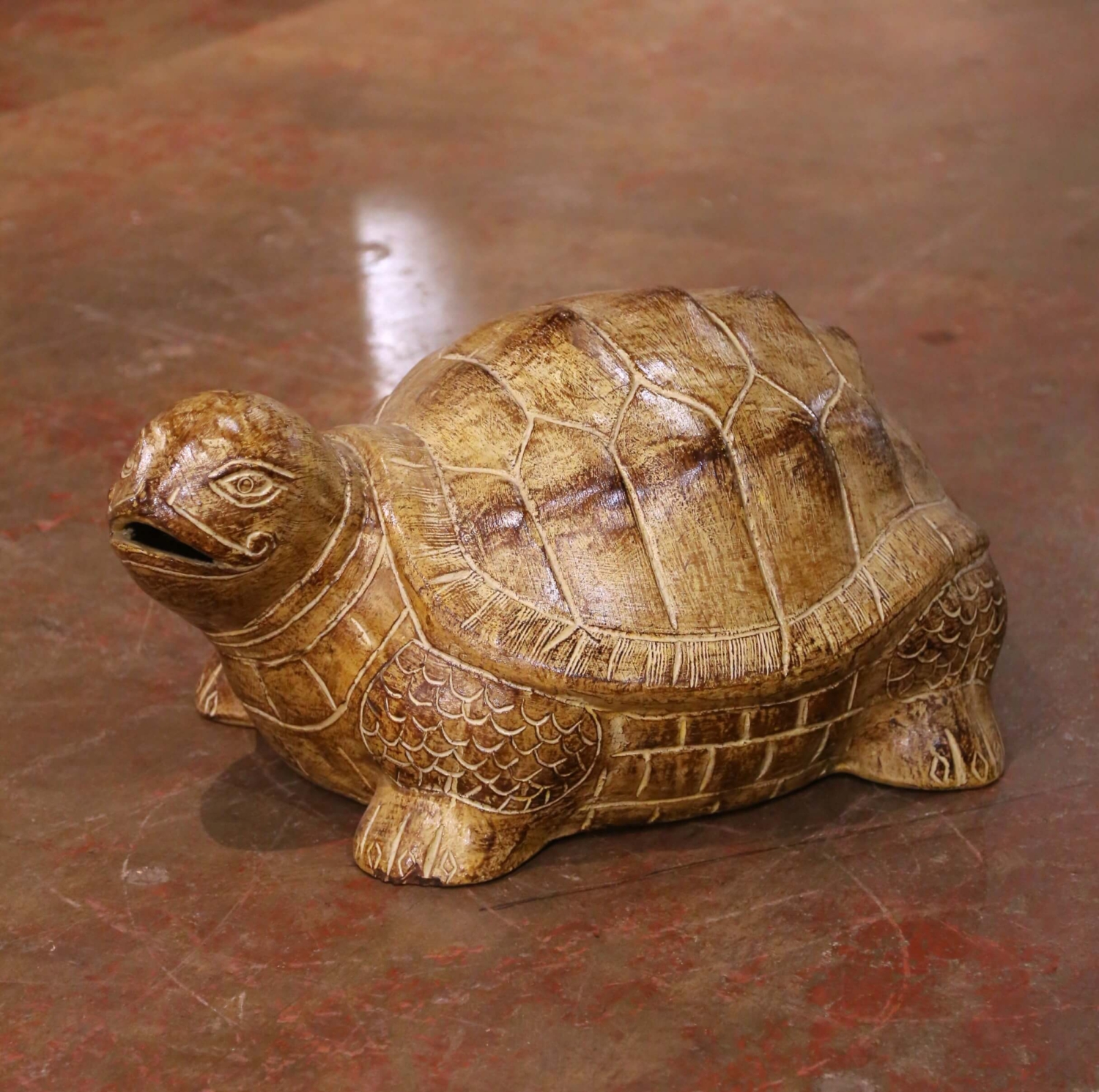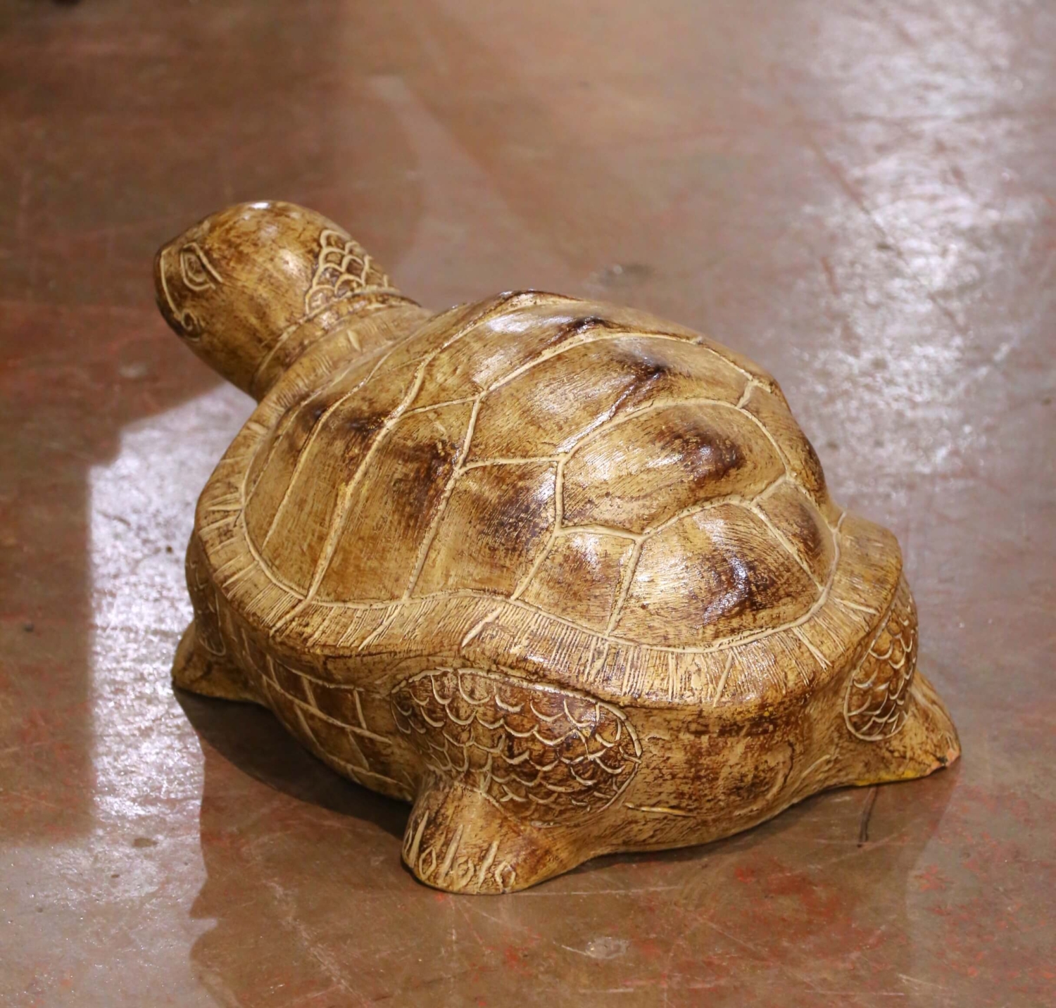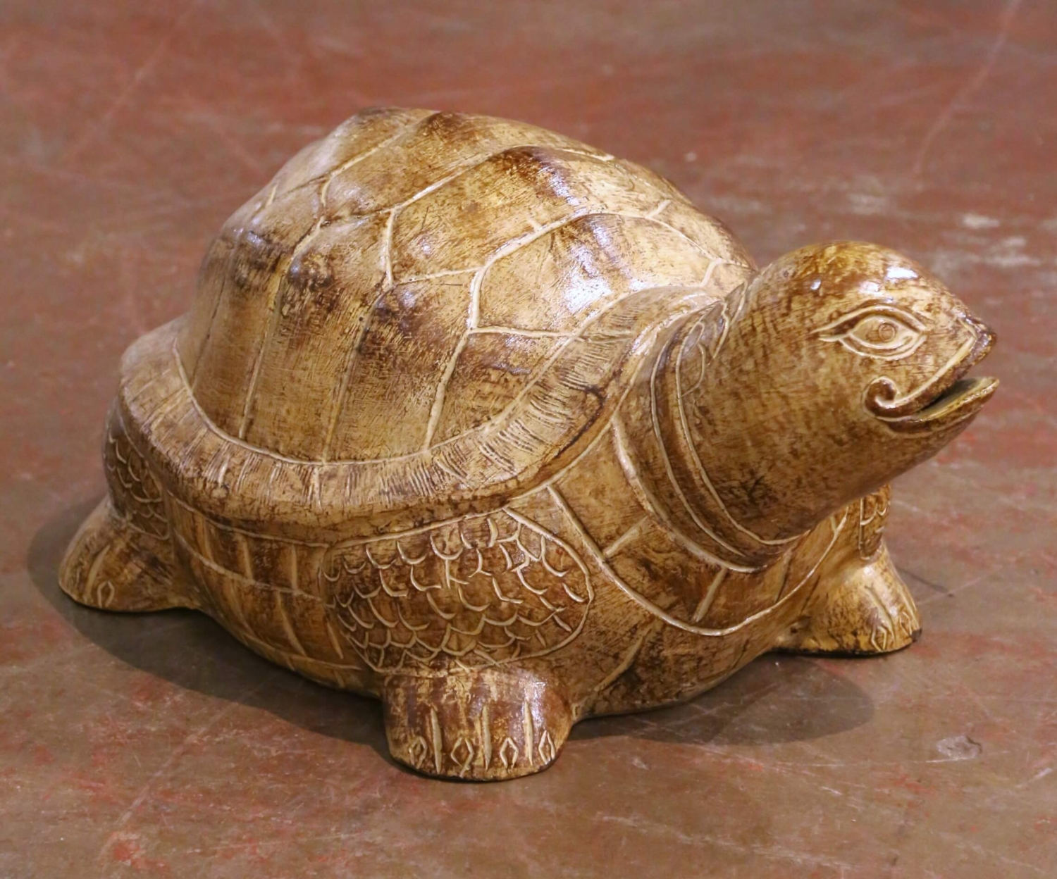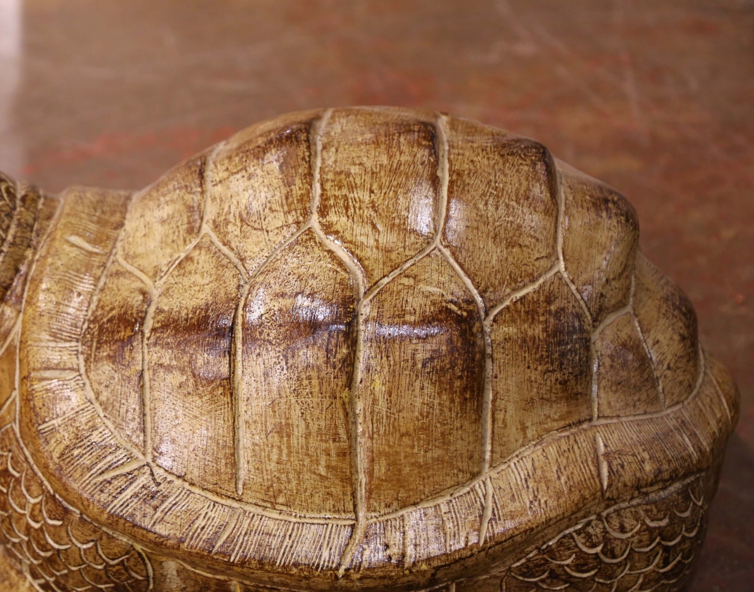 Decorate a patio, garden, or interior space with this whimsical large turtle sculpture. Crafted in France circa 2010, the terracotta Tortue features a stylized hand-carved shell and finely incised scale details along the legs and head. Resting solidly on its flat base, the sculpture exudes a sense of balance and serenity. The beige glaze with hand-rubbed highlights and worn edges reveals a beautiful aged patina, giving the piece a timeless, antique appeal. Subtle variations in tone and texture showcase the artisan’s hand, enhancing its sculptural charm. Symbolizing longevity and stability, this characterful turtle would lend warmth and natural personality to a veranda, sunroom, or garden landscape. The piece is in excellent condition commensurate with age and use, and features a richly textured, rustic finish. Measures: 18” W × 26” D × 12” H. Weight: 41 lbs.