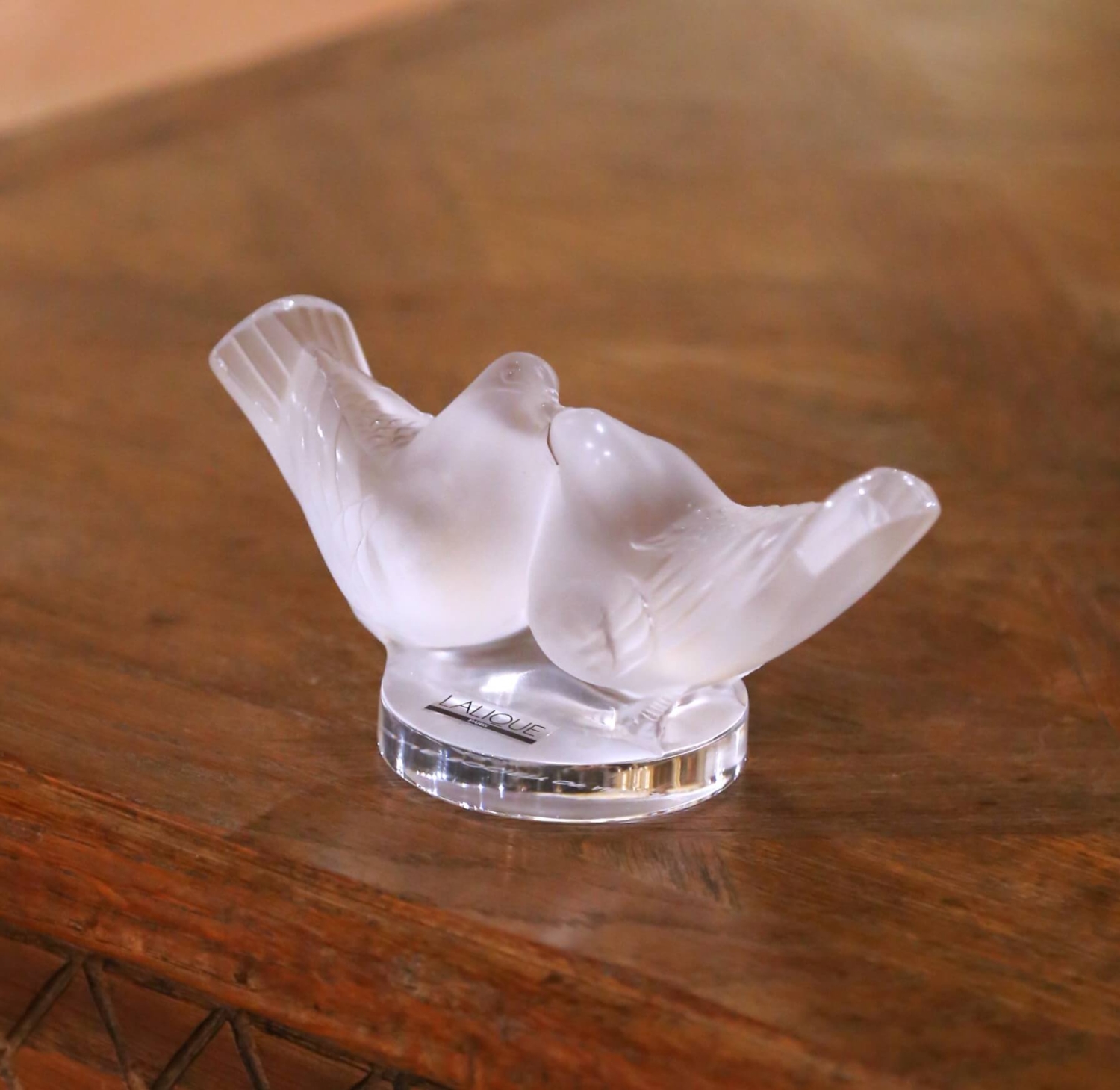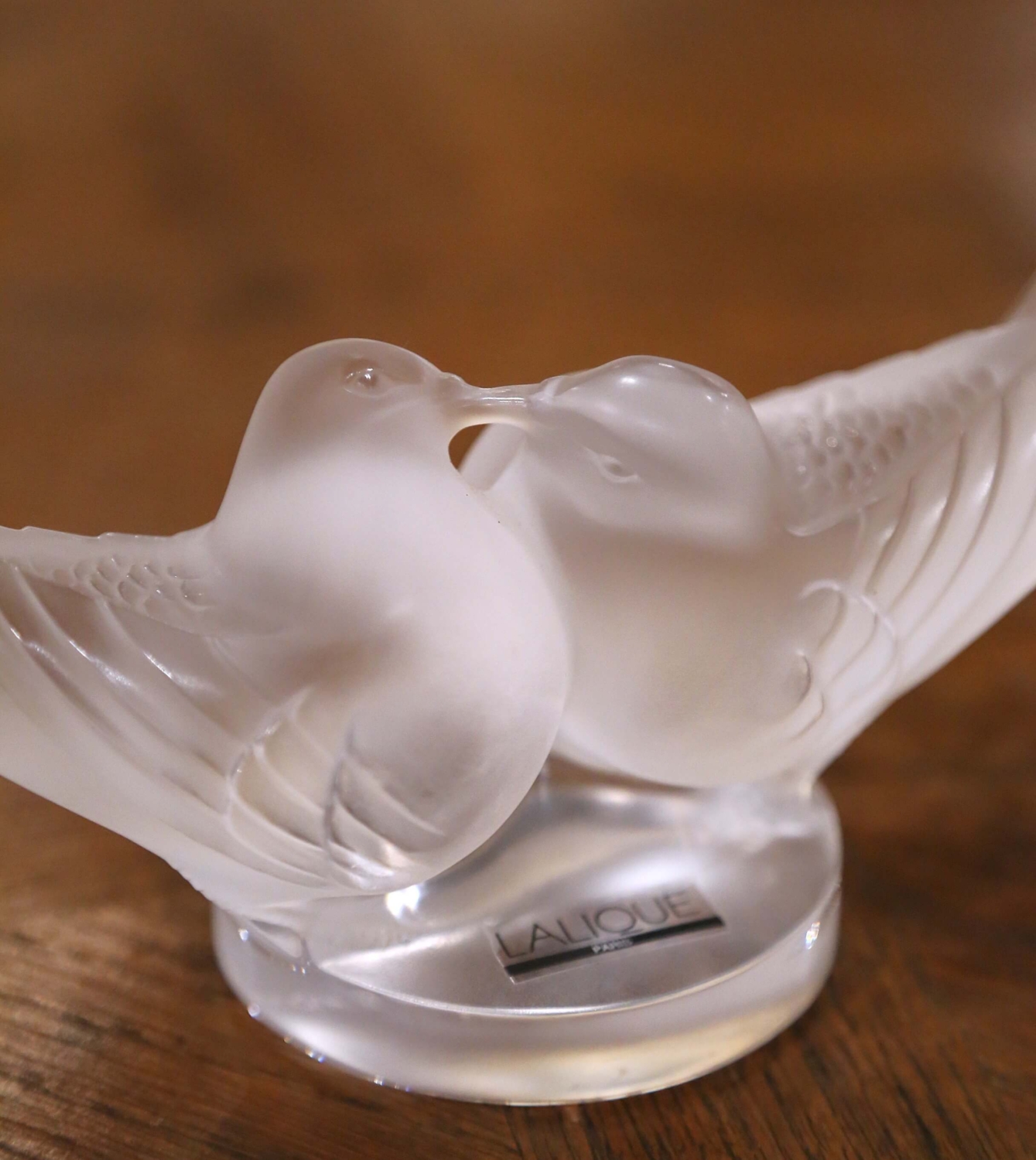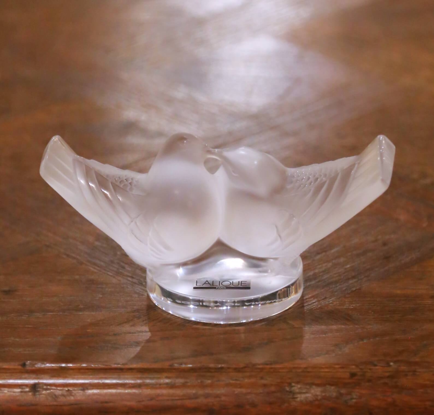 This elegant Lalique crystal sculpture depicts two doves gently touching beaks, their wings partially outstretched in a graceful gesture of affection. Executed in frosted and clear crystal, the birds are beautifully modeled with soft, rounded bodies and finely detailed wings, creating a delicate interplay between satin-finished surfaces and polished transparency. The sculptural composition rests on a circular clear crystal base, giving the piece stability while enhancing the luminous quality for which Lalique is renowned. The underside bears the Lalique Paris label and is engraved “Lalique Society of America 1993,” indicating a commemorative edition produced for members of the Lalique Society. The refined execution and romantic symbolism are characteristic of Lalique’s enduring Art Deco–inspired aesthetic, reinterpreted in late 20th century production. The crystal remains in excellent condition. A timeless decorative accent, ideal for a vanity, bedside table, desk, or as a meaningful gift symbolizing love and partnership. Dimensions: 6”W x 2.75”D x 3”H.