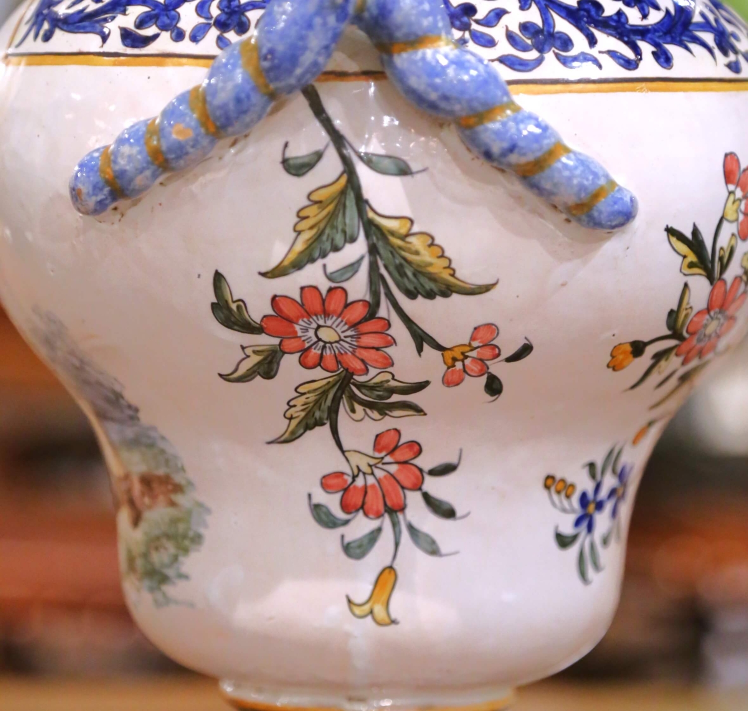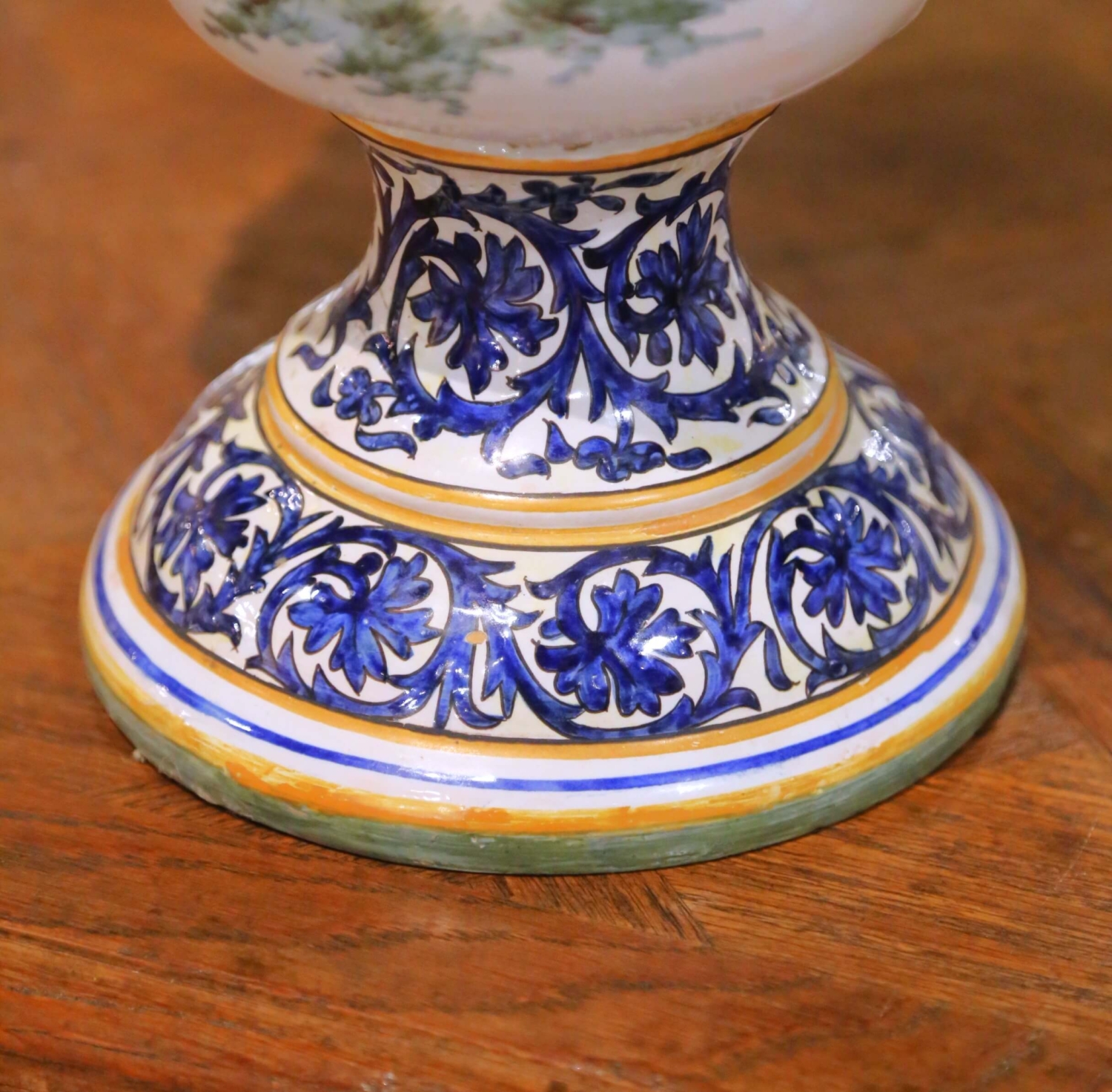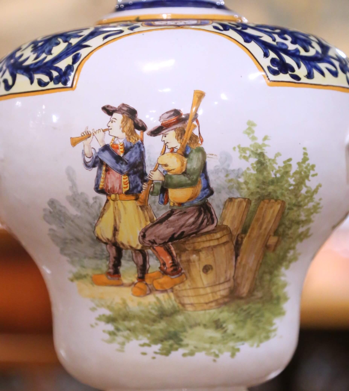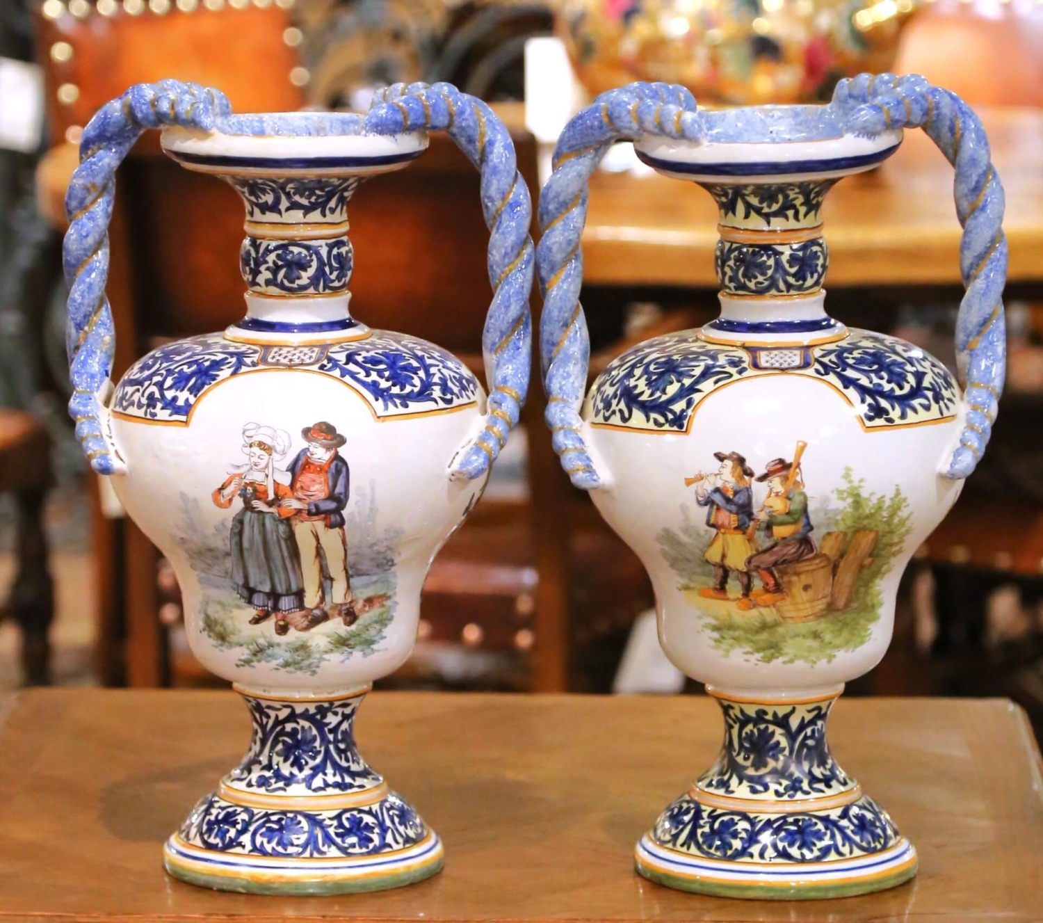 Decorate a console, sideboard, or enfilade with this charming pair of hand-painted French faience urns from Desvres. Crafted in northern Francecirca 1880, each large baluster-form vessel features an elegant flared neck, pedestal base, and distinctive twisted rope handles highlighted in speckled blue. The pieces are richly adorned with cobalt foliate scrolls, floral sprays, and gilt accents typical of the region’s decorative vocabulary. Each tall vase showcases a different pastoral scene inspired by Breton folk life: one depicts a Breton man and woman standing together in regional costume, while the other shows two musicians seated outdoors, one playing a cornemuse (bagpipe) and the other a wooden flute. These figural vignettes are executed with lively brushwork and soft coloration, capturing the romanticism associated with late-19th-century Breton-themed faience. One urn remains unsigned, while the other is marked “Por Michel” on the underside, an attribution linked to one of the decorators active in the Desvres workshops. During the 19th and early 20th centuries, the town of Desvres became one of France’s most important faience-producing centers, renowned for its vibrant glazes, folkloric subjects, and reinterpretations of earlier Rouen and Nevers styles. Artisans such as Michel were skilled decorators often working within family ateliers or in association with larger factories including Fourmaintraux and Masse. Excellent overall condition commensurate with age and use. Minor glaze imperfections and small kiln marks typical of hand-thrown faience. Colors remain fresh and vibrant. Dimensions: 11″W x 9″D x 18″H