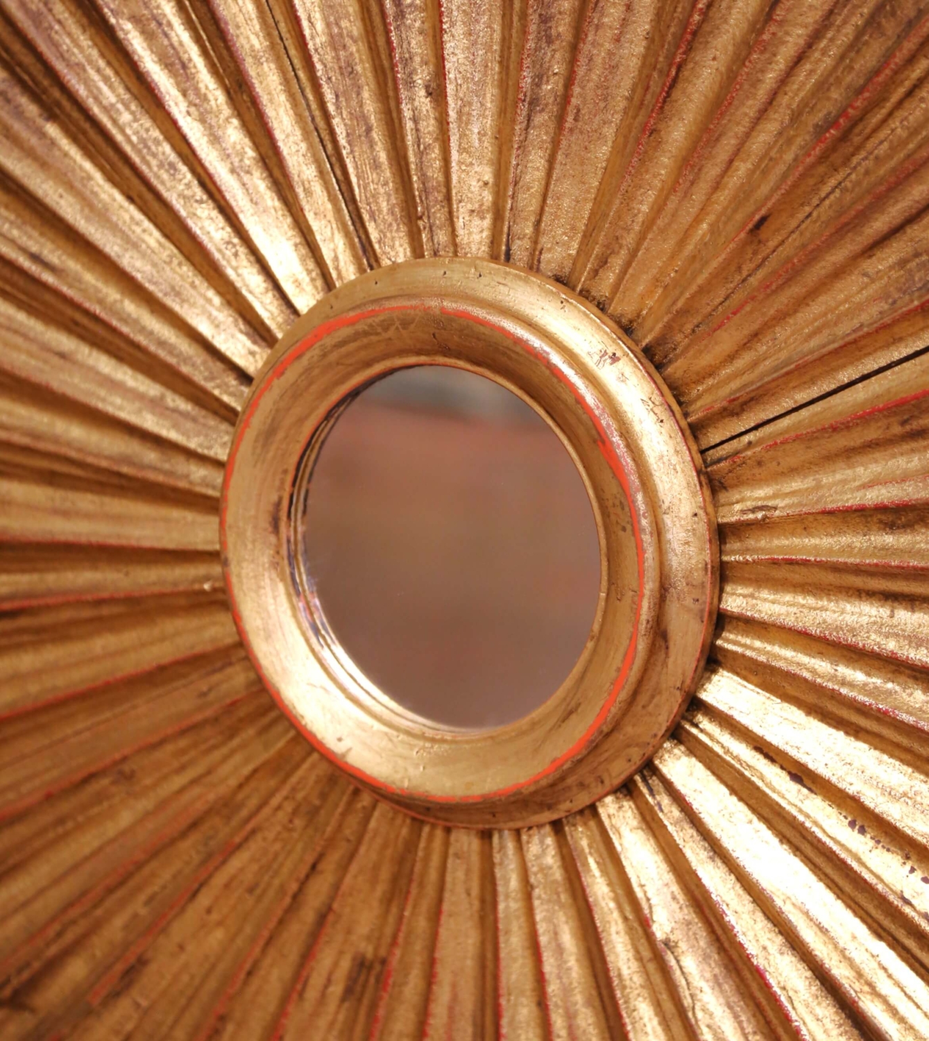 Add radiant elegance to your home with this impressive circular sunburst mirror. Hand-carved in Italy circa 2010, the piece measures over five feet in diameter and features a striking four-tier composition of elongated rays emanating from a central round mirror. The small inset mirror plate is framed by a molded ring with rope-like carving, emphasizing the mirror’s celestial inspiration. Each giltwood ray is meticulously sculpted, with the outermost layer set at a slight angle to create exceptional depth and shadow. The mirror displays a beautiful antique-style patinated gilt finish with subtle red undertones (bole), enhancing its warmth and visual richness. The back retains its original metal hanging hardware for secure wall display. This large and decorative mirror is in excellent condition commensurate with age and use. A timeless statement piece inspired by the splendor of the French Roi Soleil era, this sunburst mirror brings dramatic light and classical grandeur to any interior, ideal above a mantel, console, or entryway commode. Measure: 62.5″ diameter.
