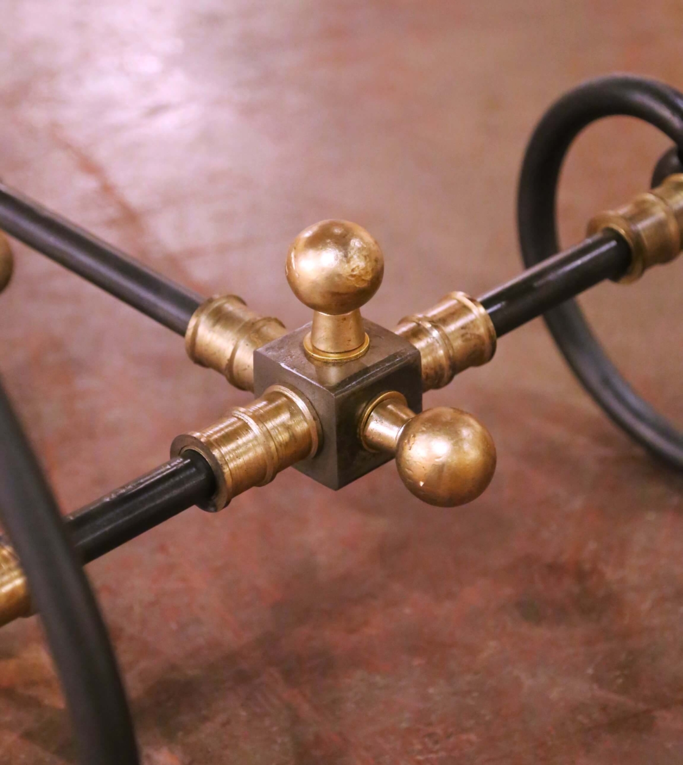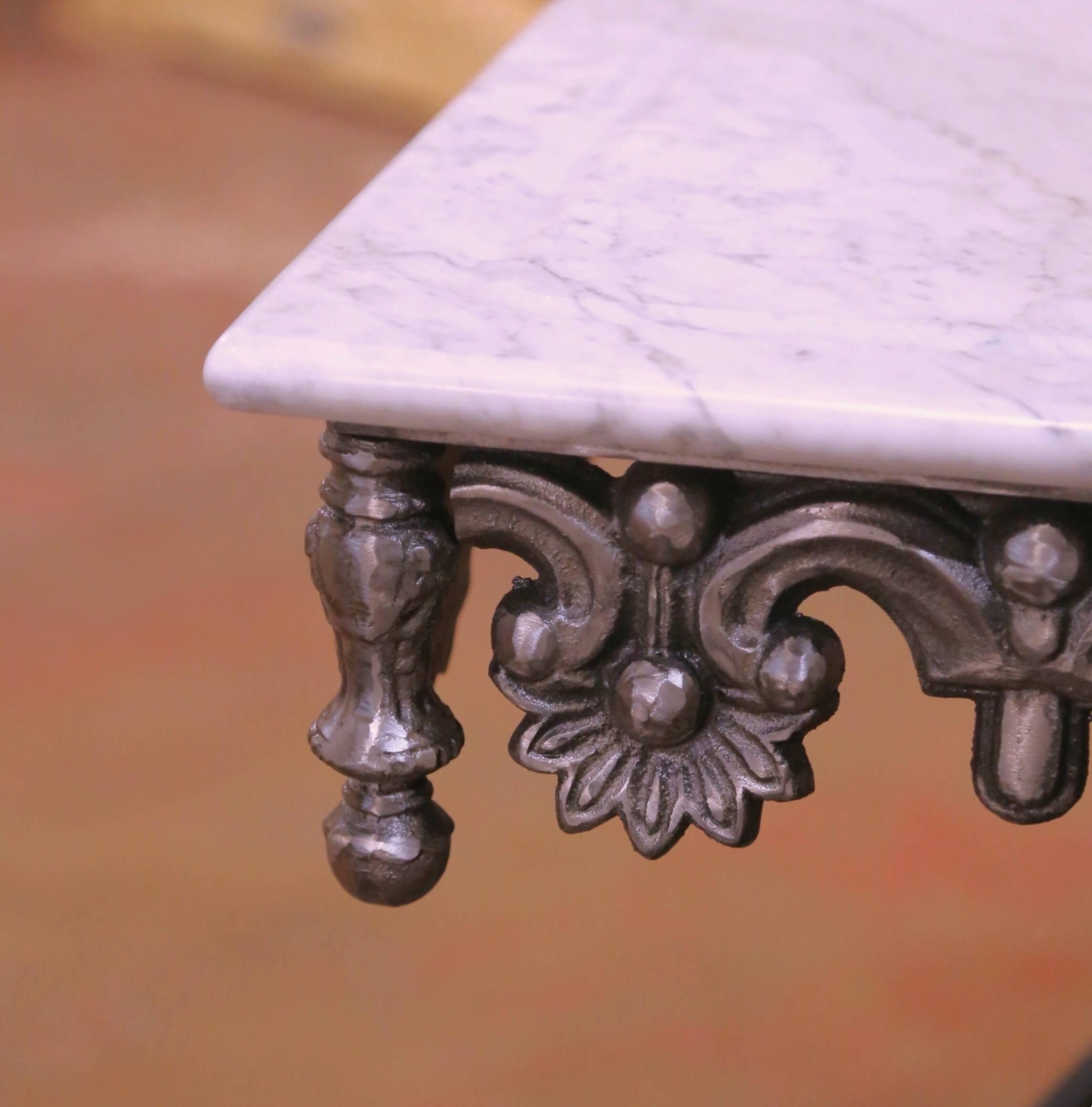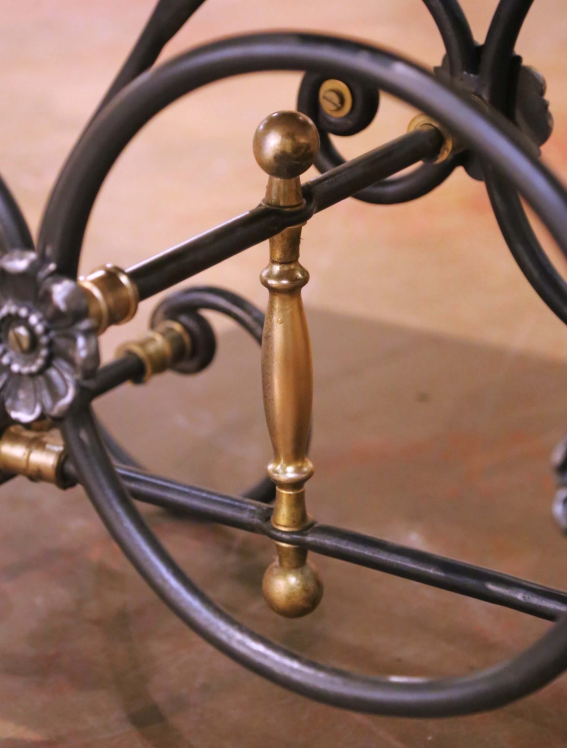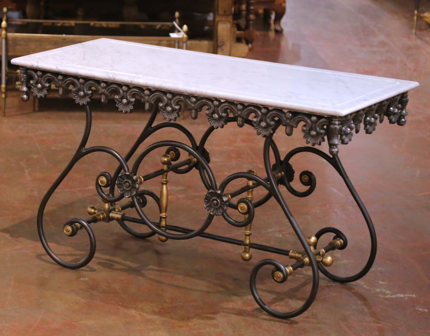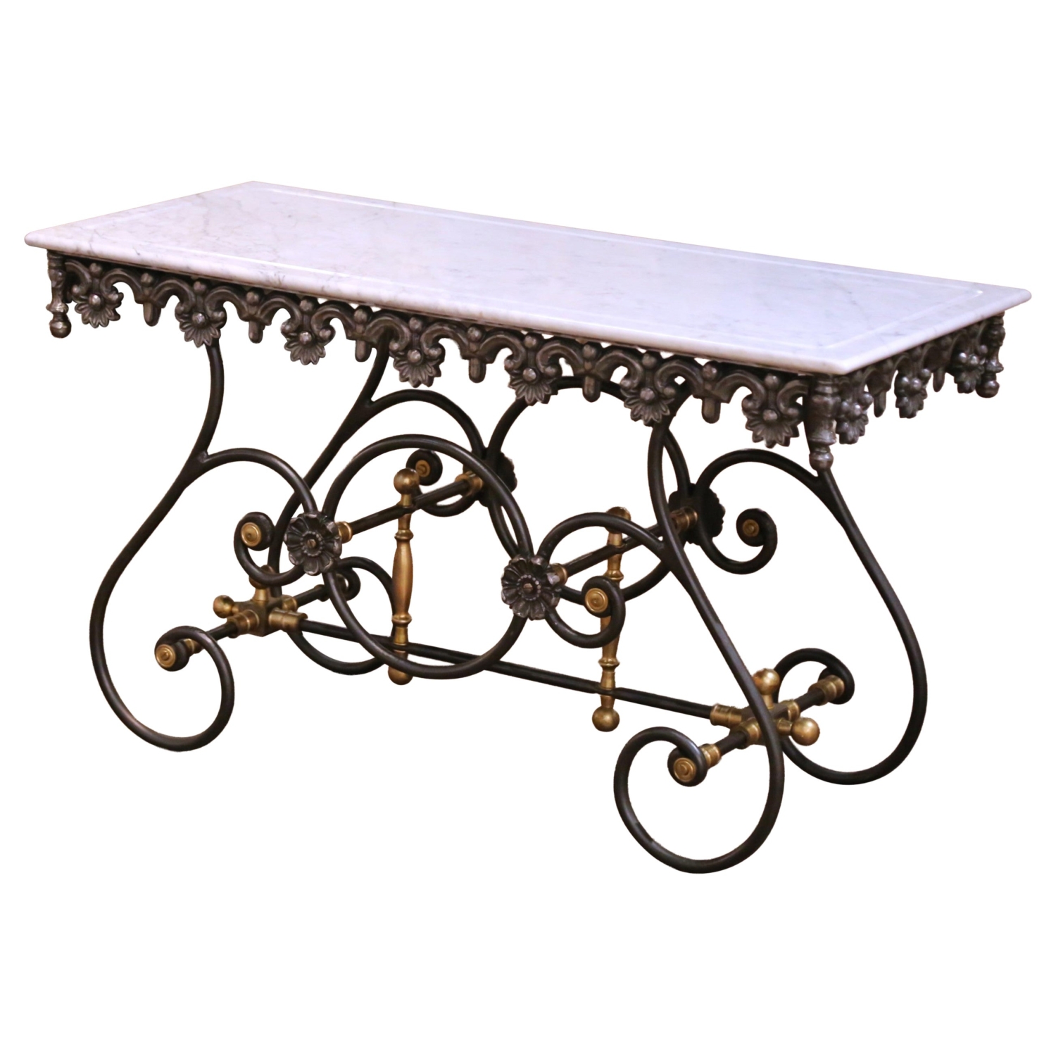 This elegant antique-style French pastry table, inspired by the traditional table de boucher, offers a refined and functional surface suited for a kitchen, bar, or entry. Crafted circa 1990, the piece combines classic French ironwork with a balanced, architectural silhouette. The hand-forged iron base stands on gracefully scrolled legs joined by a stretcher, accented with turned brass finials and decorative medallions that introduce warmth and contrast. The apron is richly detailed with a continuous frieze of floral and scroll motifs, giving the table a sculptural presence from every angle. The iron base is finished in a rich, polished patina, with soft reflective highlights that enhance the depth and craftsmanship of the forged metal. The rectangular white marble topn is inset within a molded edge and finished with a perimeter groove, a traditional feature found on butcher and pastry tables designed to contain liquids. The surface shows subtle, natural veining and a smooth, honed finish. This antique-inspired French table is in excellent condition commensurate with age and use, with a beautifully maintained polished iron finish and clean marble surface. Ideal as a narrow kitchen island, console, or serving table, it brings both decorative elegance and practical function to an interior. Dimensions: 51.75″W x 23″D x 29.75″H