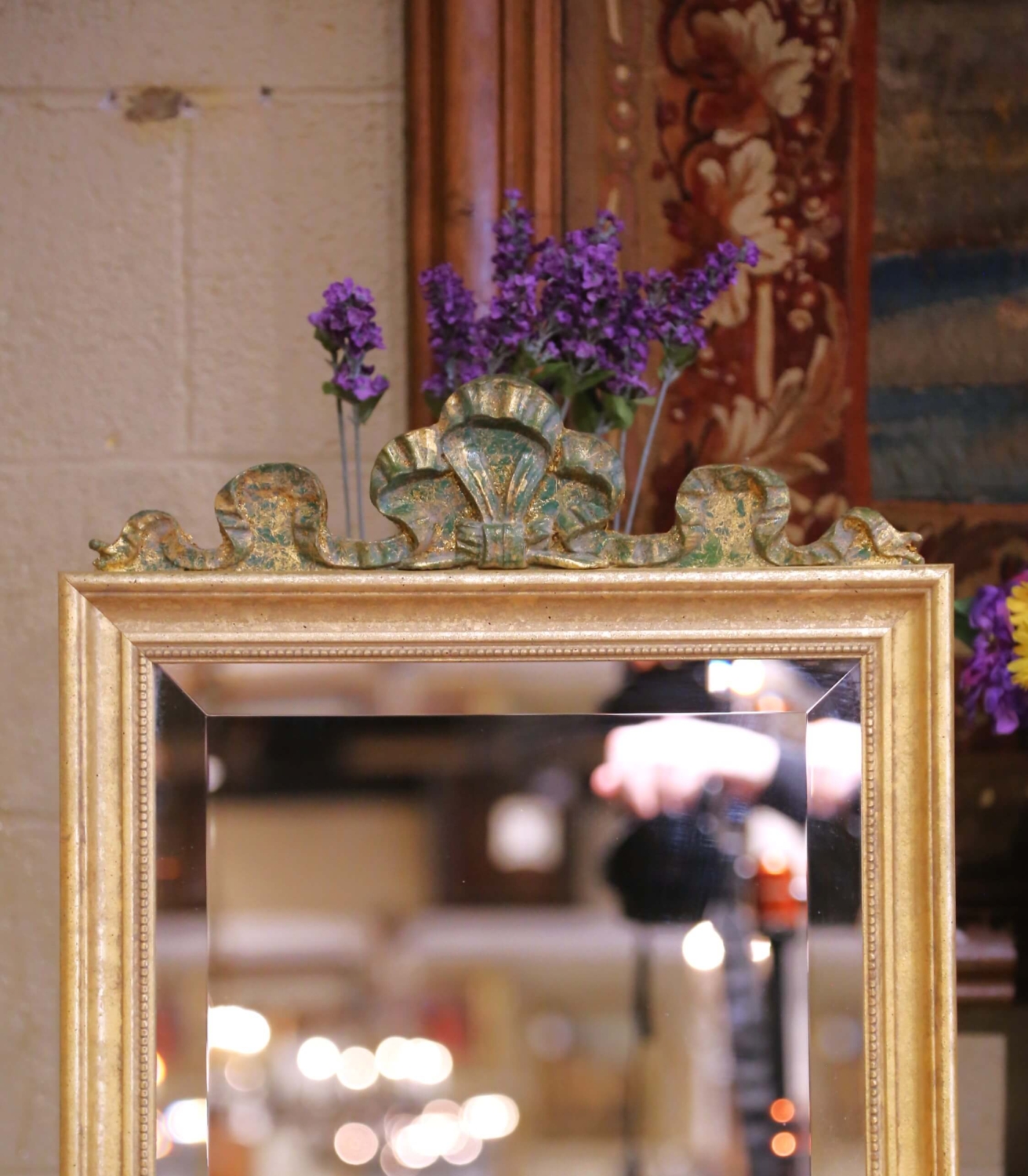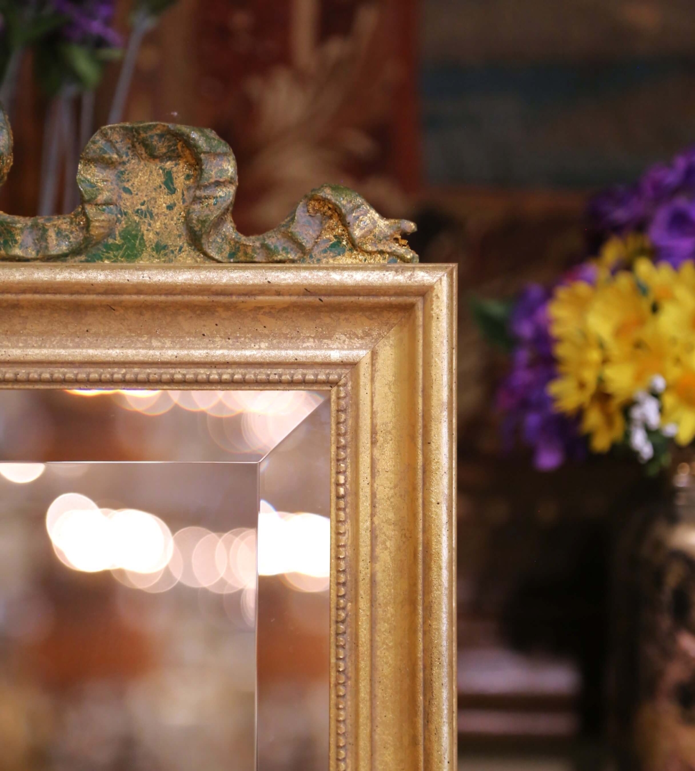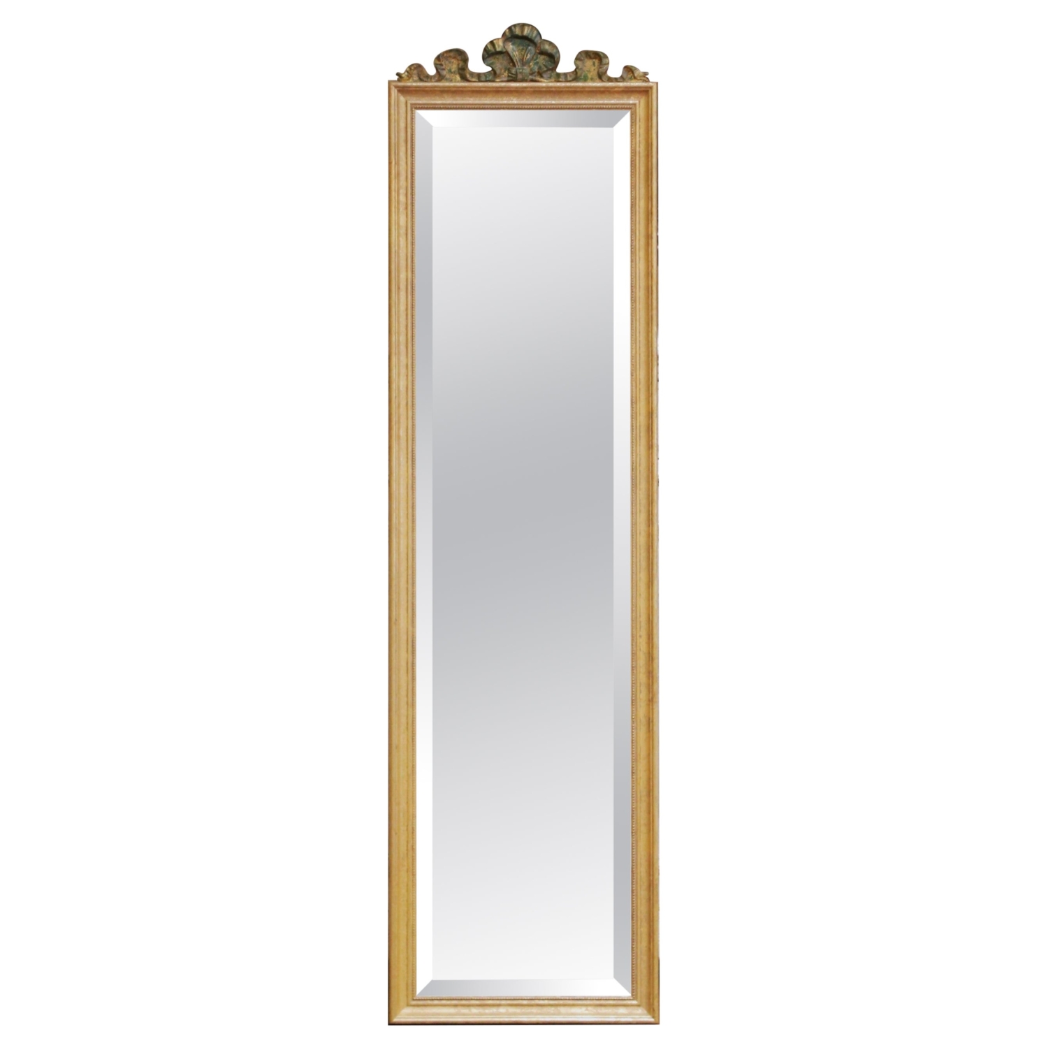 Crafted in the French taste circa 1980, this tall giltwood mirror reflects the refined elegance of Louis XVI design. Standing almost six feet in height, the piece offers strong vertical presence while maintaining a slim and versatile profile. The narrow rectangular frame is accented with delicate beaded molding along the inner edge, creating a clean architectural outline that feels both classic and balanced. The top is crowned with a carved shell and scrolling crest, finished in a softly distressed green and gold surface that adds subtle depth and decorative interest without overwhelming the form. The beveled mirror plate enhances light and dimension, giving the piece a crisp, polished appearance. Its proportions make it ideal as a floor mirror, placed between windows, in a hallway, dressing area, or closet where height is desired but floor space is limited. The mirror is in excellent condition commensurate with age and use. Dimensions: 15.5″W x 1.25″D x 58″H