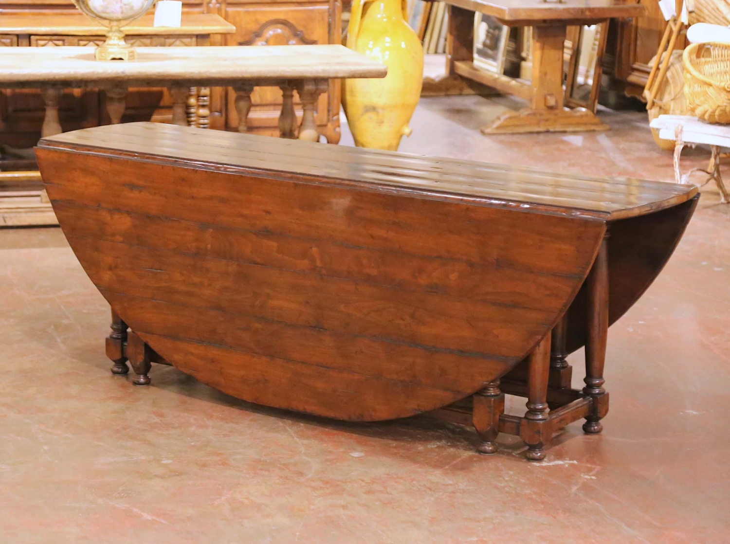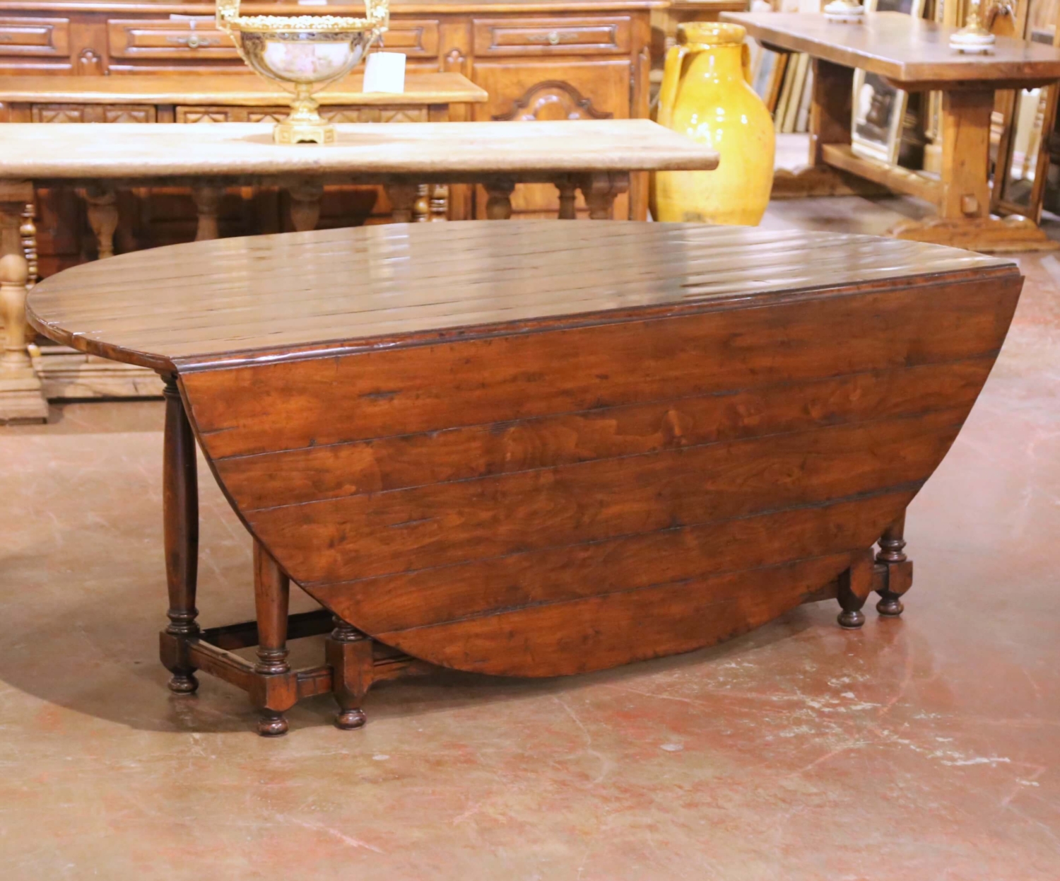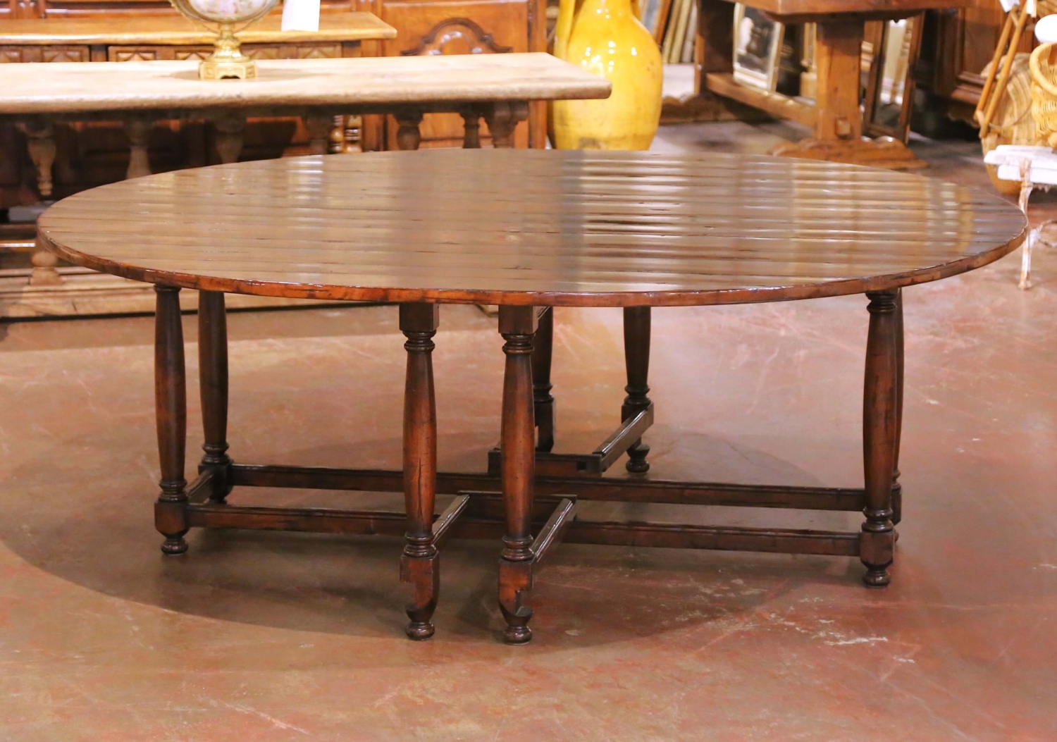 Place this substantial English Country style dining table at the center of a breakfast room or casual entertaining space. Crafted in America circa 1980 by Guy Chaddock, the oval drop-leaf table is built in solid oak and stands on six turned legs joined by a rectangular stretcher base, providing both stability and classic proportion. Measuring a full 7 feet in length, the table opens with two demi-lune leaves to create a generous oval surface that comfortably seats 10 to 12 guests, making it ideal for holidays and larger gatherings. When lowered, it reduces to a narrow profile and can be placed behind a sofa as a large console or set against a wall, offering exceptional versatility for everyday living. The plank top showcases the natural grain movement of the oak, enhanced by a warm, rich finish that reflects Guy Chaddock’s reputation for producing high-quality American furniture inspired by traditional European forms. The gate-leg table is in excellent vintage condition commensurate with age and use and retains a handsome, well-preserved finish. Dimensions: opened 84″W x 76″D x 30″H closed: 84″W x 23″D x 30″H