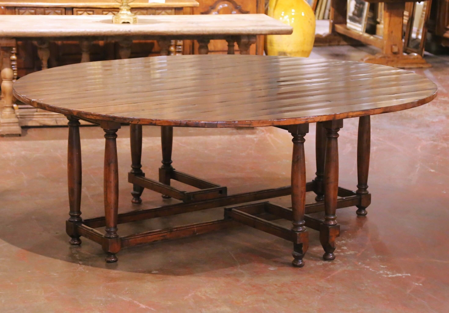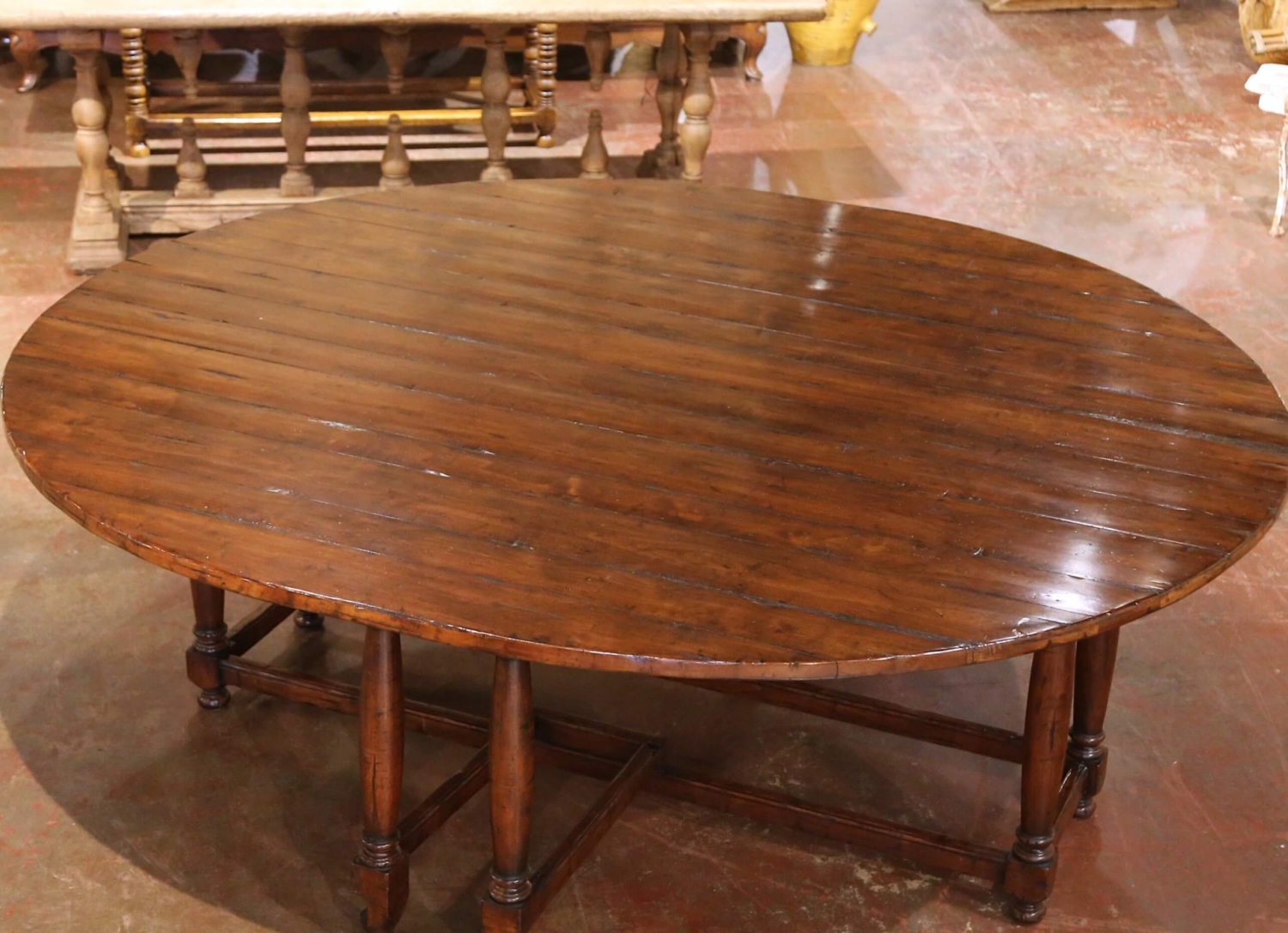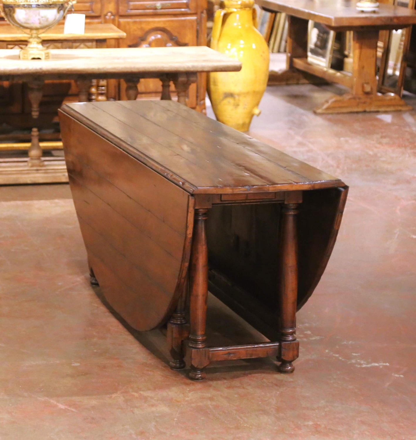Place this substantial English Country style dining table at the center of a breakfast room or casual entertaining space. Crafted in America circa 1980 by Guy Chaddock, the oval drop-leaf table is built in solid oak and stands on six turned legs joined by a rectangular stretcher base, providing both stability and classic proportion. Measuring a full 7 feet in length, the table opens with two demi-lune leaves to create a generous oval surface that comfortably seats 10 to 12 guests, making it ideal for holidays and larger gatherings. When lowered, it reduces to a narrow profile and can be placed behind a sofa as a large console or set against a wall, offering exceptional versatility for everyday living. The plank top showcases the natural grain movement of the oak, enhanced by a warm, rich finish that reflects Guy Chaddock’s reputation for producing high-quality American furniture inspired by traditional European forms. The gate-leg table is in excellent vintage condition commensurate with age and use and retains a handsome, well-preserved finish. Dimensions: opened 84″W x 76″D x 30″H closed: 84″W x 23″D x 30″H