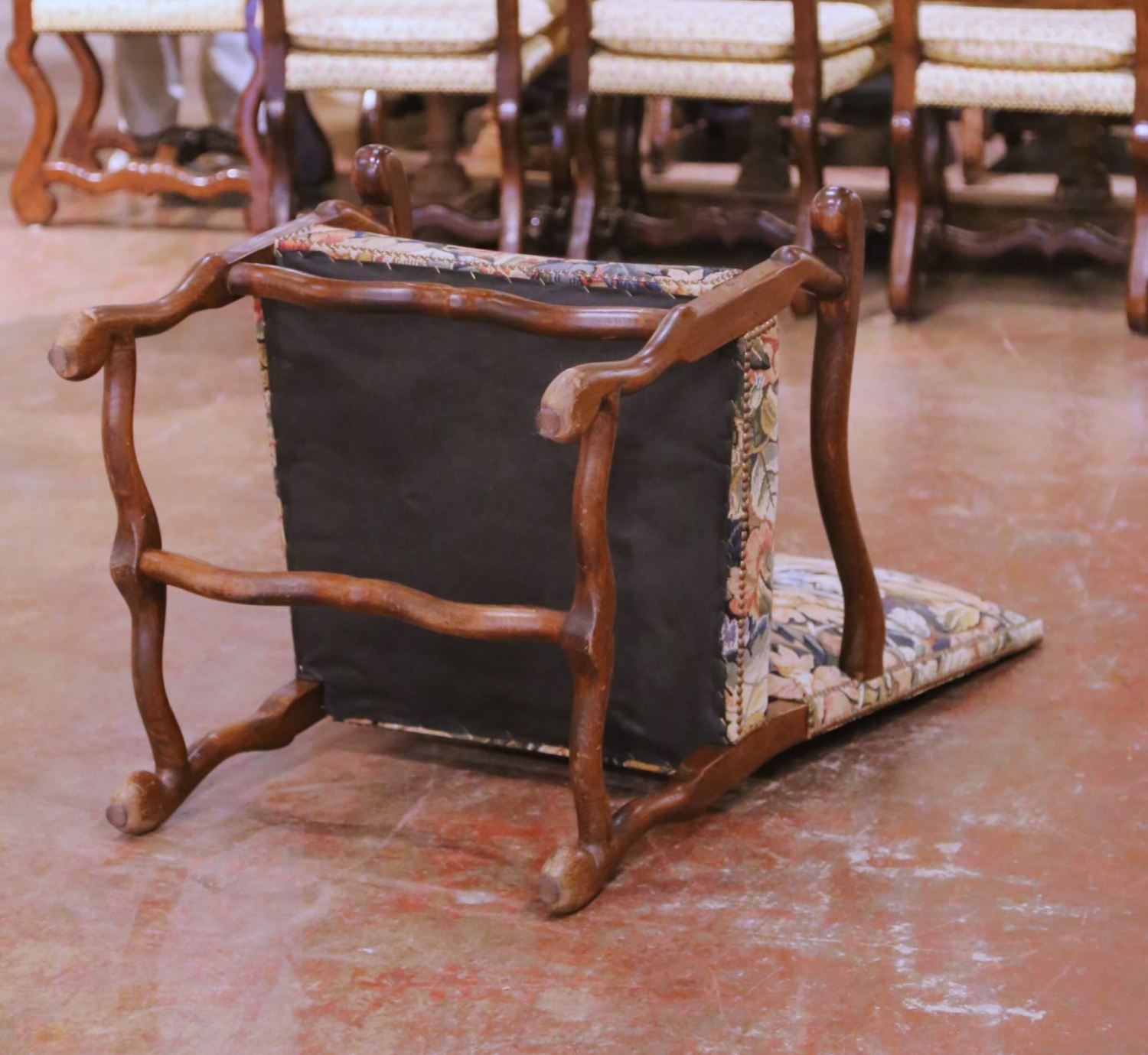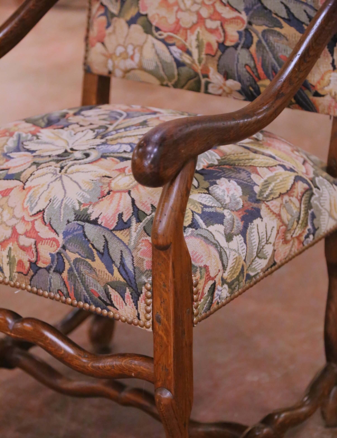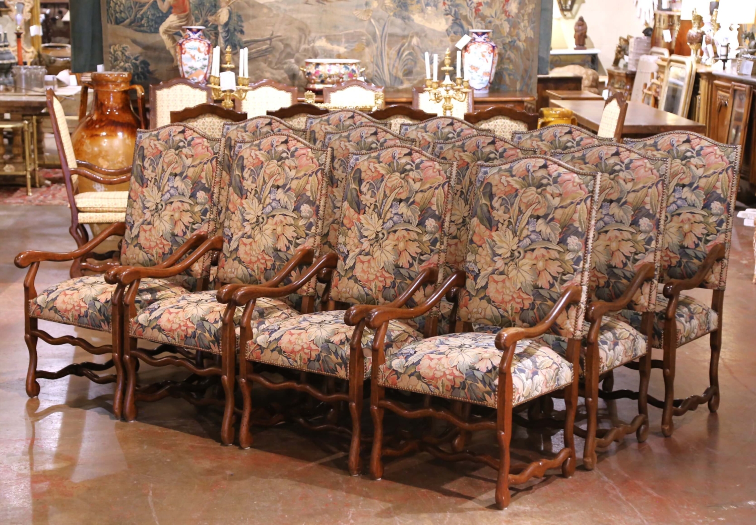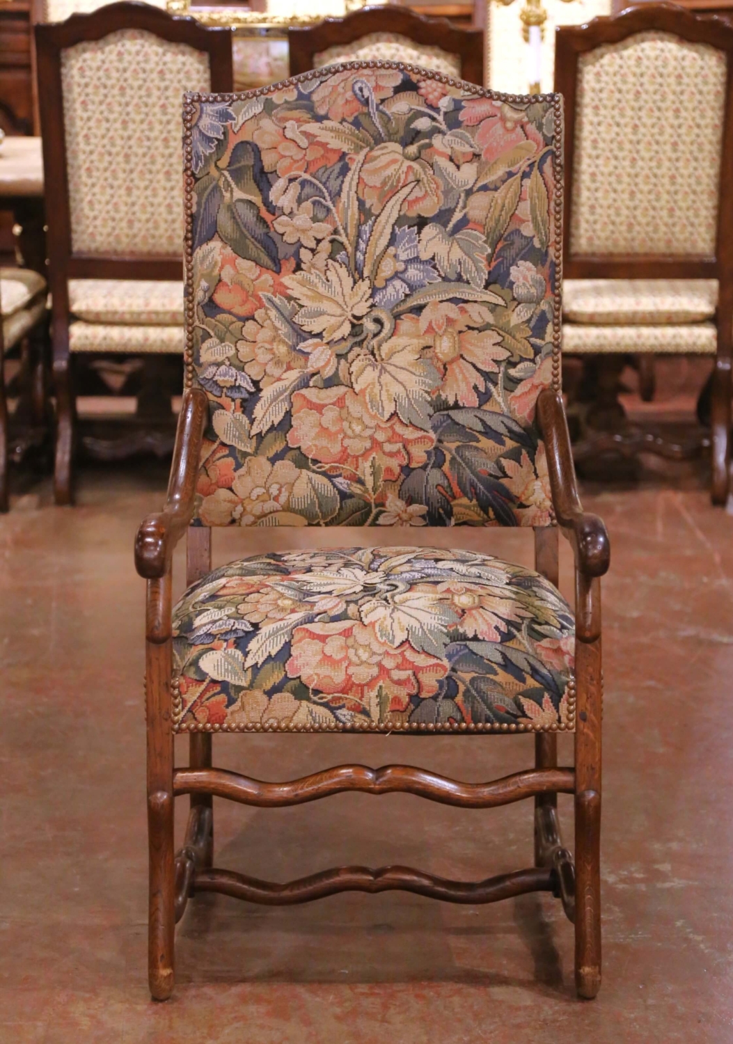 This impressive suite of twelve Louis XIII style dining armchairs was crafted circa 1980. The chairs reflect the bold, architectural character associated with 17th century French design, featuring tall rectangular backs outlined with large brass nailhead trim and substantial scrolled arms with rounded handholds. The solid oak frames display a warm, medium-toned finish with visible grain throughout. Each chair stands on sturdy legs joined by traditional H-form stretchers with a shaped front stretcher, reinforcing both structure and period-inspired styling. The proportions are generous and comfortable, making them ideal for a grand dining table or conference setting. The seats and backs are upholstered in a richly woven tapestry fabric decorated with large-scale floral and foliate motifs in muted tones of blue, sage, rose, and cream. The upholstery complements the strong oak frame and enhances the classic French aesthetic. The set is in excellent condition commensurate with age and use. The frames are sturdy, and the upholstery remains well preserved. A rare opportunity to acquire a complete set of twelve matching Louis XIII style armchairs, offering immediate impact and cohesive design for a large dining room. Dimensions: 24.5″W x 27″D x 47.5″H Seat: 20″ H