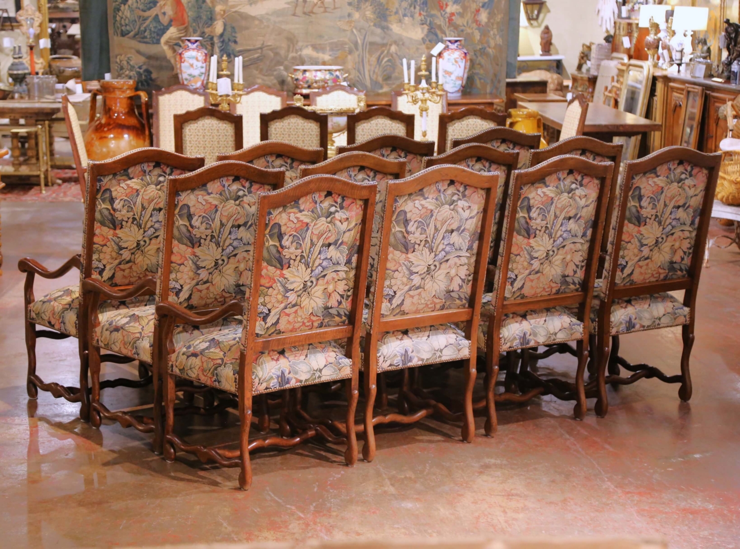 Louis XIII Style Oak Dining Room Armchairs with Tapestry Upholstery, Set of 12