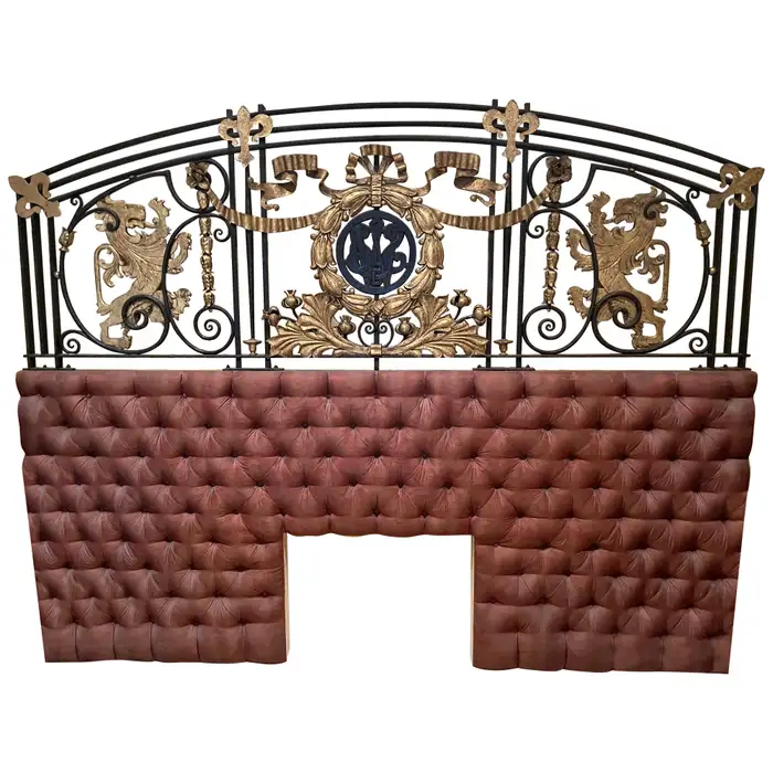 Decorate a master bedroom with this exquisite antique oversized headboard. Crafted in France circa 1780 out of a retired iron and bronze gate or balcony, the Louis XVI-style frame features two main parts; the top is arched, with bronze Fleur-de-Lys, ribbon, and acanthus leaf decor. A center medallion is crafted of forged iron and surrounded by bronze blue bell flowers. The bottom of the headboard, which is thickly padded and comfortably tufted with red upholstered fabric, allowing comfortable reclining. Weighing over 200 lbs and measuring wider than a California King, this majestic piece, in excellent condition, and would make a grand statement in any master or guest bedroom. A true one of a kind! (The piece is at the client’s house, and not visible in our showroom). Measures: 120.5″ W x 94″ H.