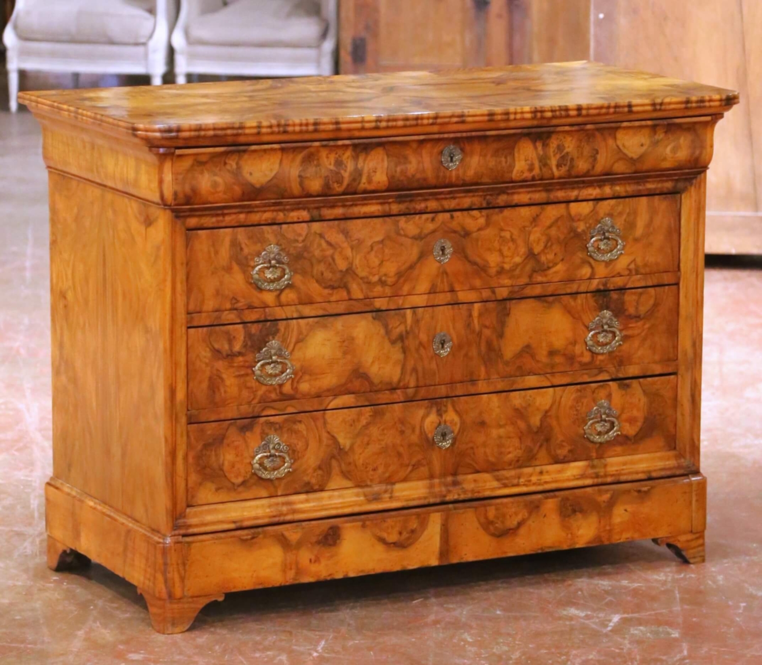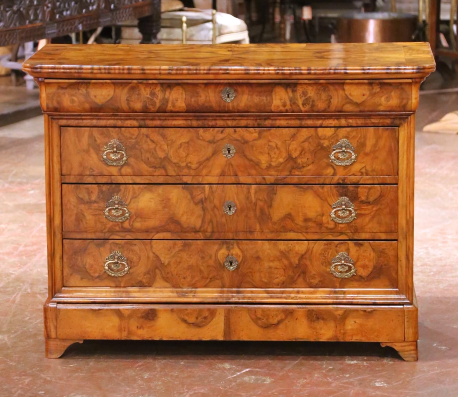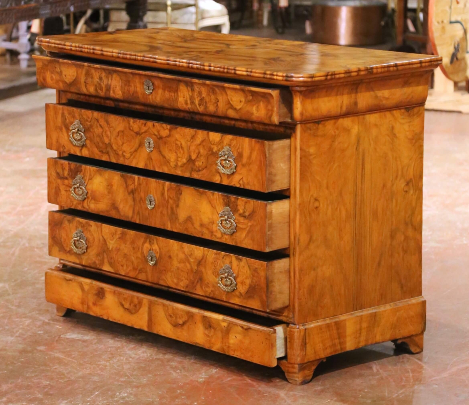 This handsome Louis Philippe antique chest of drawers was crafted in walnut circa 1860, and features richly figured burl walnut throughout the drawer fronts. The rectangular case is fitted with five drawers, including a discreet lower drawer integrated into the base molding, a thoughtful and refined feature that enhances both functionality and visual balance. Each drawer is adorned with decorative brass handles and matching escutcheons, complementing the warm tones of the walnut and adding subtle ornamentation. The chest showcases wonderful rick patinated walnut finish with a striking visual pattern across the façade. In excellent condition with wear commensurate with age and use, this antique piece reflects the quality craftsmanship and understated elegance characteristic of Louis Philippe furniture from the period. Versatile in scale and presentation, this antique French chest would serve beautifully in a bedroom, dressing room, or entry hall, offering generous storage and timeless European character. Measures: 50″ W x 23.75″ D x 36.75″ H.