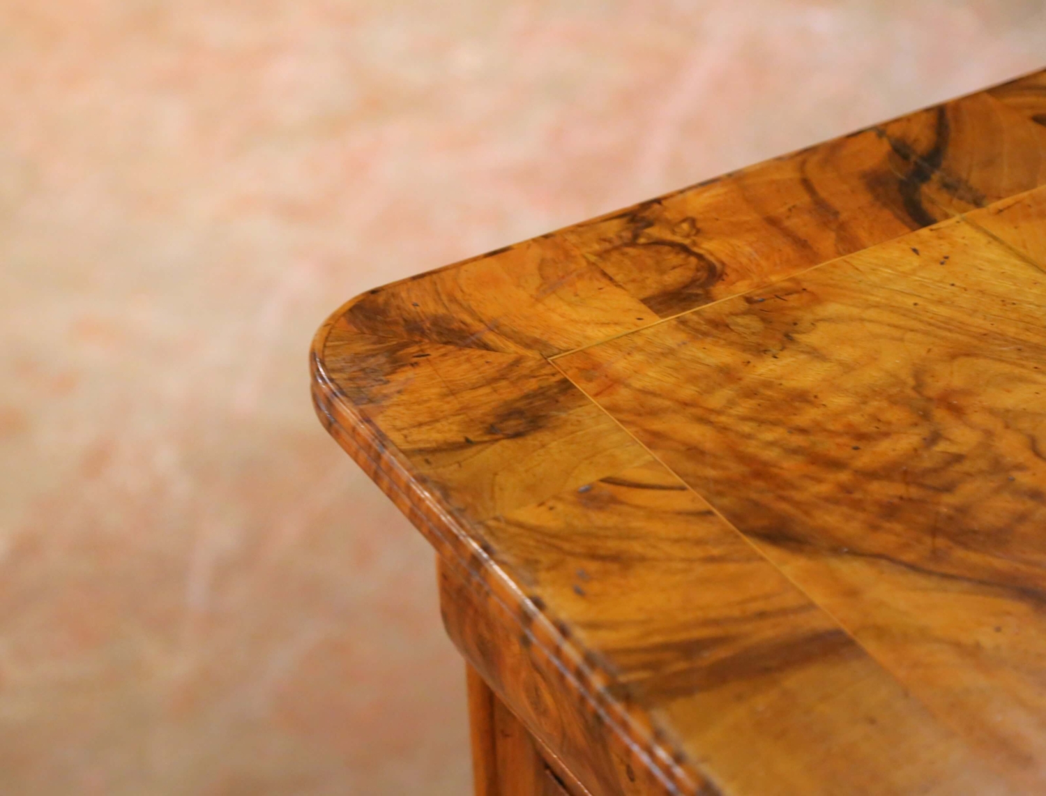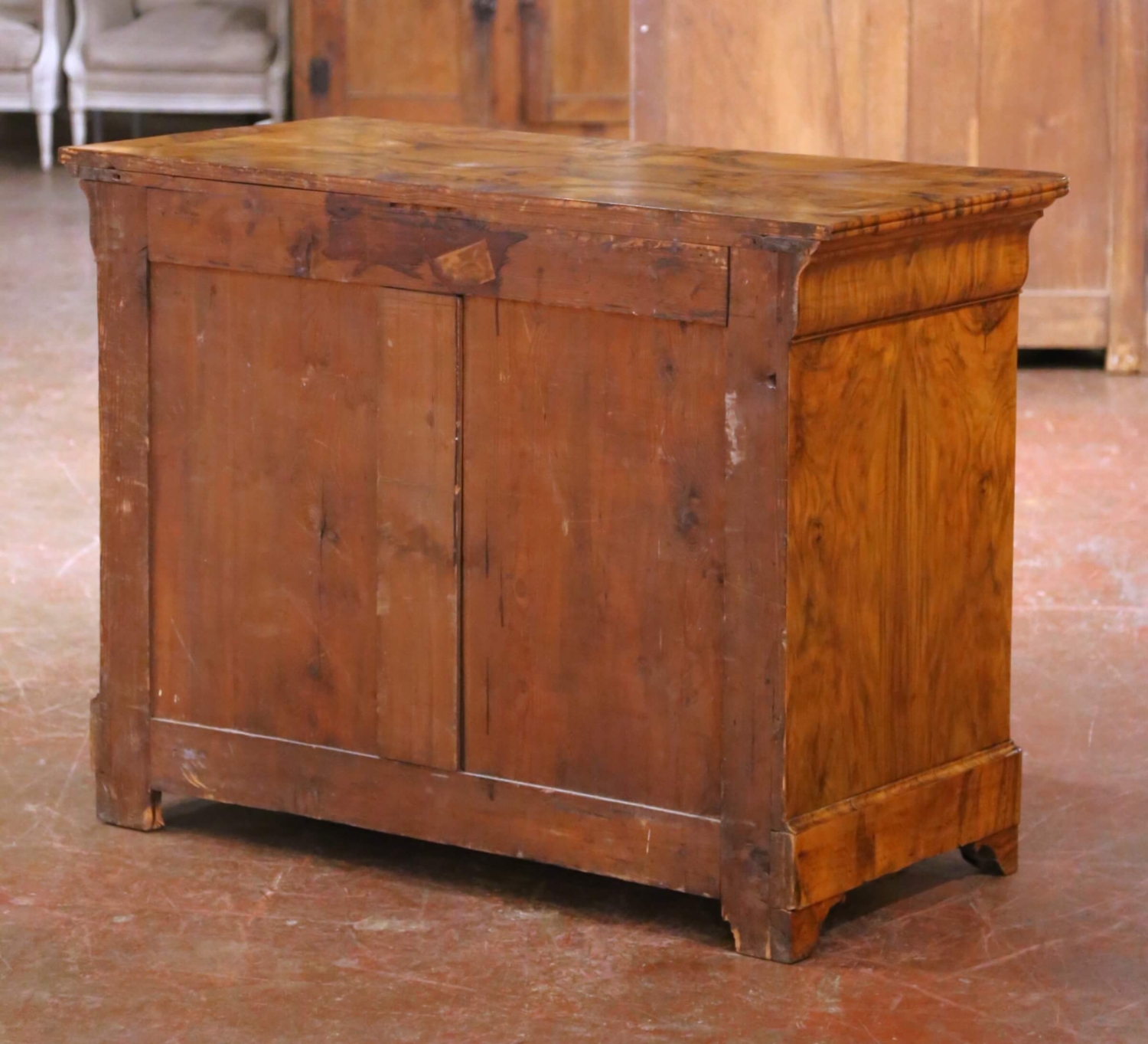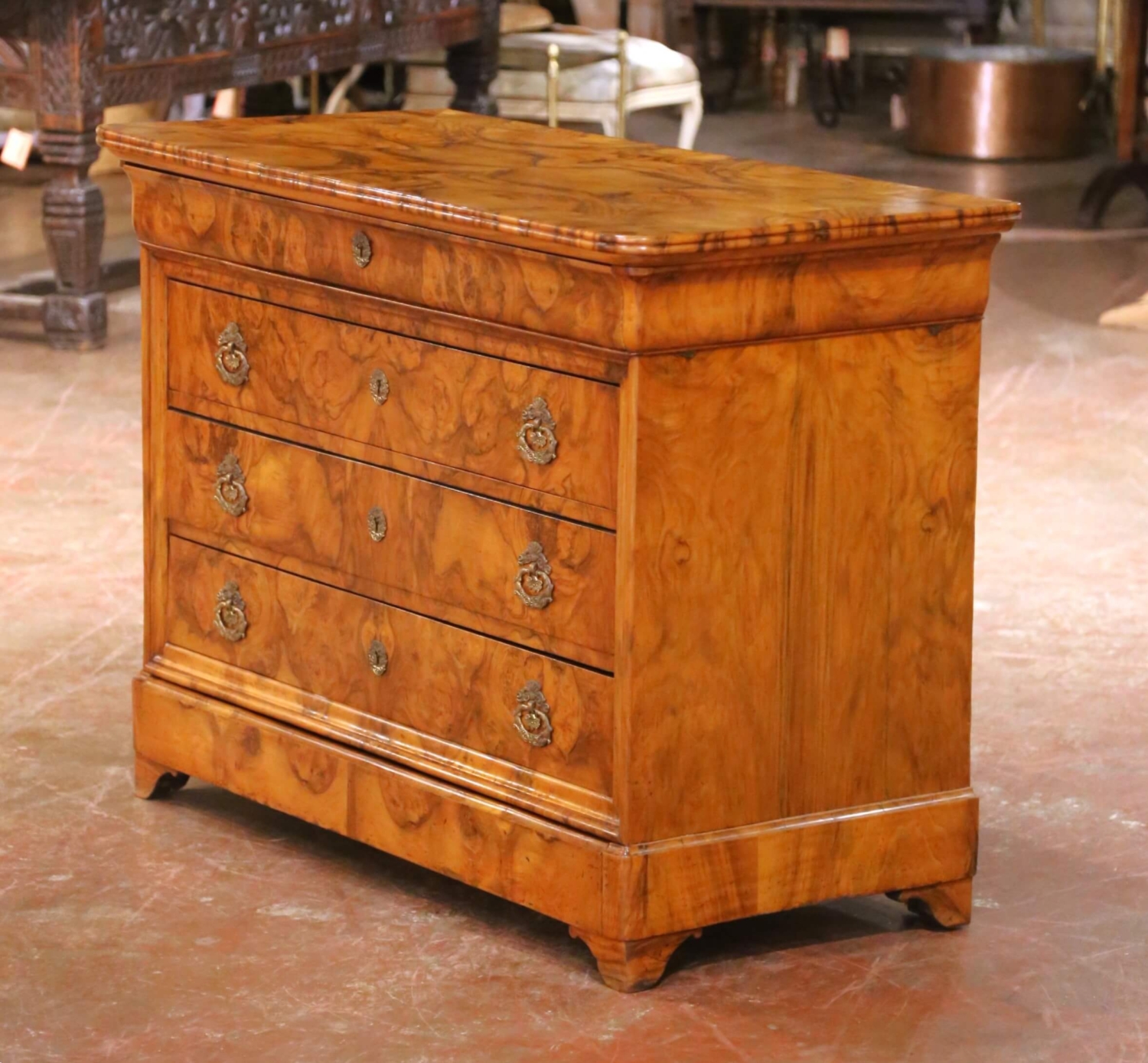 This handsome Louis Philippe antique chest of drawers was crafted in walnut circa 1860, and features richly figured burl walnut throughout the drawer fronts. The rectangular case is fitted with five drawers, including a discreet lower drawer integrated into the base molding, a thoughtful and refined feature that enhances both functionality and visual balance. Each drawer is adorned with decorative brass handles and matching escutcheons, complementing the warm tones of the walnut and adding subtle ornamentation. The chest showcases wonderful rick patinated walnut finish with a striking visual pattern across the façade. In excellent condition with wear commensurate with age and use, this antique piece reflects the quality craftsmanship and understated elegance characteristic of Louis Philippe furniture from the period. Versatile in scale and presentation, this antique French chest would serve beautifully in a bedroom, dressing room, or entry hall, offering generous storage and timeless European character. Measures: 50″ W x 23.75″ D x 36.75″ H.