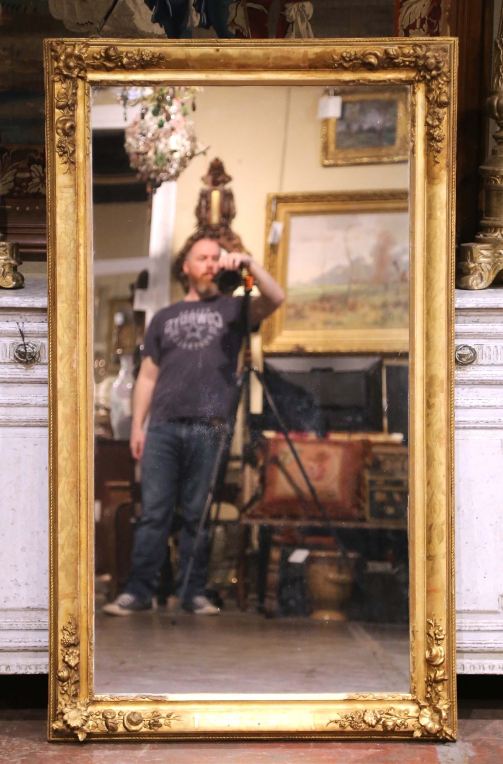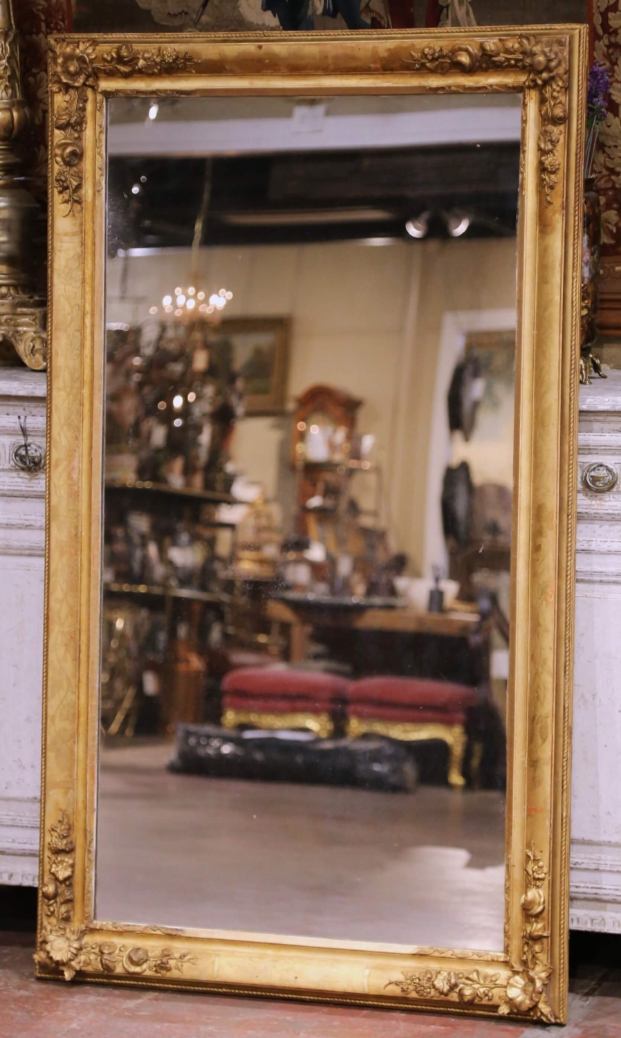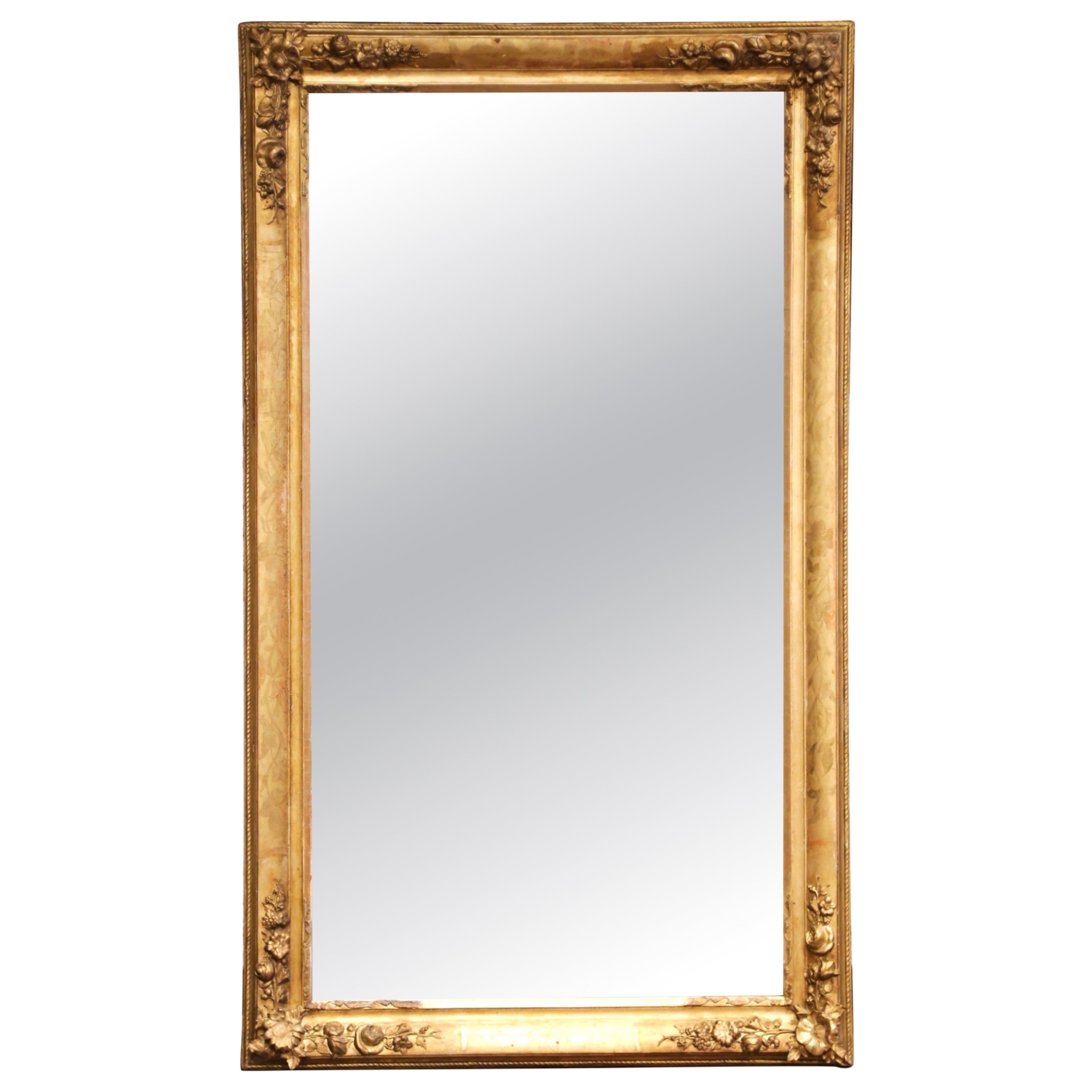 Elevate a room with this elegant antique wall mirror crafted in France, circa 1860. The tall rectangular form is set within a finely carved giltwood frame, decorated with delicate floral and foliate motifs throughout. The corners are richly embellished with sculptural bouquets, while the inner molding features subtle engraved detailing, adding depth and refinement to the composition. The clean symmetry and restrained ornament reflect the Louis XVI aesthetic, offering a refined balance between structure and decoration. The original mercury glass retains a soft, slightly mottled reflection that enhances its authenticity and period character, while the giltwood frame displays a warm, time-softened patina. Versatile and almost five and 1/2 feet in height, this mirror can be displayed either vertically or horizontally, making it ideal over a mantel, console, or commode, or mounted in an entry or dressing area as a floor mirror, to bring light and visual interest to the space. The back retains its traditional wood panel construction consistent with the period. The large mirror is in excellent condition commensurate with age and use. Dimensions: 38.25″W x 3″D x 65.25″H