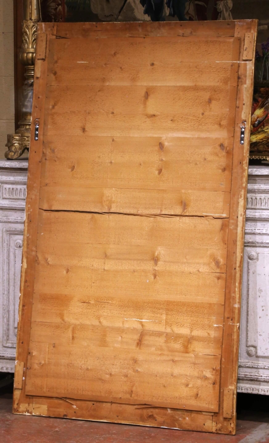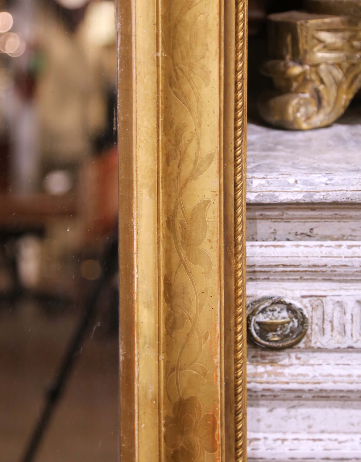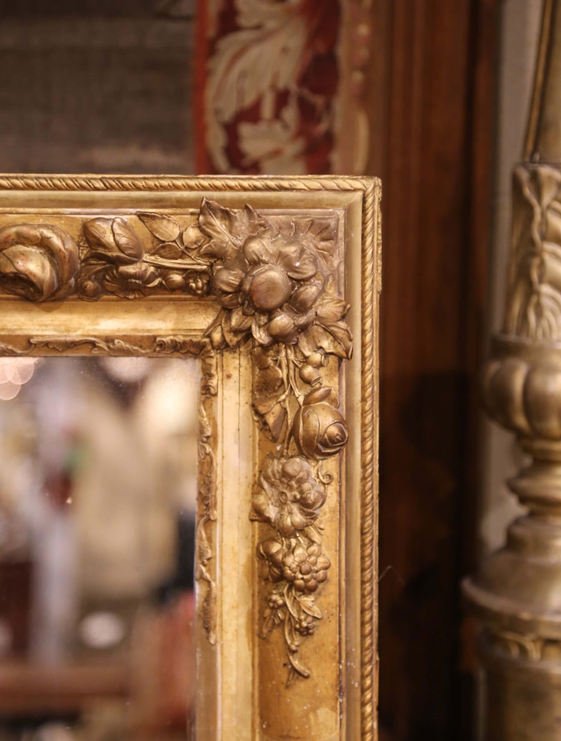 Elevate a room with this elegant antique wall mirror crafted in France, circa 1860. The tall rectangular form is set within a finely carved giltwood frame, decorated with delicate floral and foliate motifs throughout. The corners are richly embellished with sculptural bouquets, while the inner molding features subtle engraved detailing, adding depth and refinement to the composition. The clean symmetry and restrained ornament reflect the Louis XVI aesthetic, offering a refined balance between structure and decoration. The original mercury glass retains a soft, slightly mottled reflection that enhances its authenticity and period character, while the giltwood frame displays a warm, time-softened patina. Versatile and almost five and 1/2 feet in height, this mirror can be displayed either vertically or horizontally, making it ideal over a mantel, console, or commode, or mounted in an entry or dressing area as a floor mirror, to bring light and visual interest to the space. The back retains its traditional wood panel construction consistent with the period. The large mirror is in excellent condition commensurate with age and use. Dimensions: 38.25″W x 3″D x 65.25″H