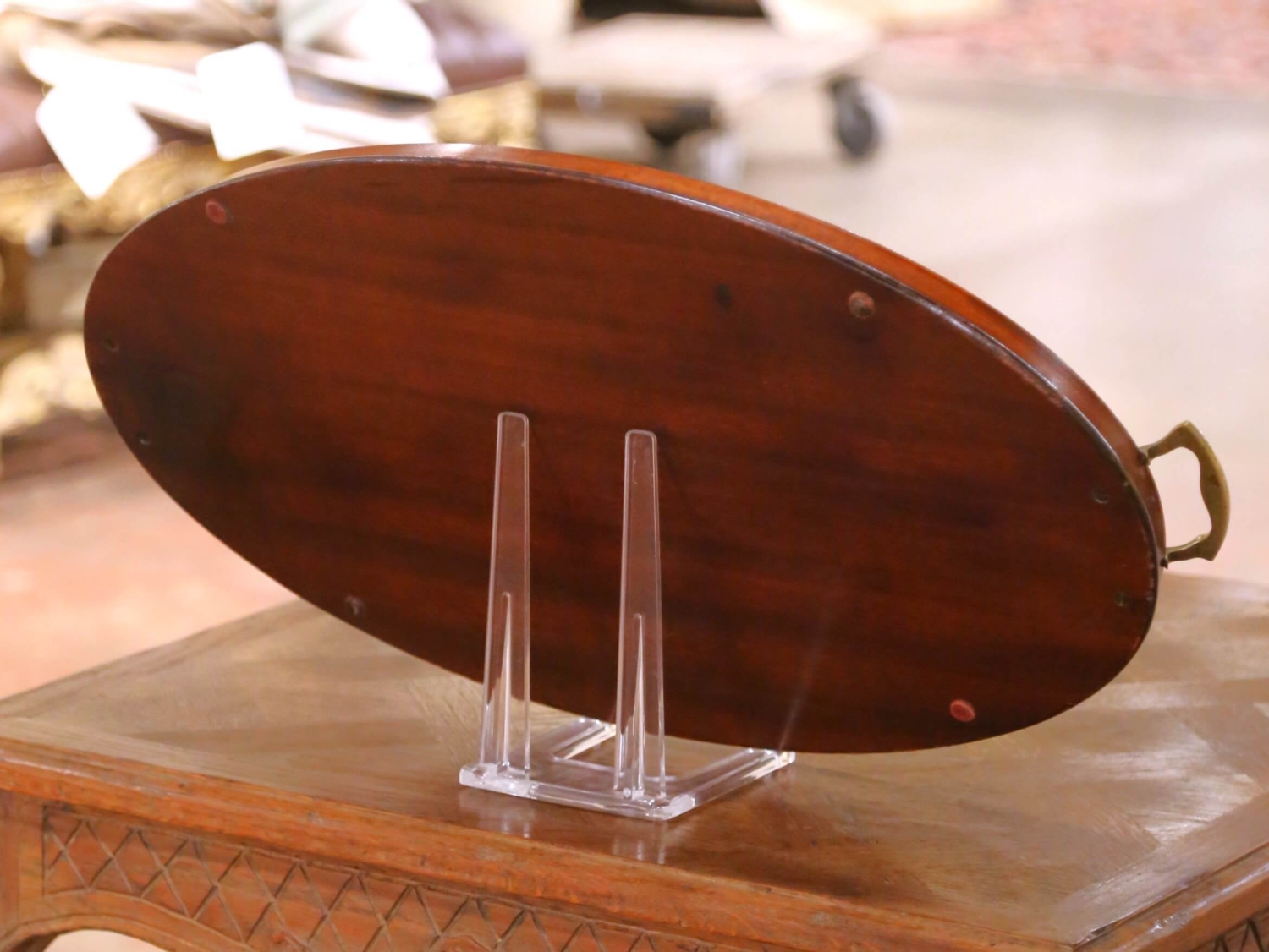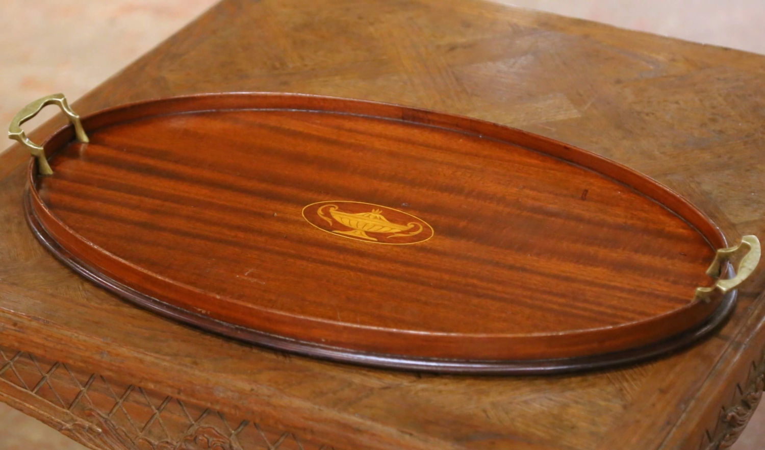 Embellish a coffee table or ottoman with this elegant mid-century English serving tray. Crafted in England circa 1960, the oval tray is constructed of finely figured burl walnut and features a raised, gently scalloped gallery edge that follows the graceful oval form. The surface is beautifully decorated with a central marquetry and inlaid medallion depicting a classical shell motif, executed in contrasting woods and framed within a delicate oval reserve. The tray is fitted with two original brass handles at each end, showcasing softly sculpted forms and a warm, naturally aged patina that complements the rich walnut surface. The underside is finished with a green felt lining, offering protection and stability during use. The piece is in excellent condition commensurate with age and use, and displays a rich, warm walnut patina with light surface wear consistent with mid-20th-century craftsmanship. Versatile and decorative, this refined tray may be used for serving, as a coffee table accent, or as an elegant display piece atop a console or bar. Dimensions: 26″ W x 14″ D x 1.5″ H